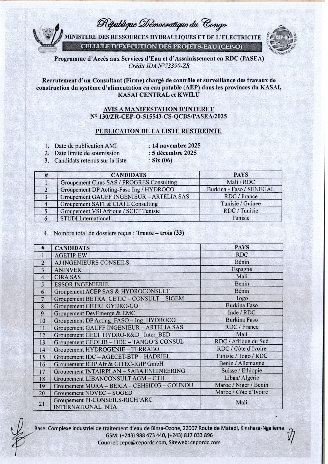 Liste Restreinte relative au Recrutement d’un Consultant (Firme) chargé de contrôle et surveillance des travaux de construction du système d’alimentation en eau potable (AEP) dans les provinces du KASAI, KASAI CENTRAL et KWILU