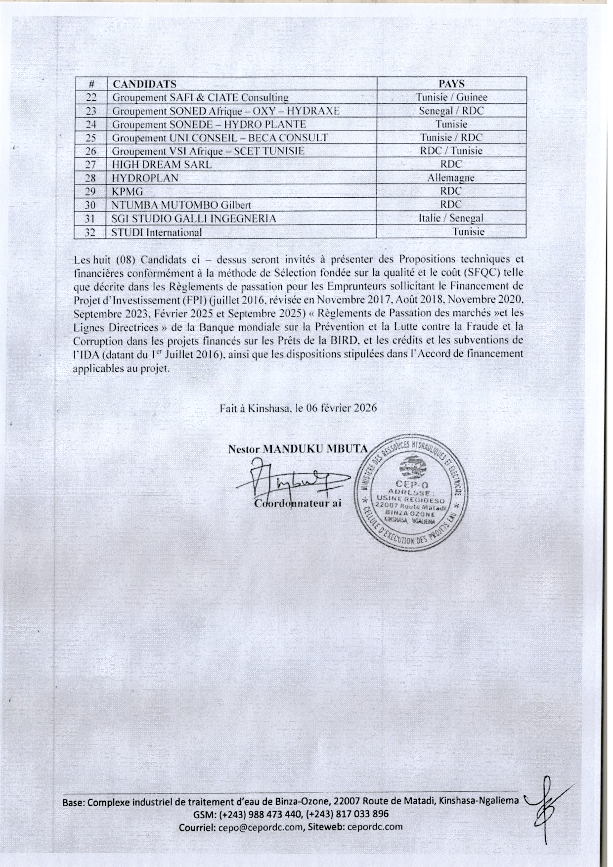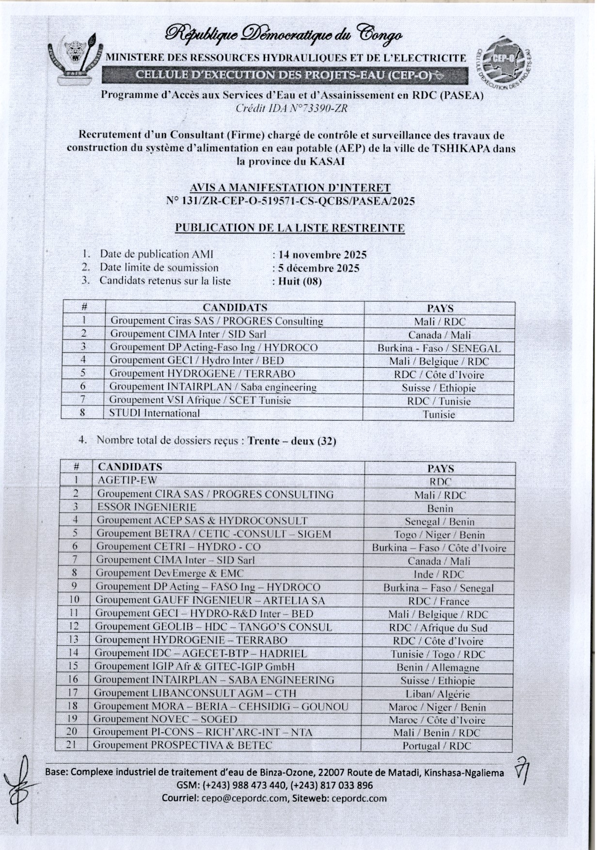 Recrutement d’un Consultant (Firme) chargé de contrôle et surveillance des travaux de construction du système d’alimentation en eau potable (AEP) de la ville de TSHIKAPA dans la province du KASAI