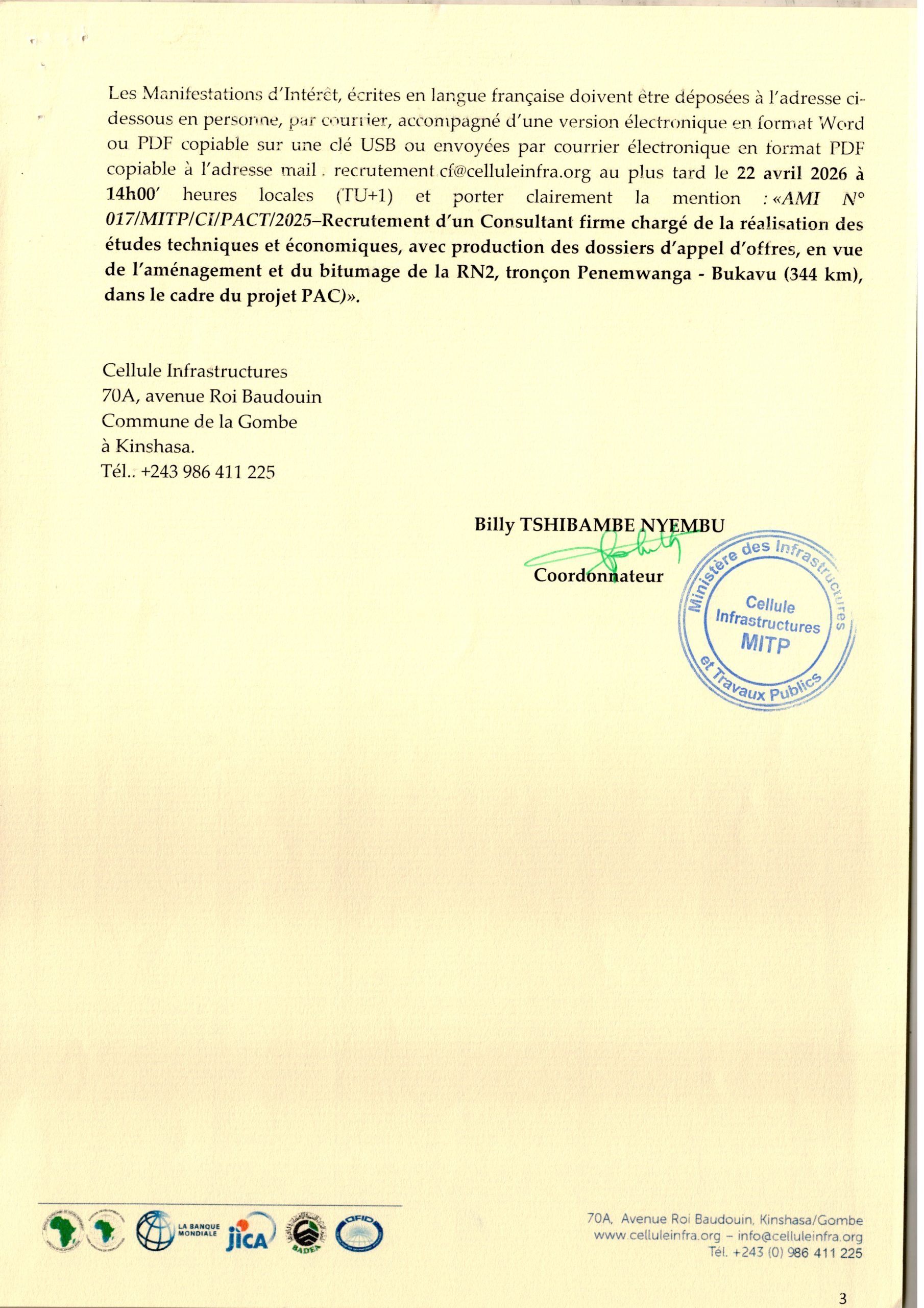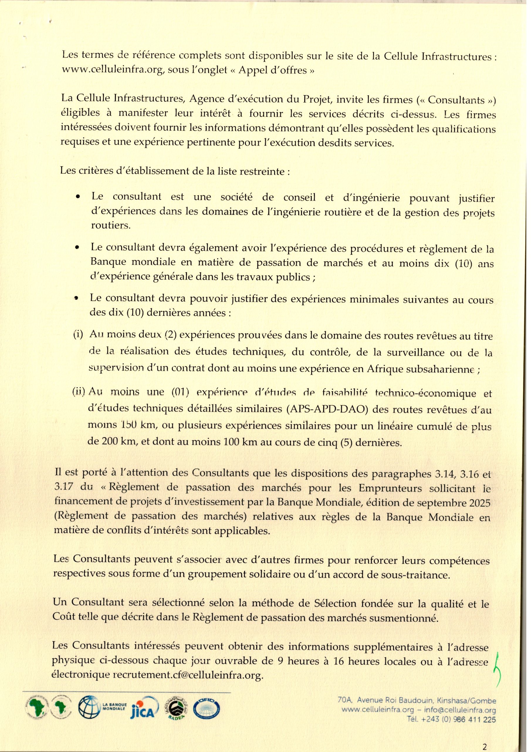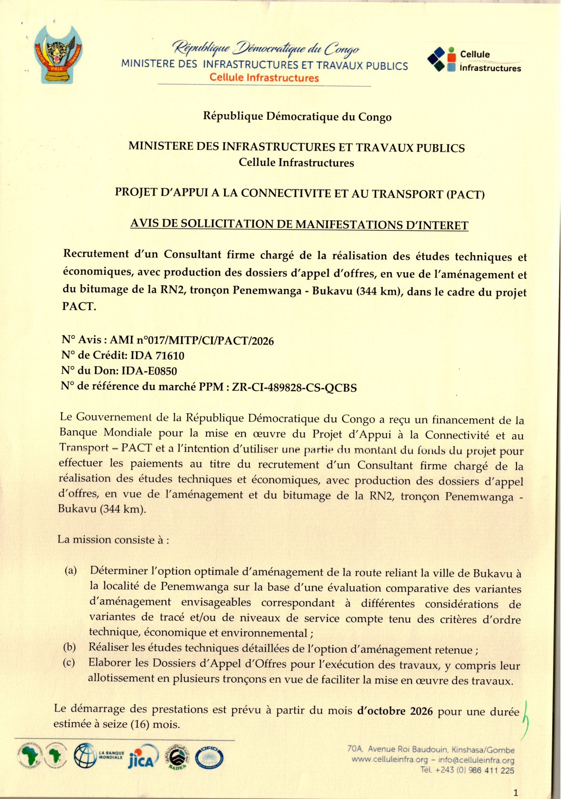 Recrutement d’un consultant firme chargé de la réalisation des études techniques et économiques , avec production des dossiers d’appel d’offres, en vue de l’aménagement et du bitumage de la RN2, tronçons Penemwanga – Bukavu (344 km), dans le cadre du projet PACT.