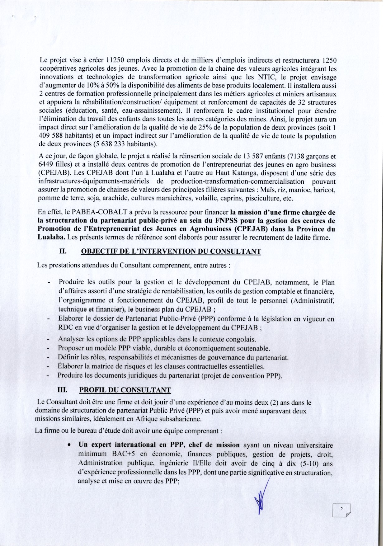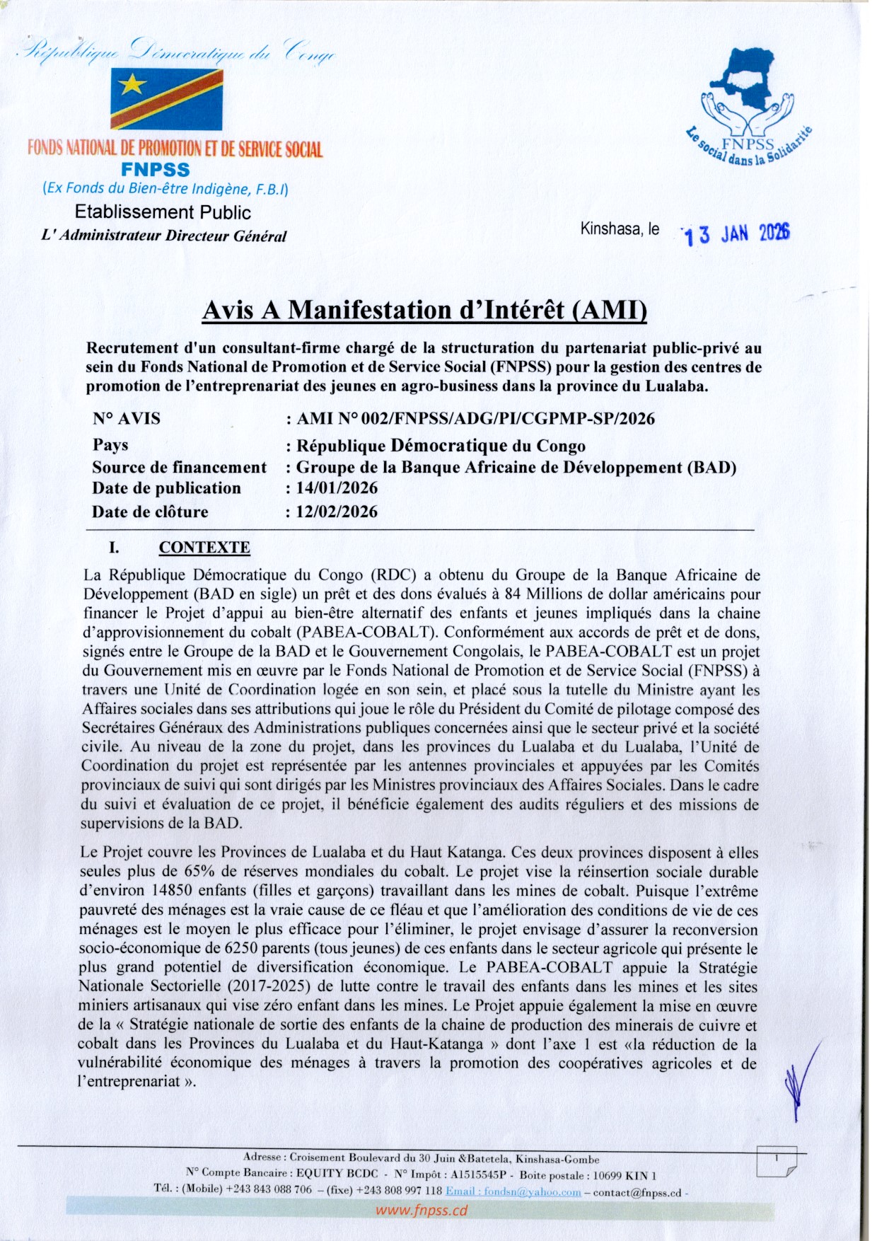 Recrutement d’un consultant-firme chargé de la structuration du partenariat public-privé au sein du Fonds National de Promotion et de Service Social (FNPSS) pour la gestion des Centres de promotion de l’entreprenariat des jeunes en agro-business dans la province du Lualaba
