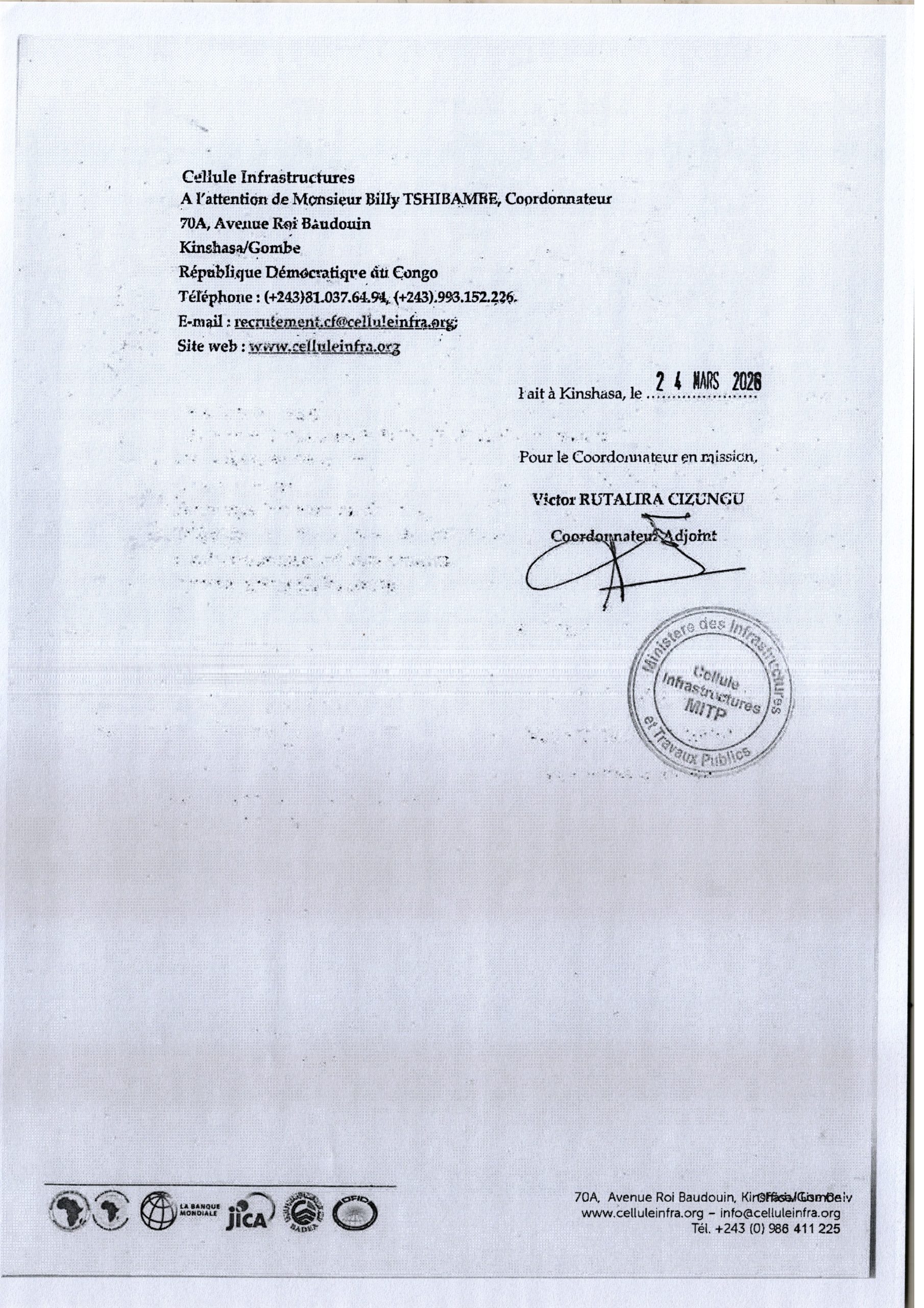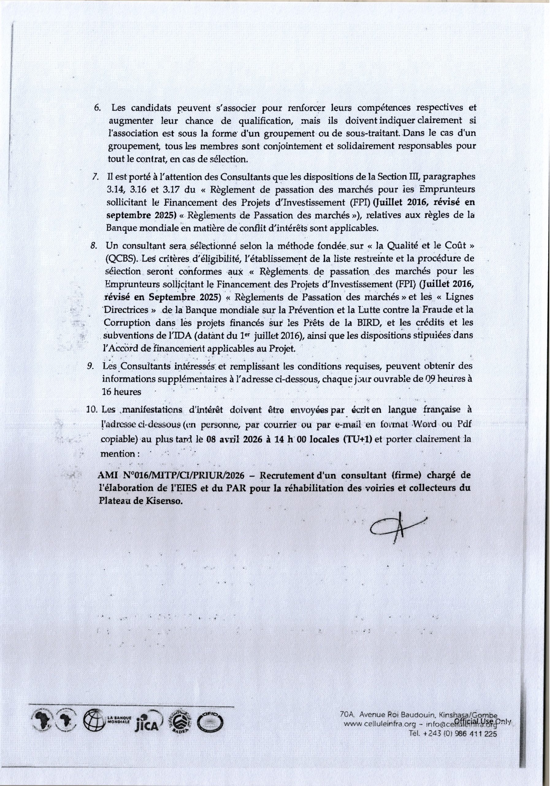 Recrutement d’un consultant (firme) chargé de l’élaboration de l’EIES et du PAR pour la réhabilitation des voiries et collecteurs du plateau de Kinseso.