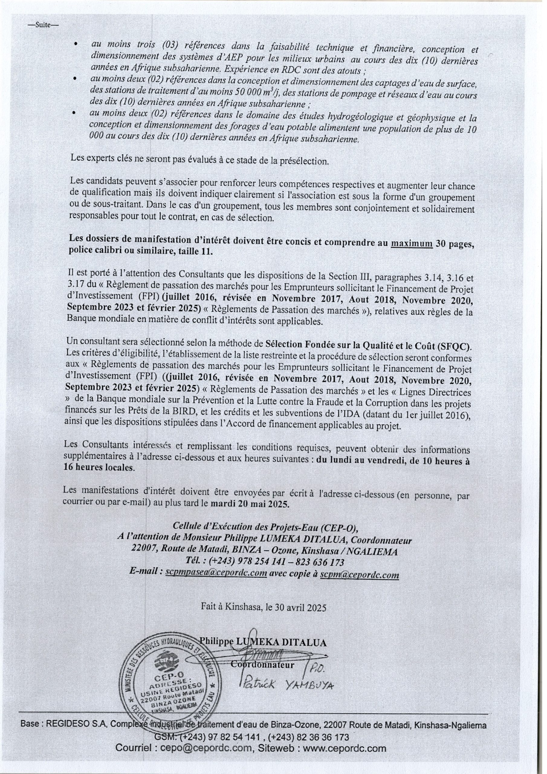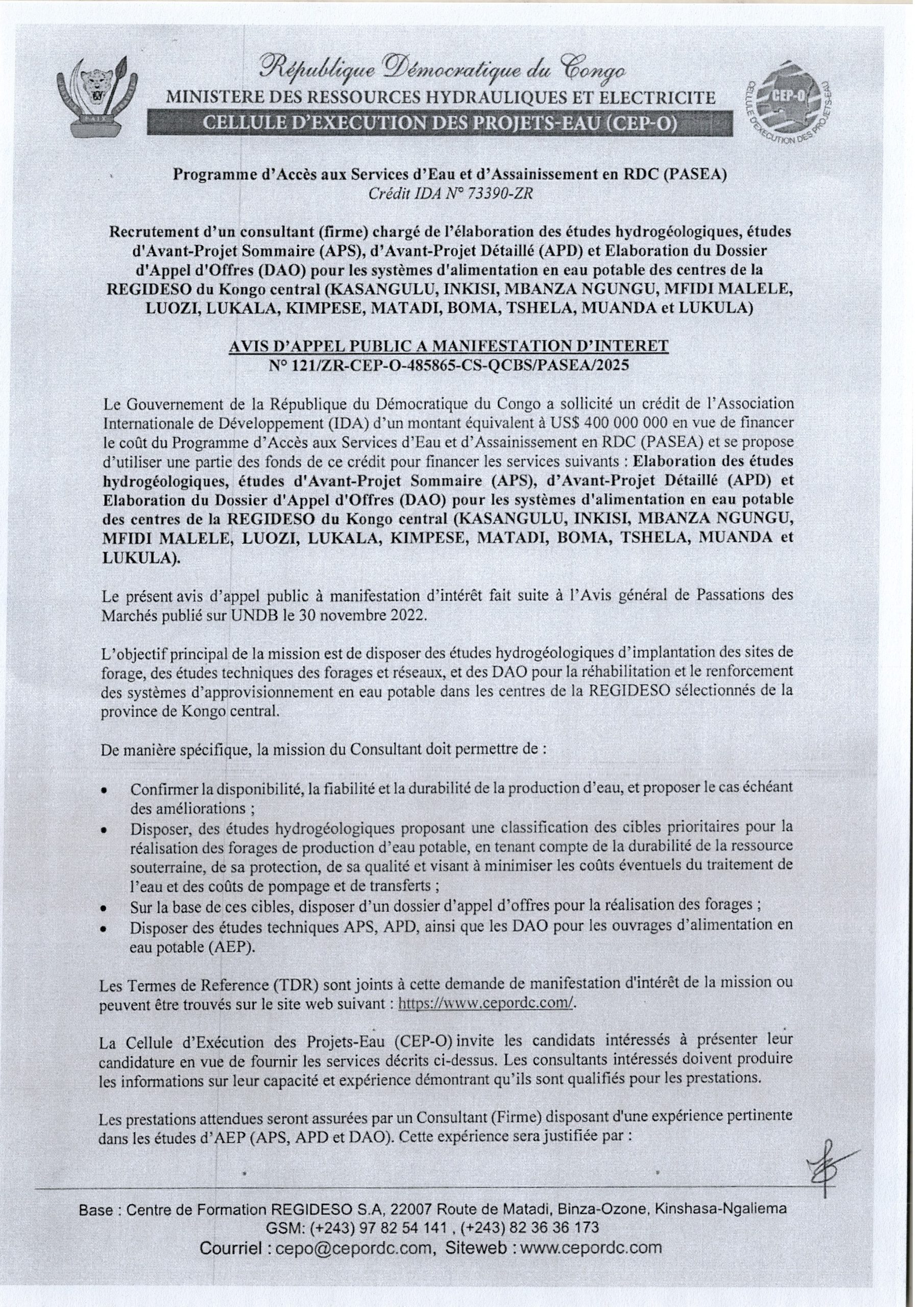 Recrutement d’un consultant (firme ) chargé de l’élaboration des études hydrogéologiques, études d’Avant-Projet Sommaire (APS), d’Avant-Projet Détaillé (APD) et Élaboration du Dossier d’Appel d’Offres (DAO) pour les systèmes d’alimentation en eau potable des centres de la REGIDESO du Kongo central (KASANGULU, INKISI, MBANZA NGUNGU, MFIDI MALELE, LUOZI, LUKALA, KIMPESE, MATADI, BOMA, TSHELA, MUANDA et LUKALA)