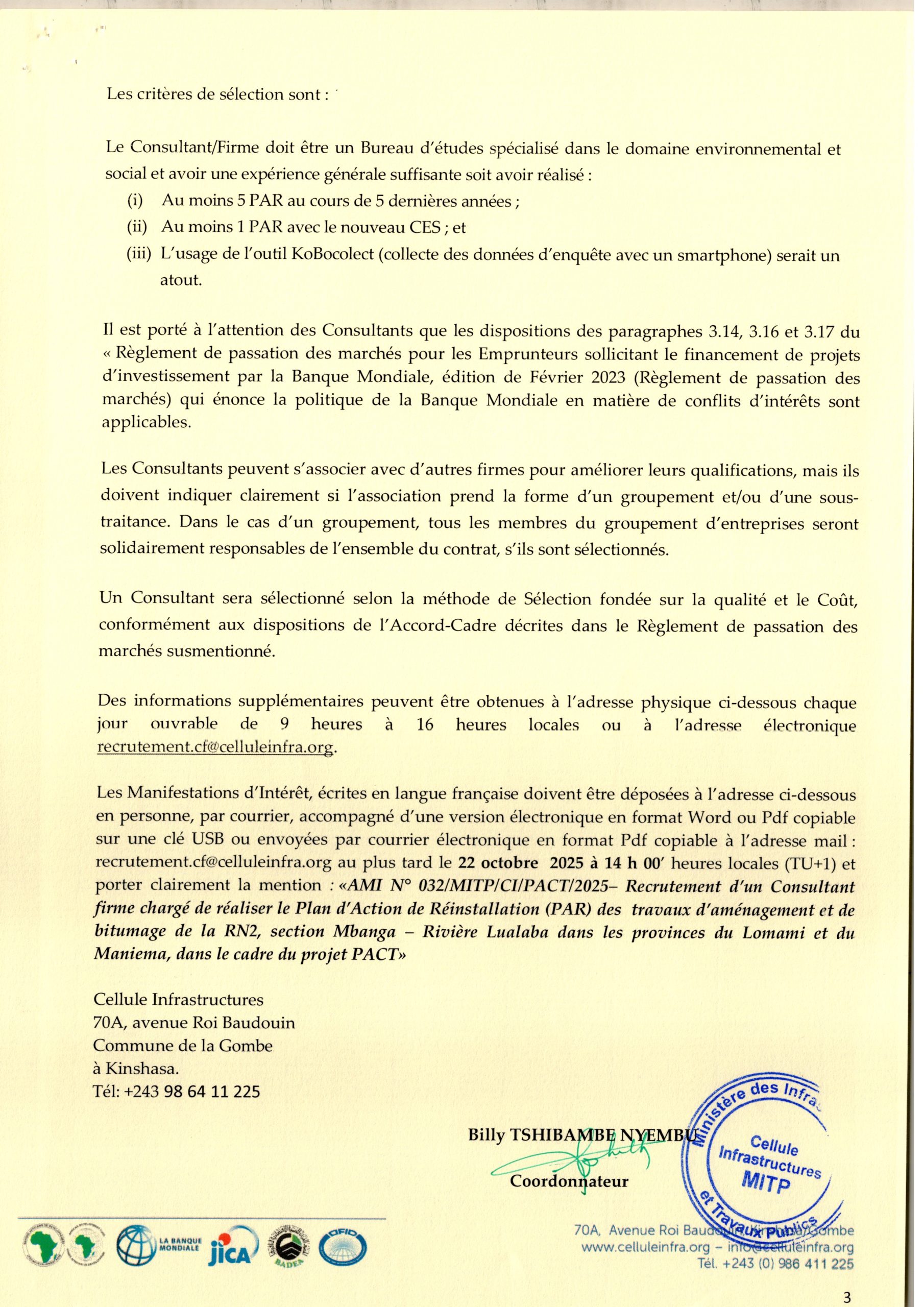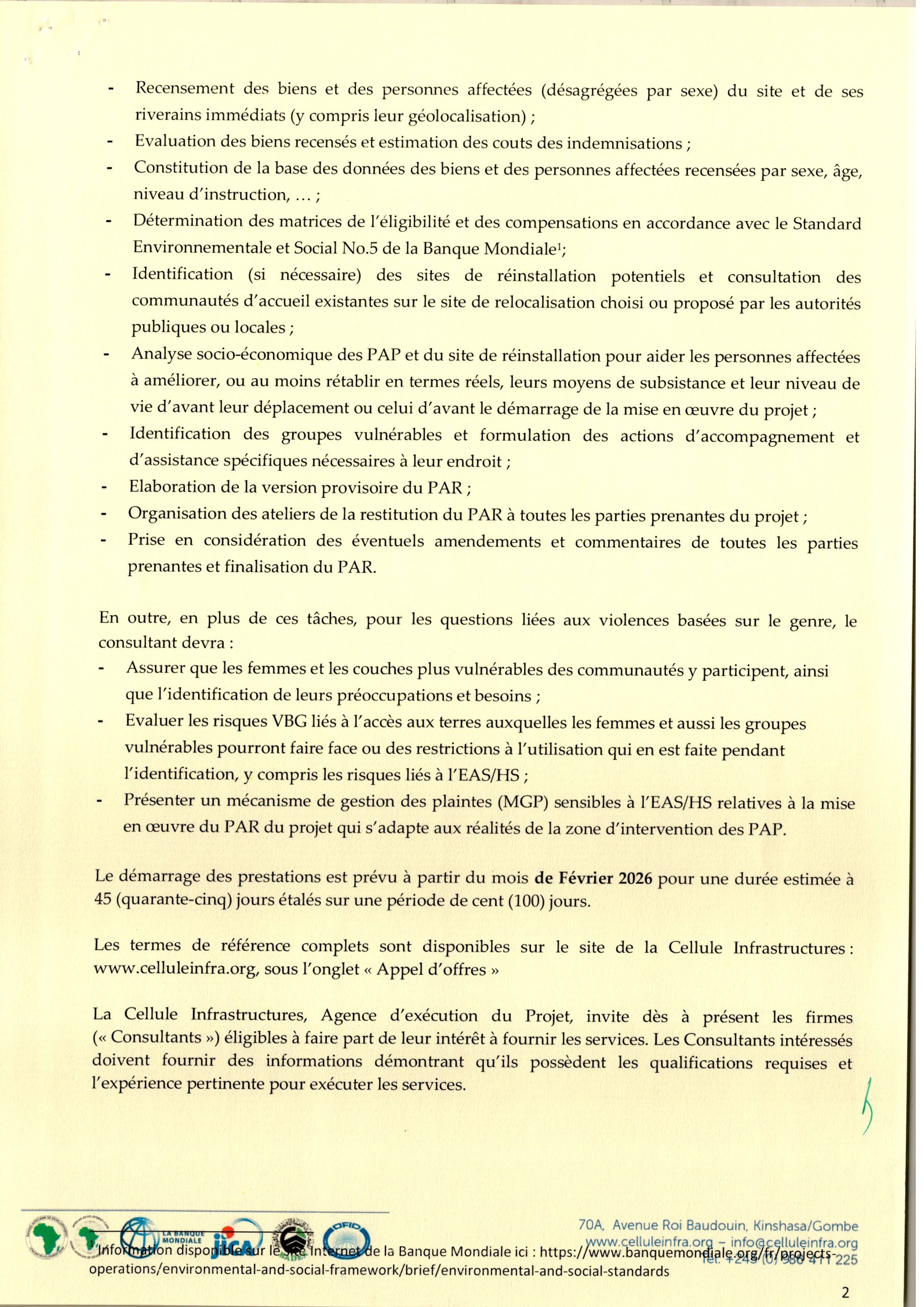 Recrutement d’un consultant firme chargé de réaliser le plan d’action de Réinstallation (PAR) des travaux d’aménagement…