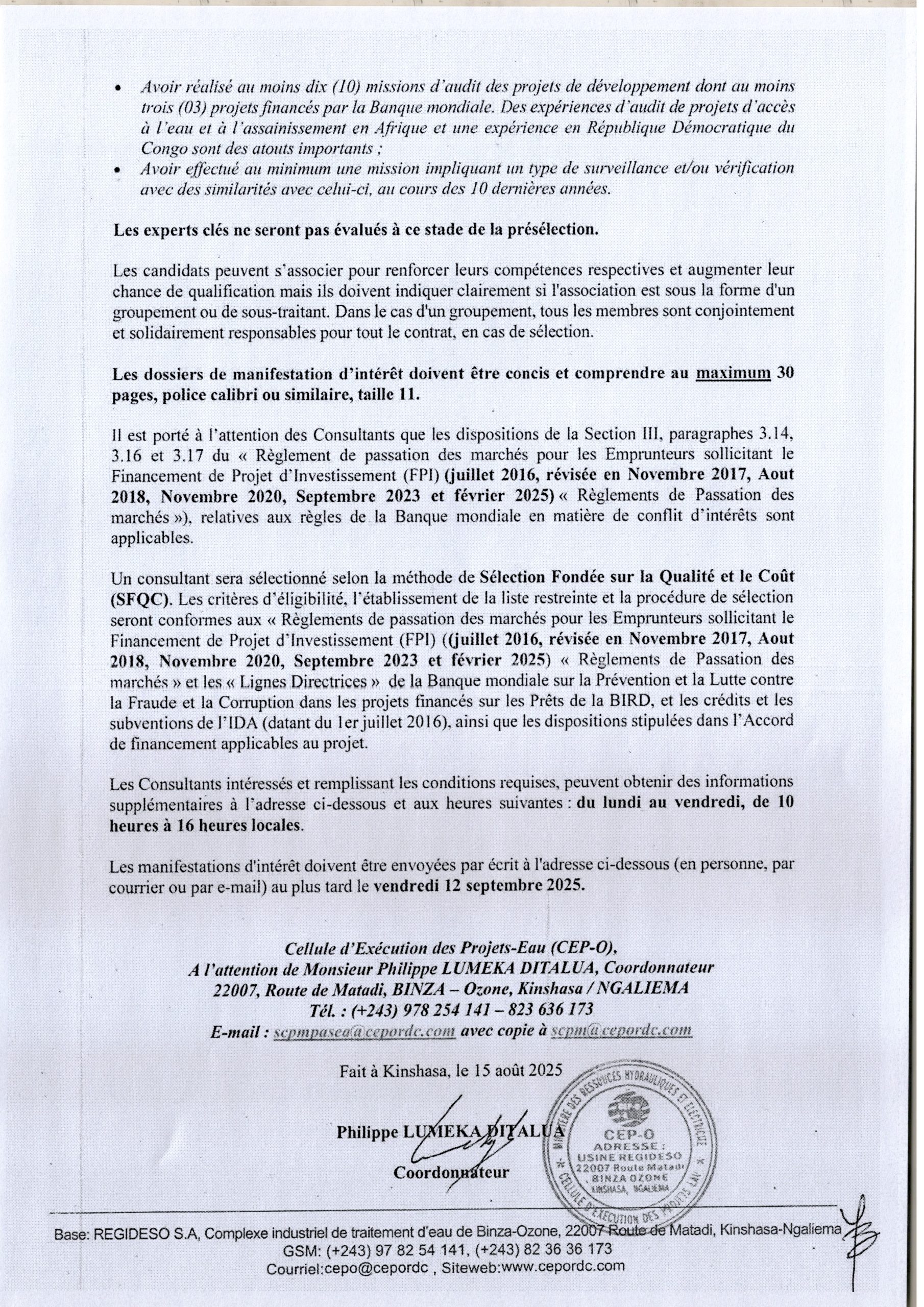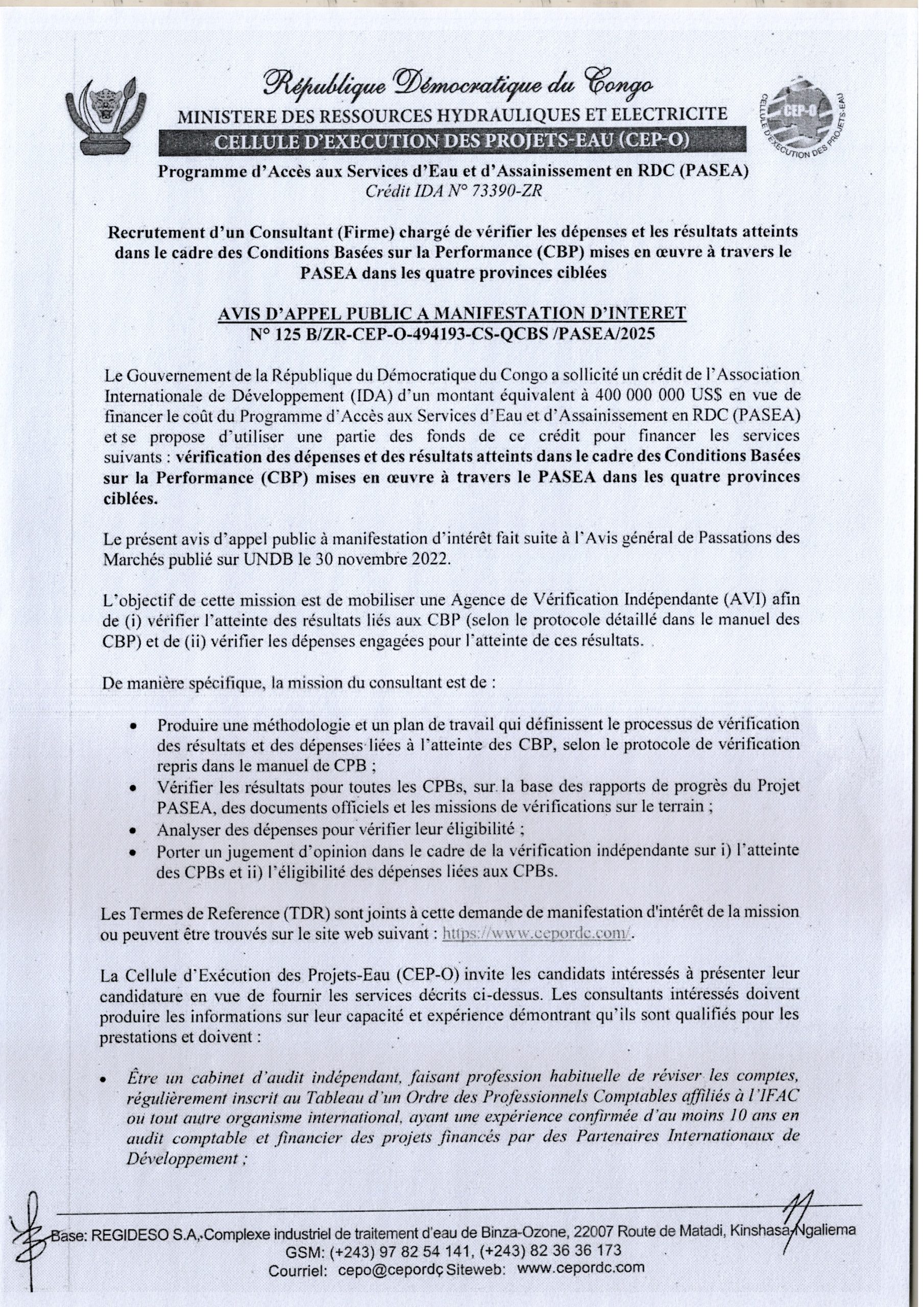Recrutement d’un Consultant (firme) chargé de vérifier les dépenses et les résultats atteints dans le cadre des CBP mises en œuvre à travers le PASEA dans les quatre provinces ciblées