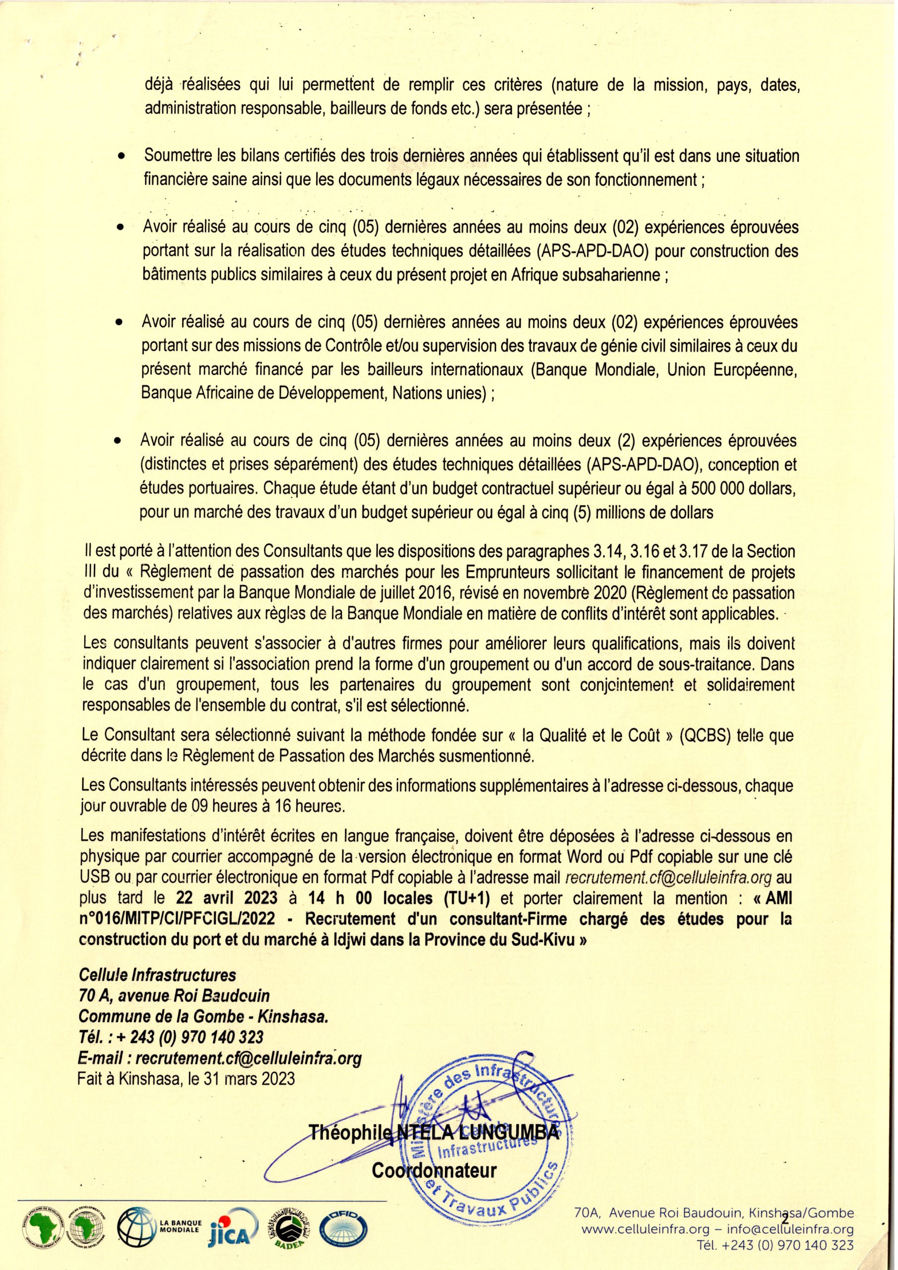 Recrutement d’un consultant-Firme chargé des études pour la construction du port et du marché à Idjwi dans la Province du Sud-Kivu