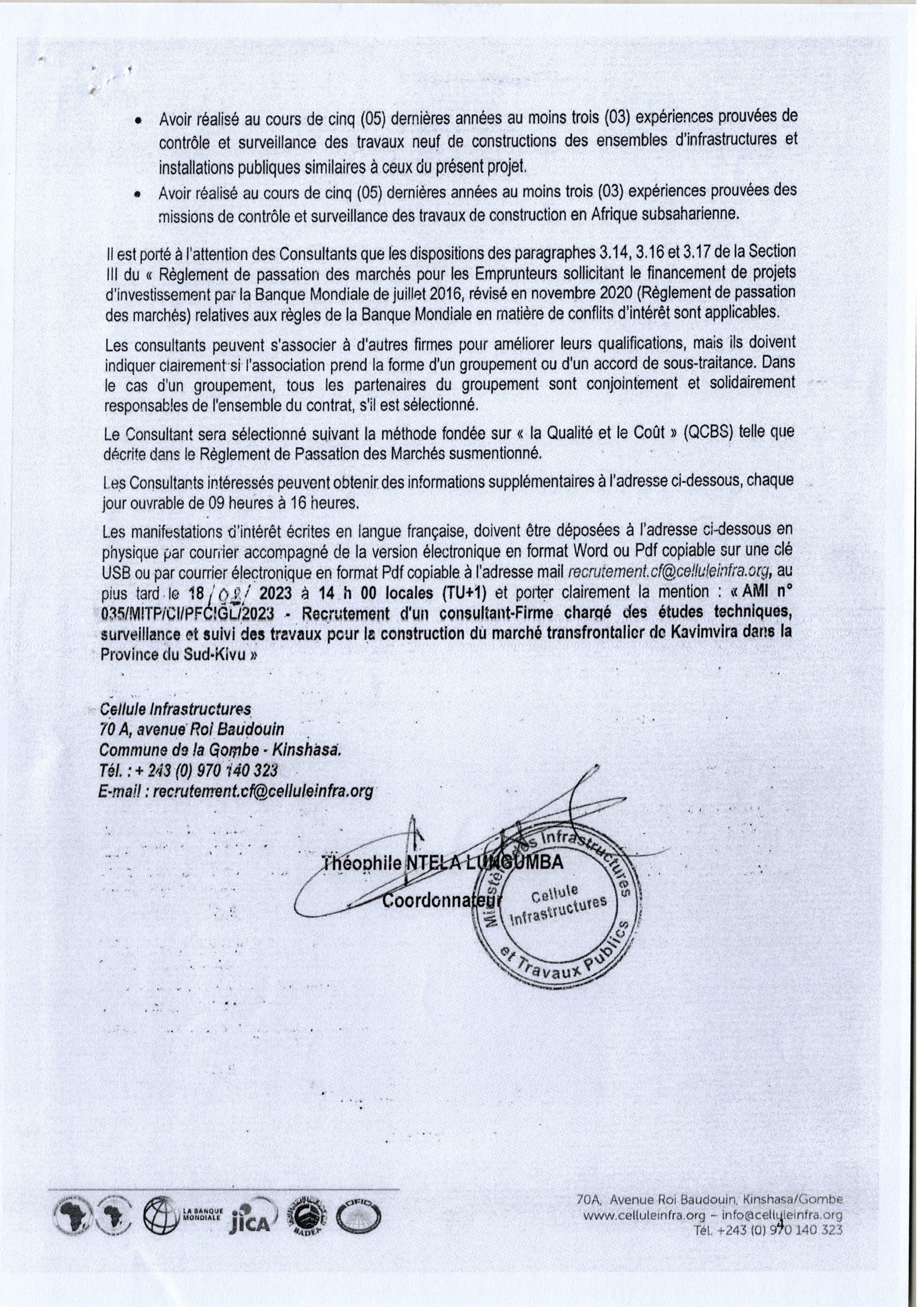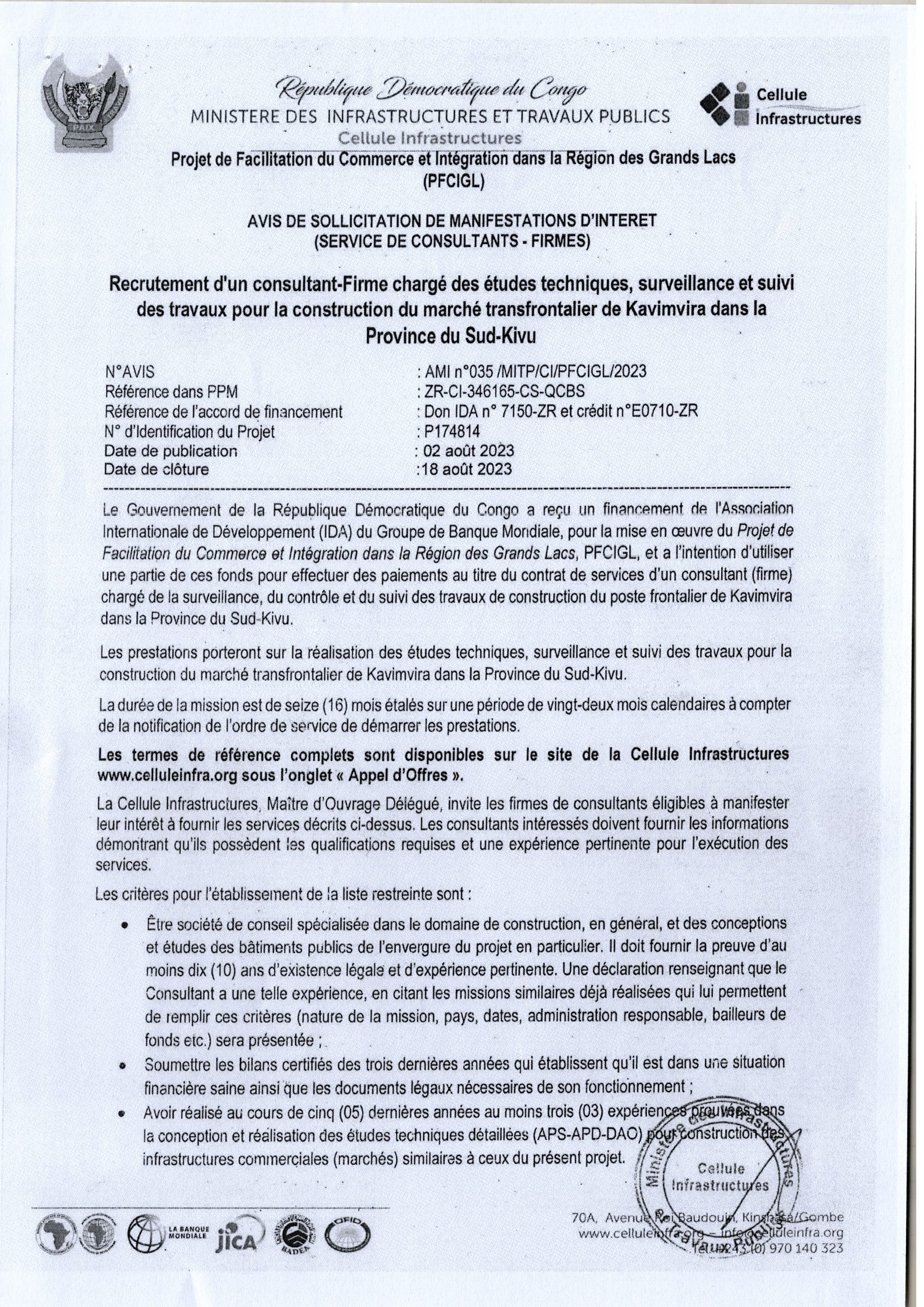 Recrutement d’un consultant-Firme chargé des études techniques, surveillance et suivi des travaux pour la construction du marché transfrontalier de kavimvira dans la Province du Sud-Kivu