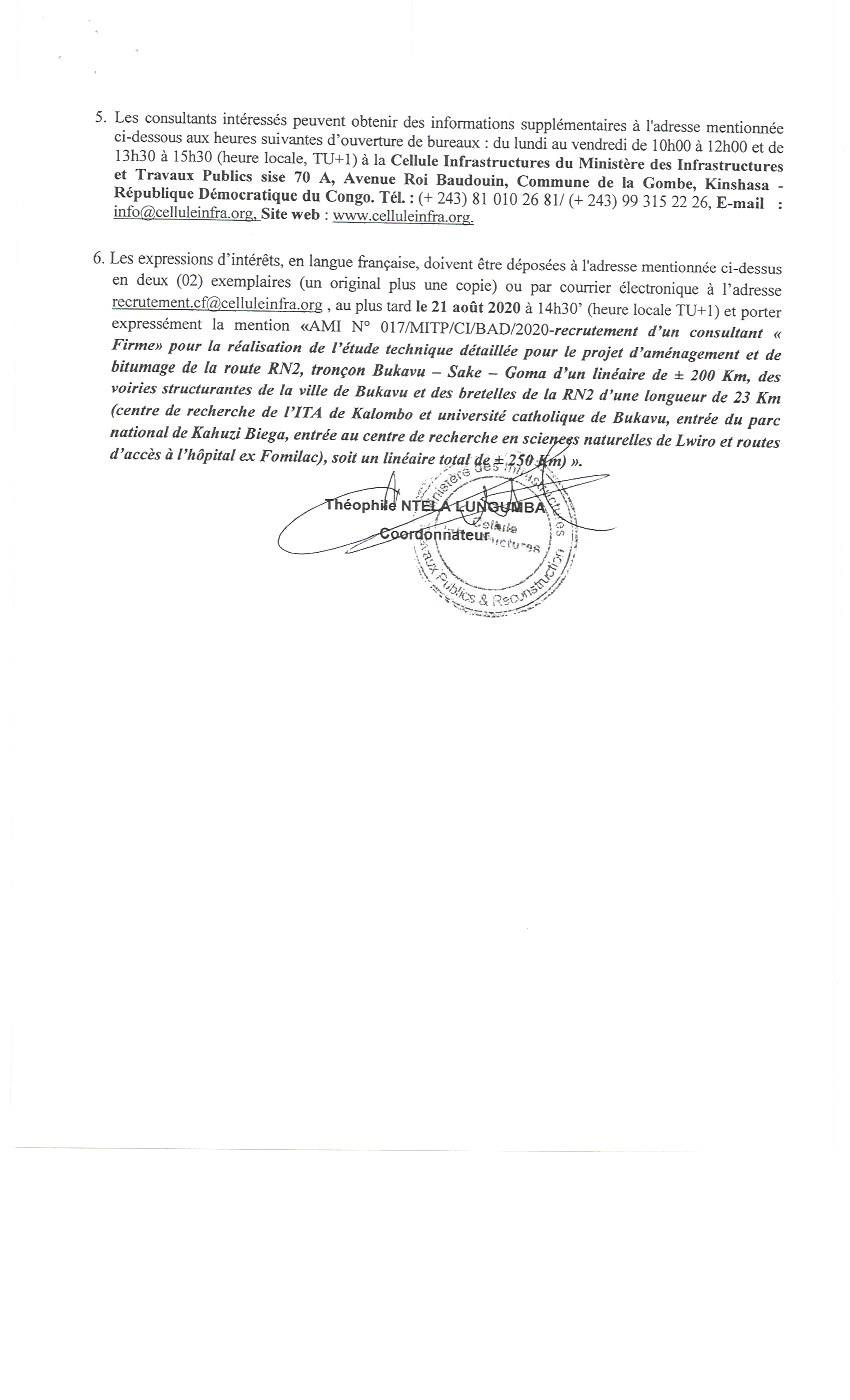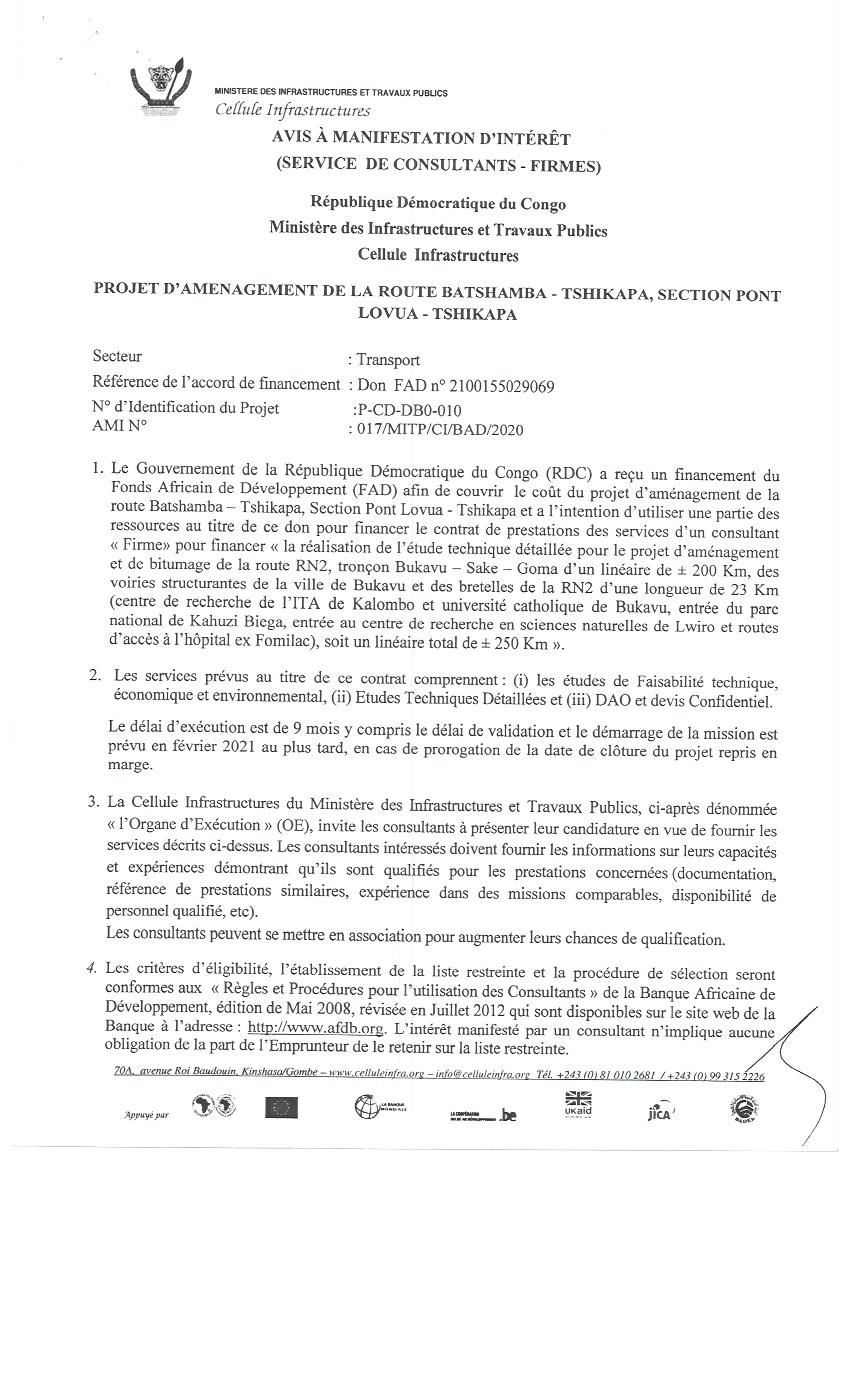 Recrutement d’un consultant (firme) pour financer la réalisation de l’étude technique détaillée pour le projet d’aménagement et de bitumage de la route RN2, tronçon Bukavu-Sake-Goma d’un linéaire de + 200 Km …