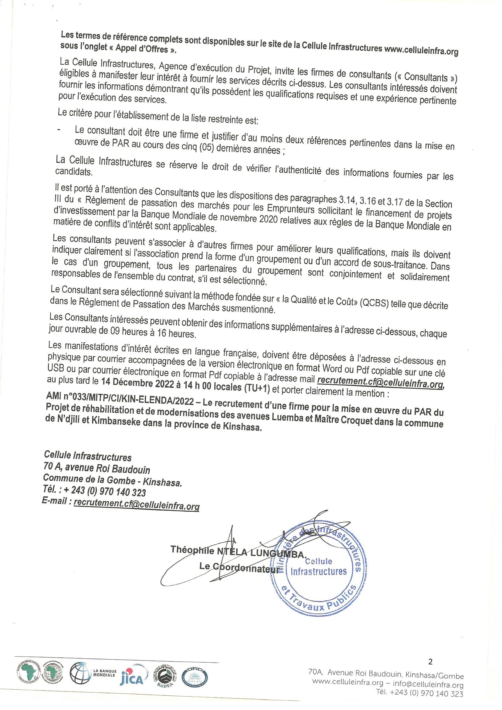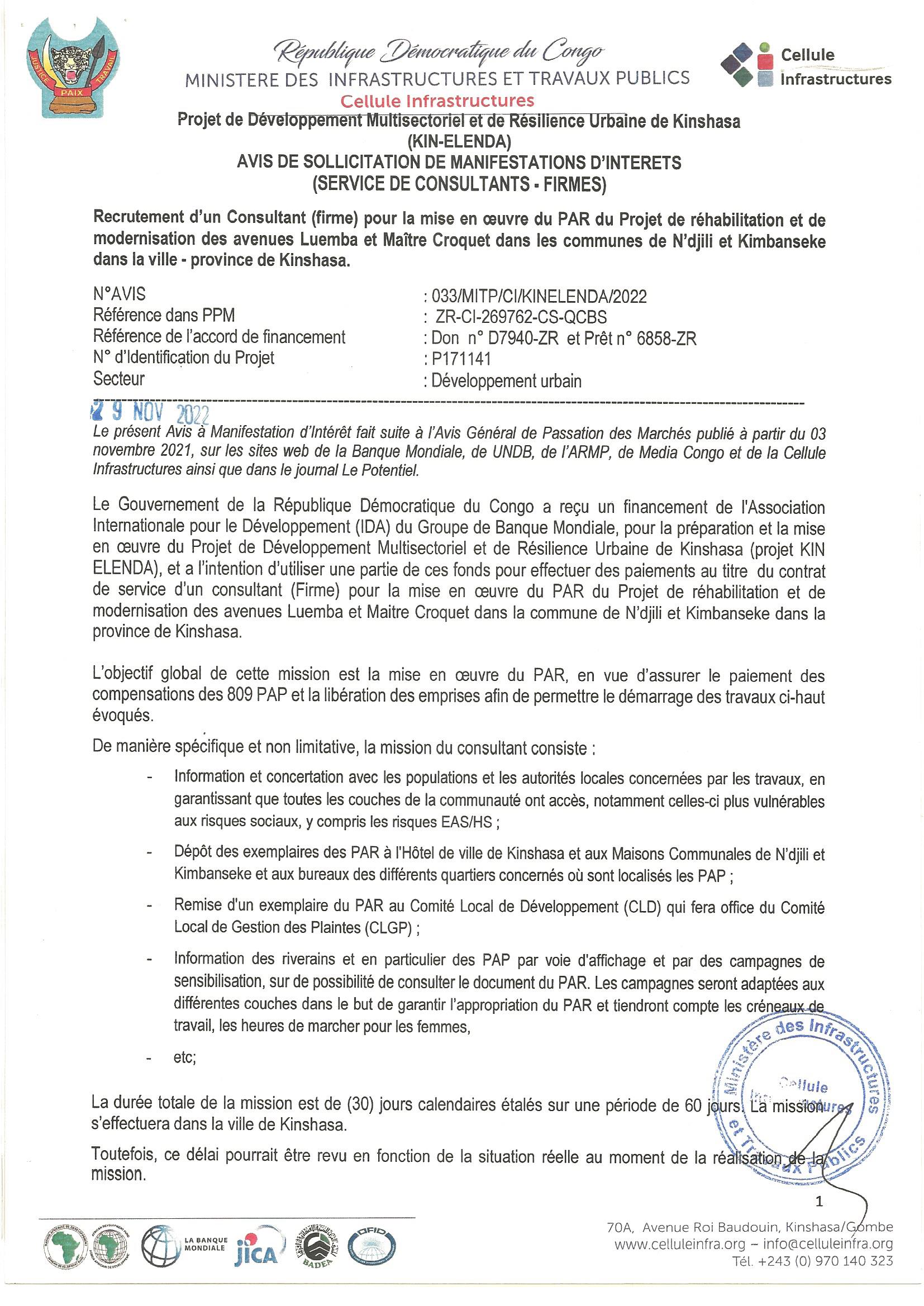 Recrutement d’un consultant (firme) pour la mise en œuvre du PAR du Projet de réhabilitation et de modernisation des avenues Luemba et Maitre croquet dans les communes de Ndjili et Kimbanseke dans la ville-province de Kinshasa