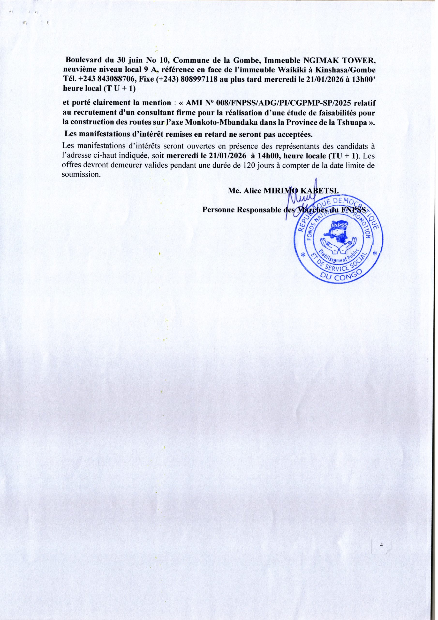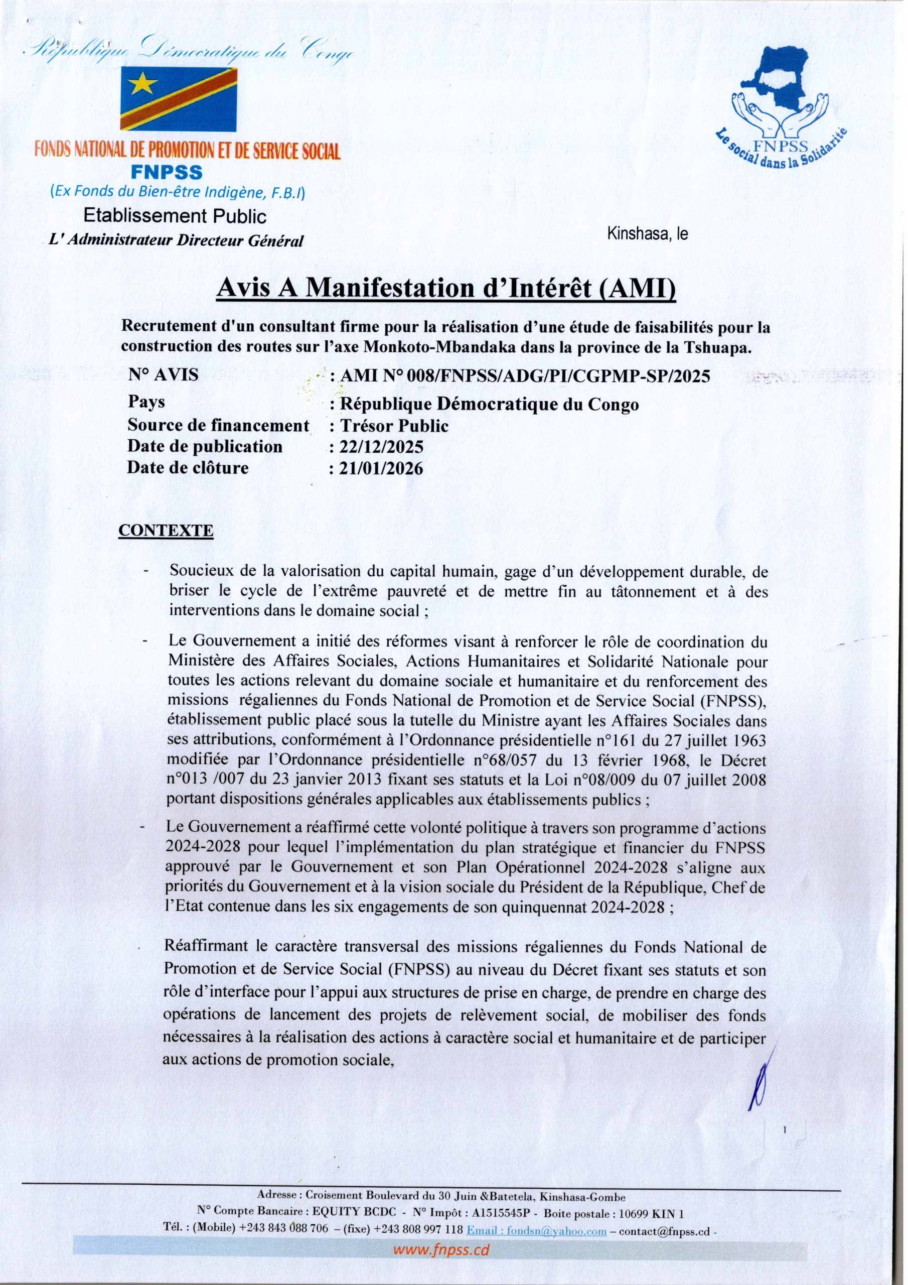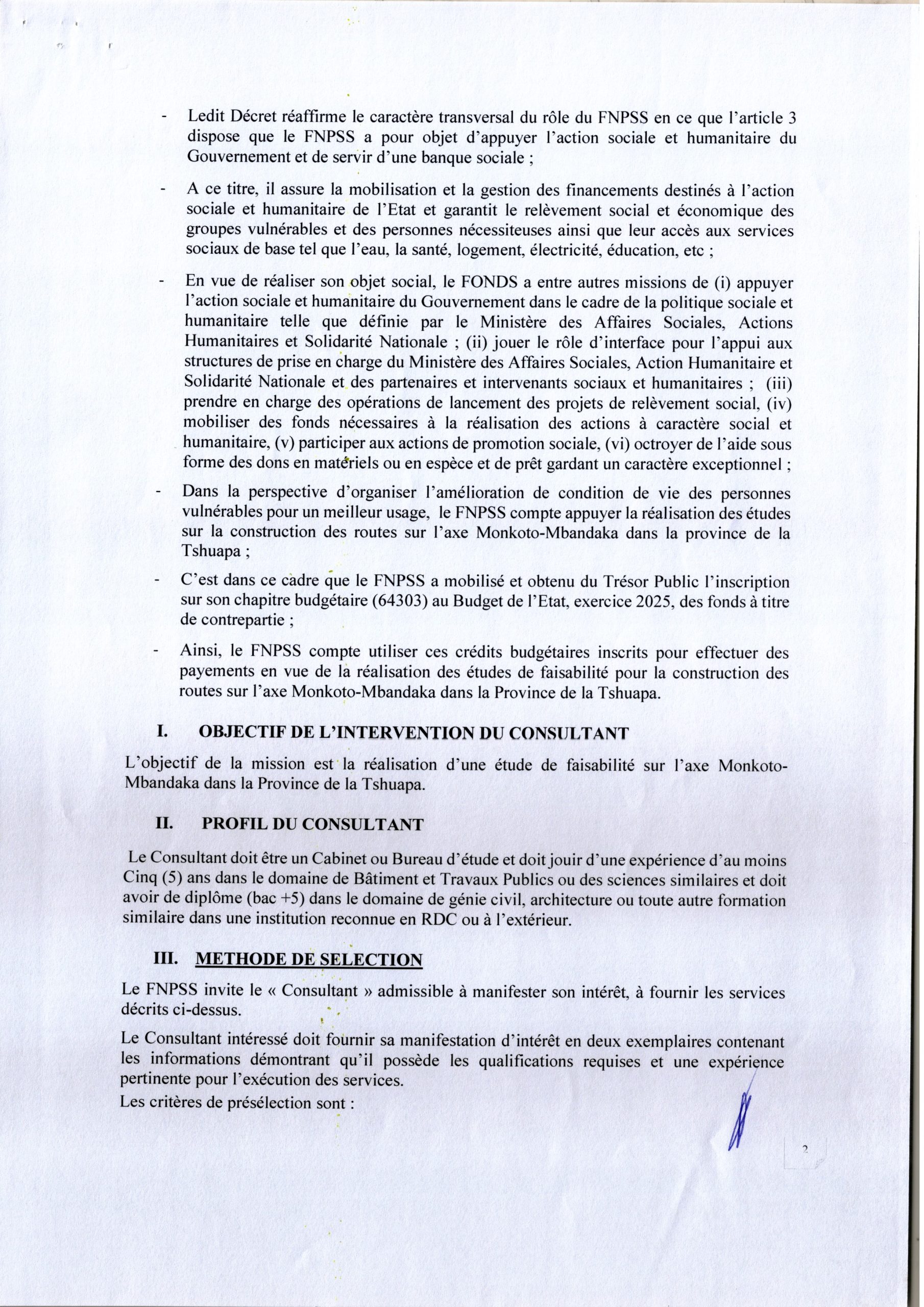Recrutement d’un consultant firme pour la réalisation d’une étude de faisabilité pour la construction des routes sur l’axe Monkoko-Mbandaka dans la Province de la Tshuapa.