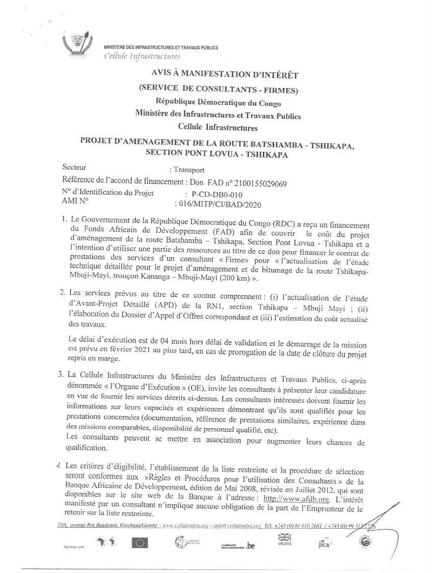 Recrutement d’un consultant (firme) pour l’actualisation de l’étude technique détaillée pour le projet d’aménagement et de bitumage de la route Tshikapa-Mbuji-Mayi, tronçon Kananga-Mbuji-Mayi (200 Km)