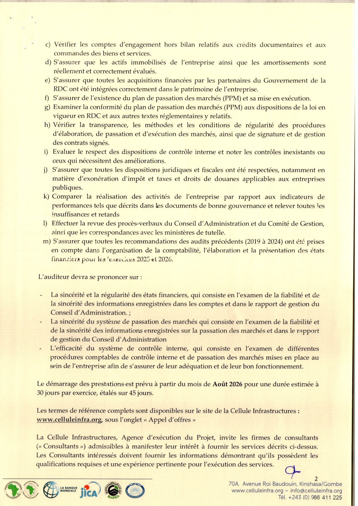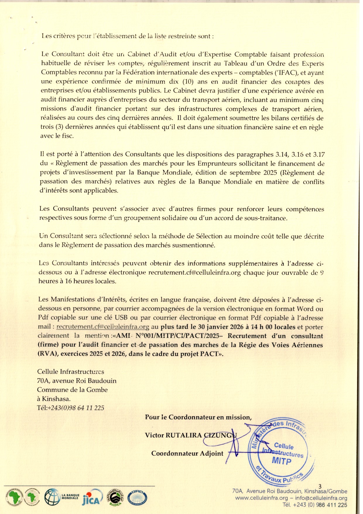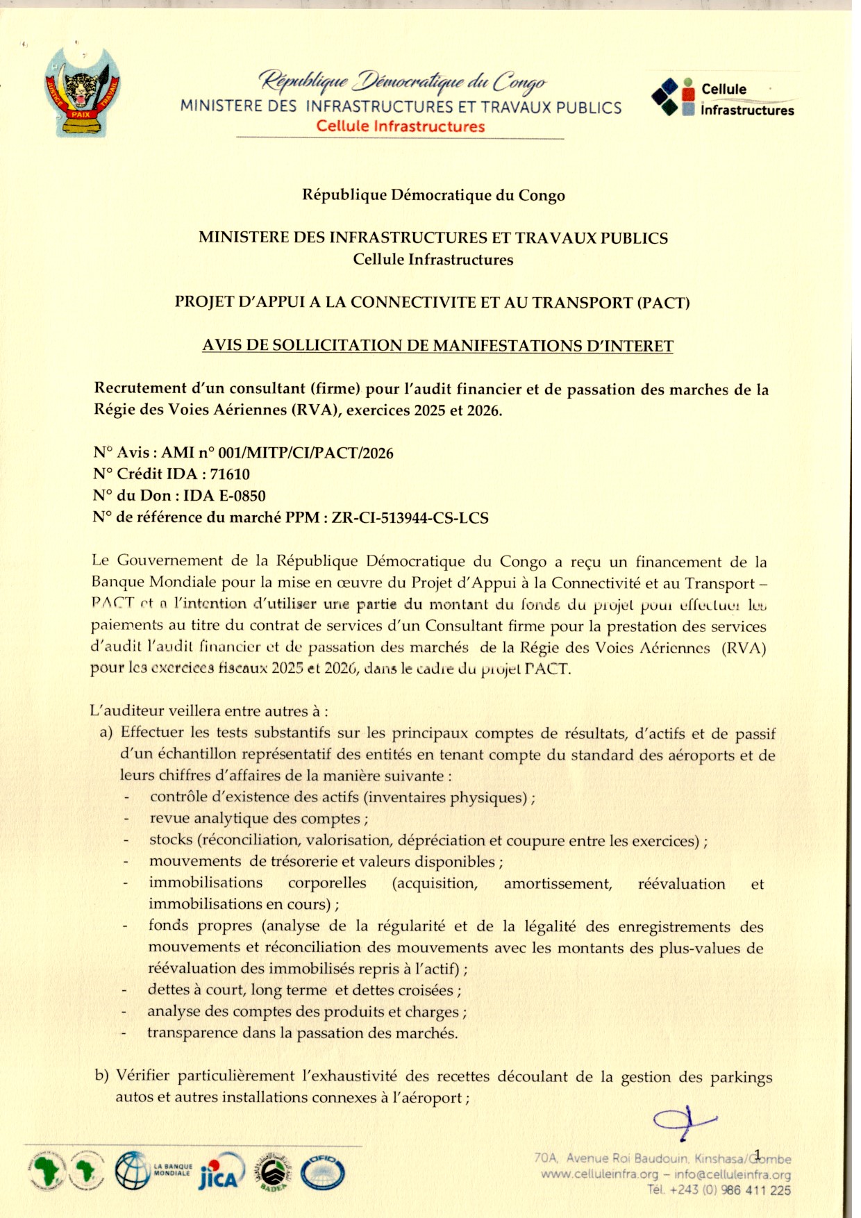 Recrutement d’un consultant (firme) pour l’audit financier et de passation des marches de la Régie des Voies Aériennes (RVA), exercices 2025 et 2026.