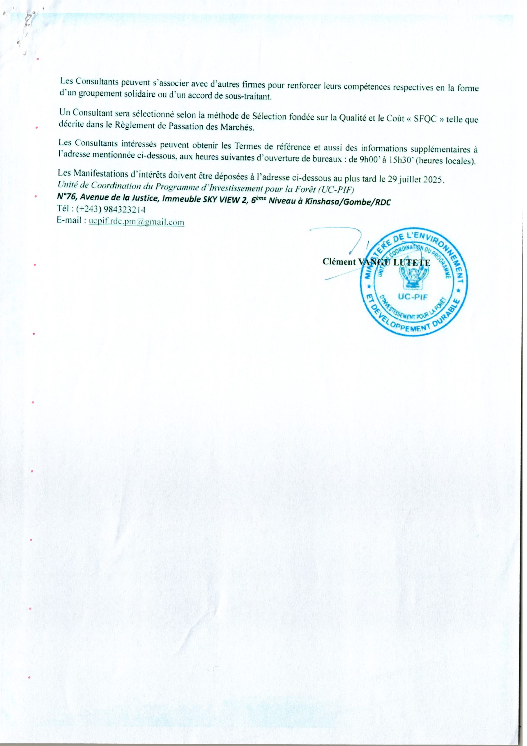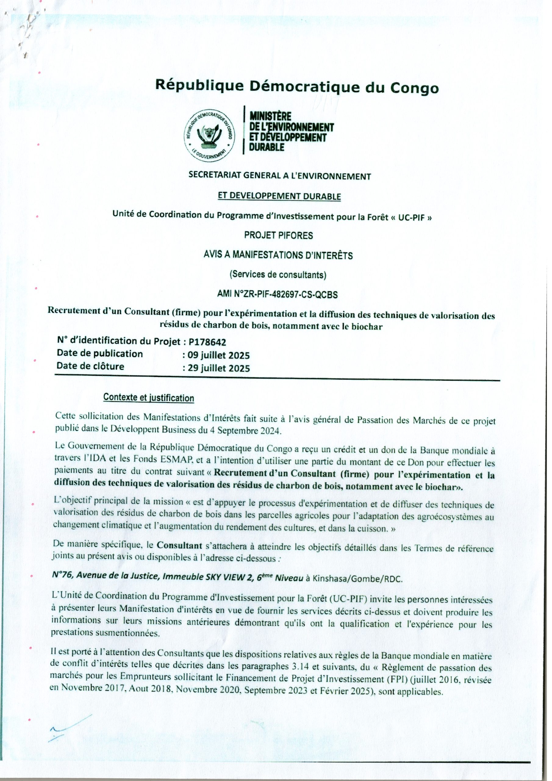 Recrutement d’un consultant (firme) pour l’expérimentation et la diffusions des techniques de valorisation des résidus de charbon de bois, notamment avec le biochar.