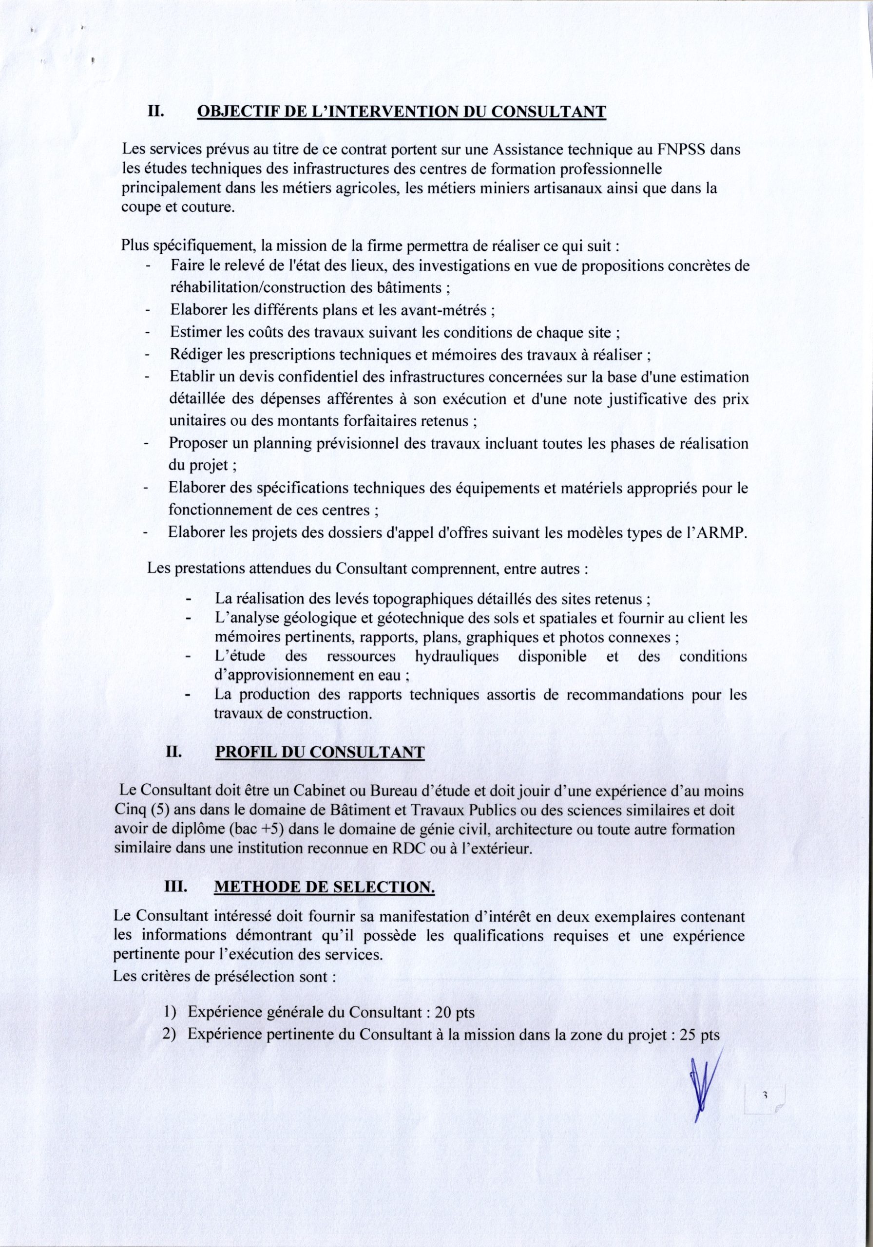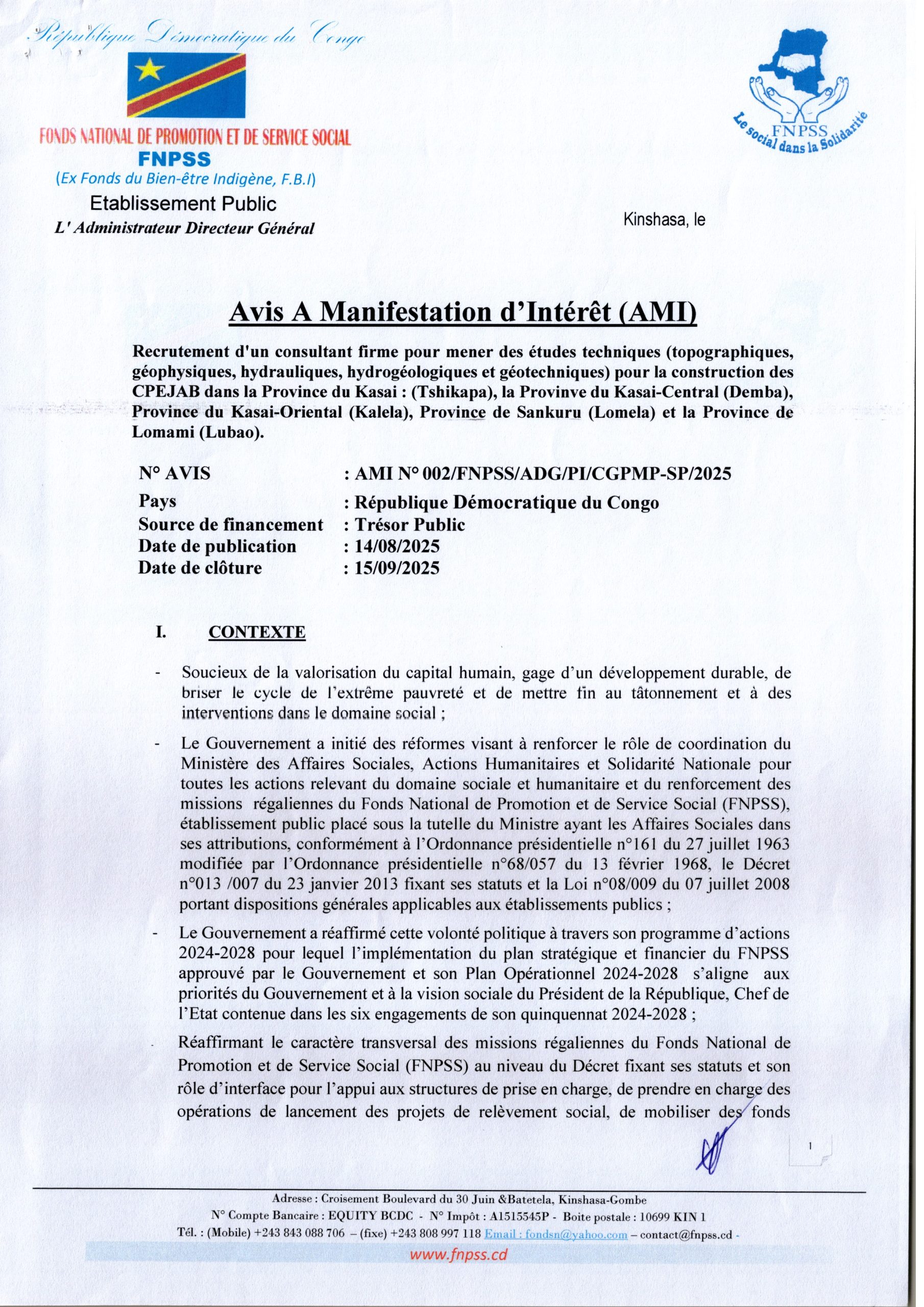 Recrutement d’un consultant firme pour mener des études techniques pour la construction des CPEJAB dans la Province du Kasaï, la Province du Kasaï-Central, la Province du Kasaï-Oriental, la Province du Sankuru et la Province de Lomami.