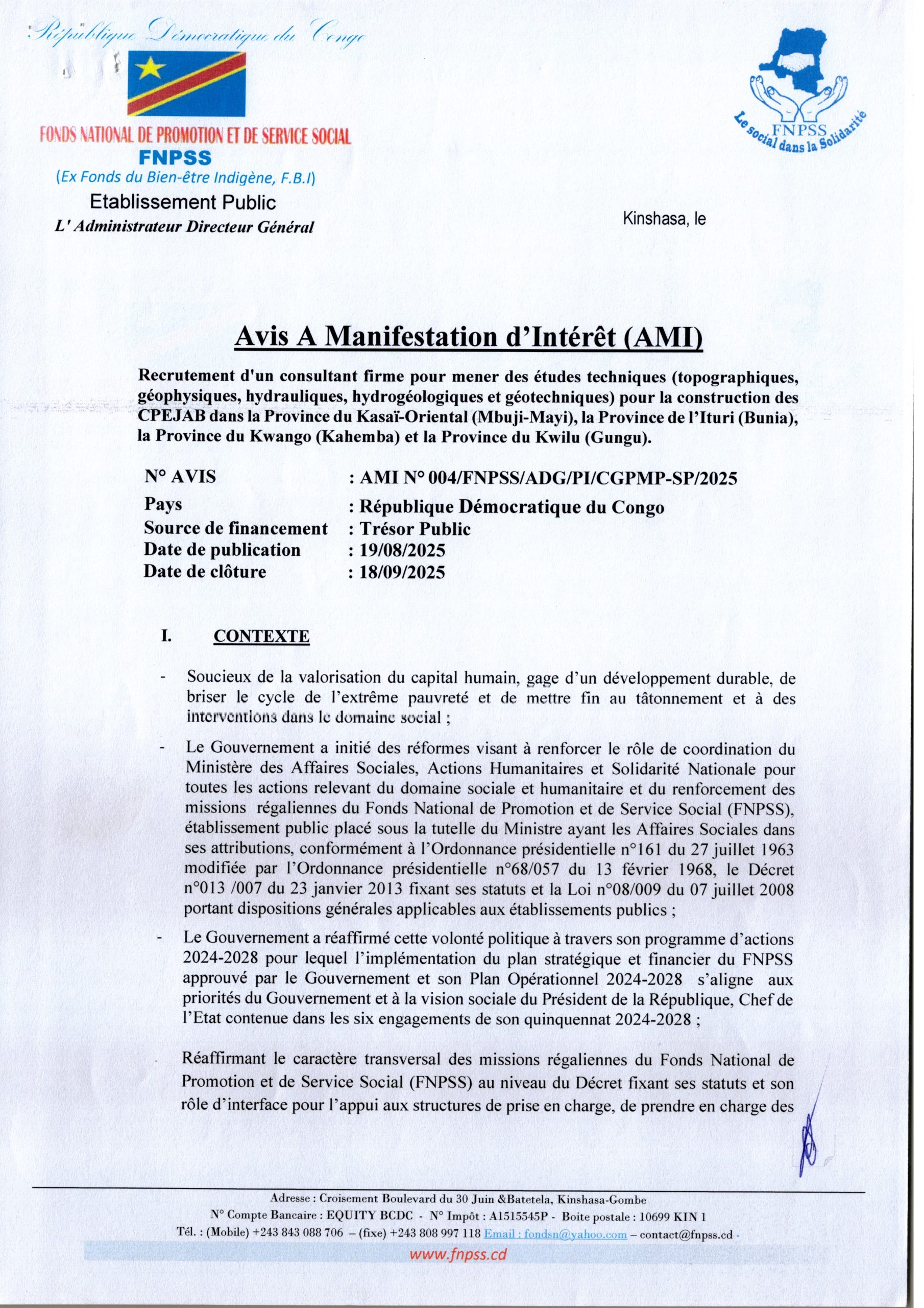 Recrutement d’un consultant firme pour mener des études techniques pour la construction des CPEJAB dans la Province du Kasaï-Oriental, la Province de l’Ituri, la Province du Kwango et la Province du Kwilu
