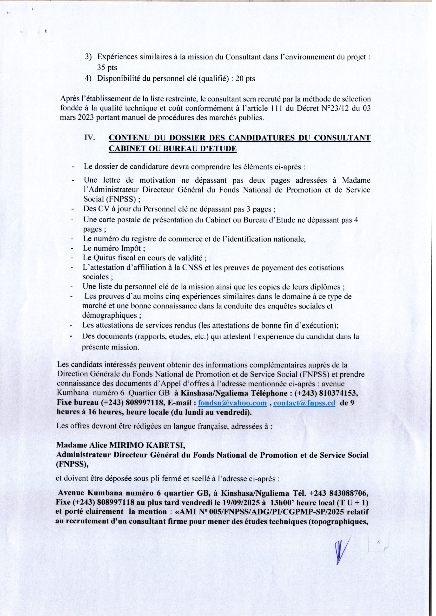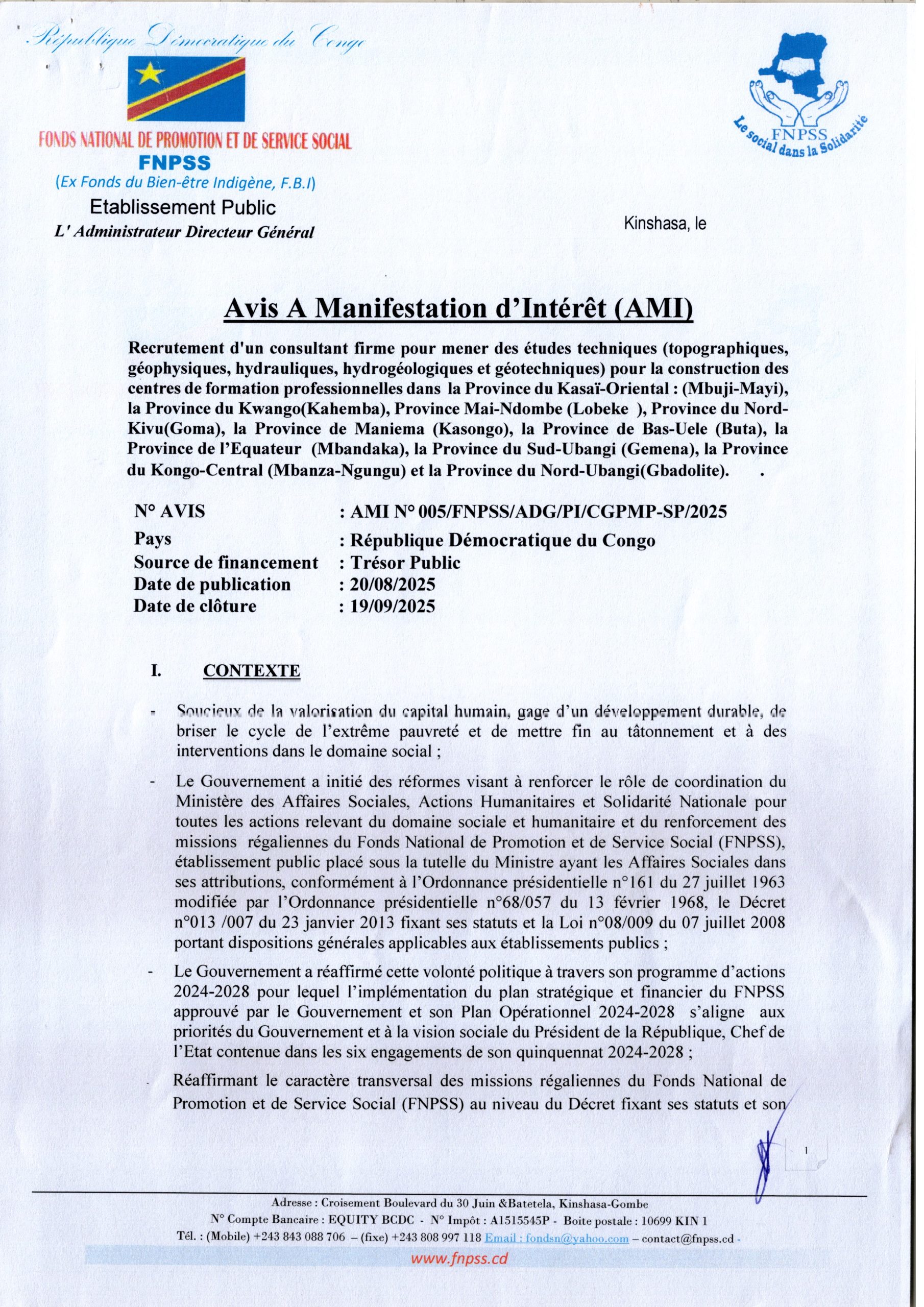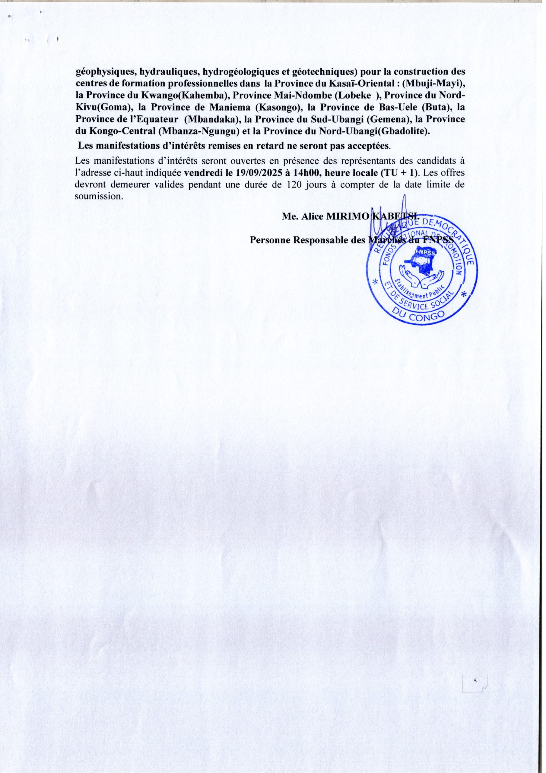Recrutement d’un consultant firme pour mener des études techniques (topographiques, géophysiques, hydrauliques, hydrogéologiques et géotechniques) pour la construction des centres de formation professionnelles dans la Province du Kasai-Oriental : (Mbuji-Mayi), la Province du Kwango : (Kahemba), Province du Mai-Ndombe (Lobeke), Province du Nord-Kivu (Goma), la Province du Maniema (Kasongo), la Province de Bas-Uele (Buta), la Province de l’Equateur (Mbandaka), la Province du Sud-Ubangi (Gemena), la Province du Kongo-Central (Mbanza-Ngungu) et la Province du Nord-Ubangi (Gbadolite).