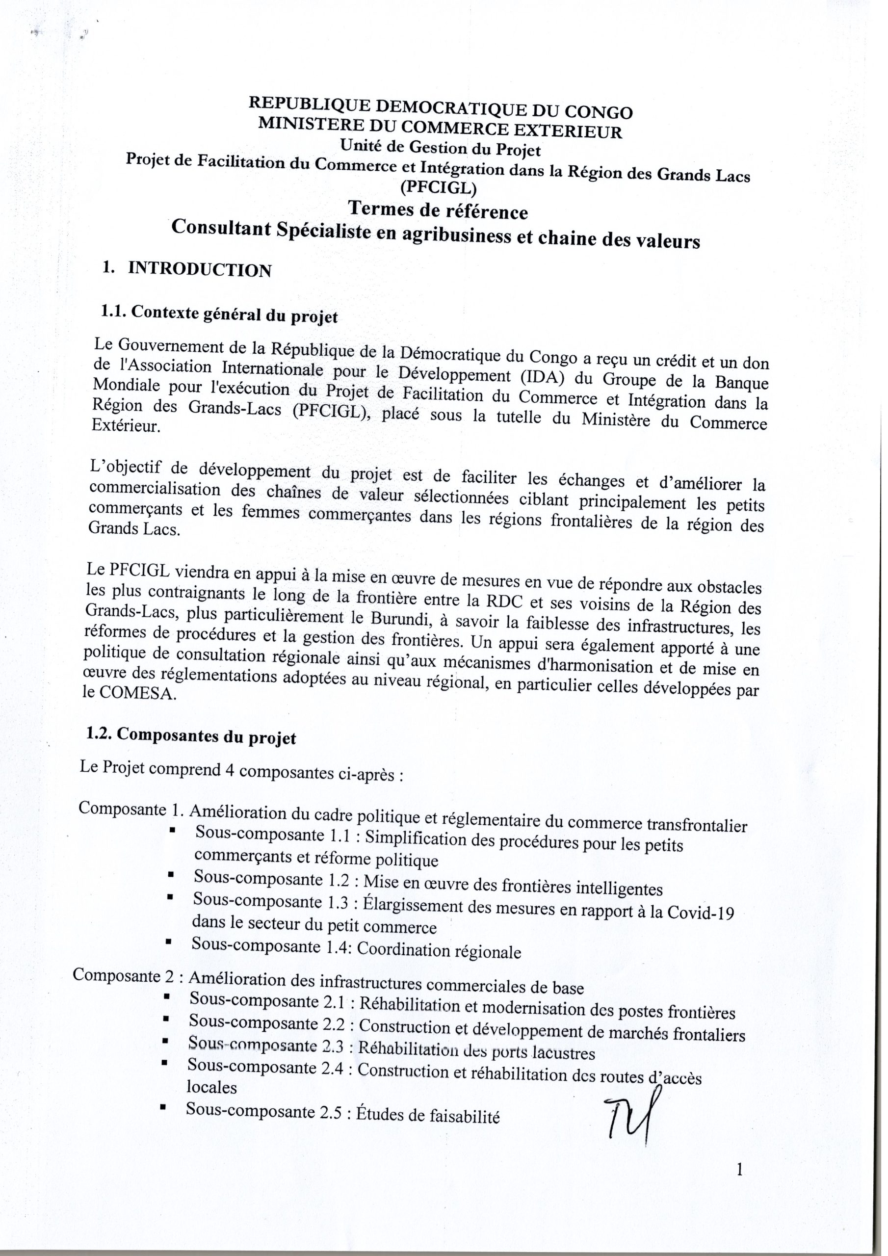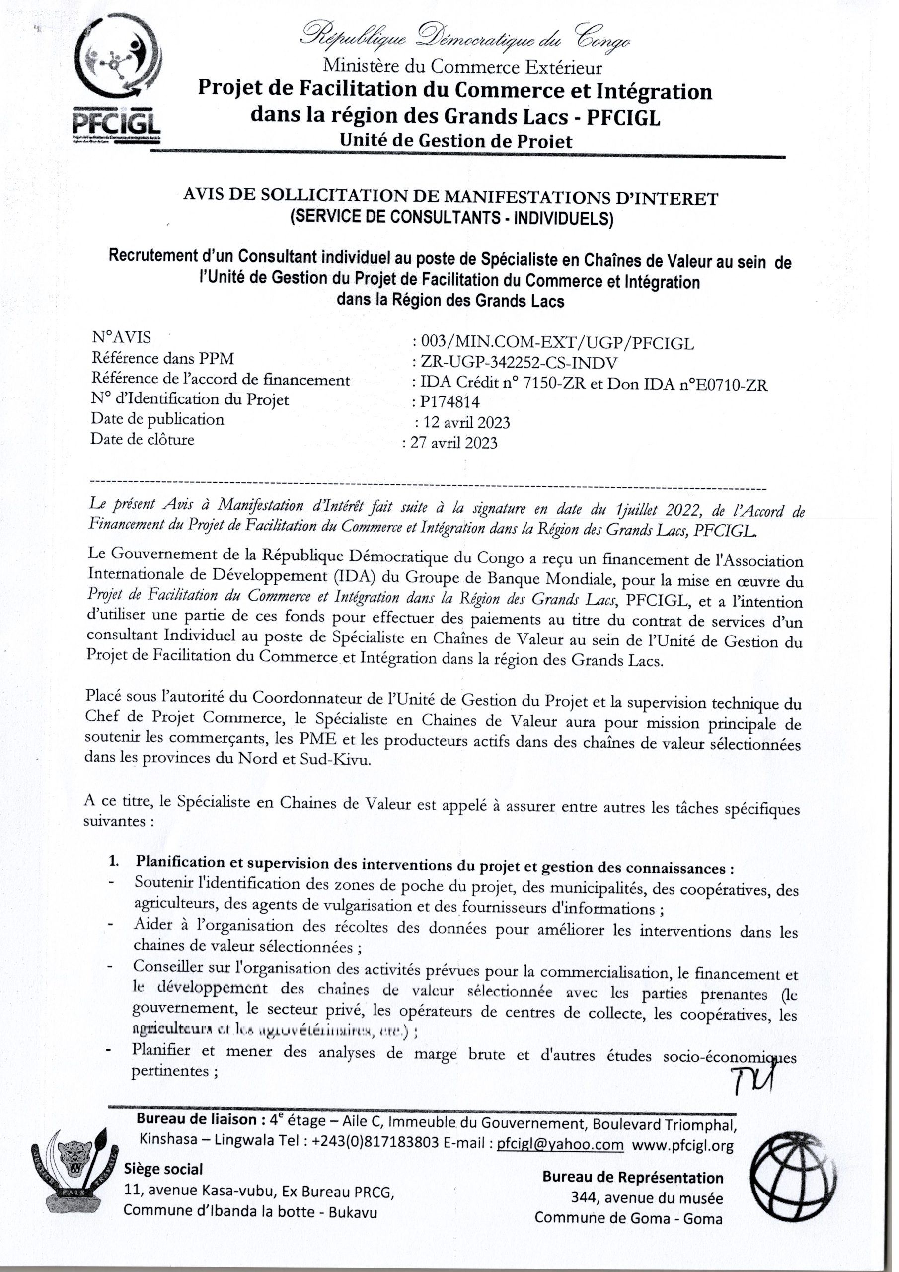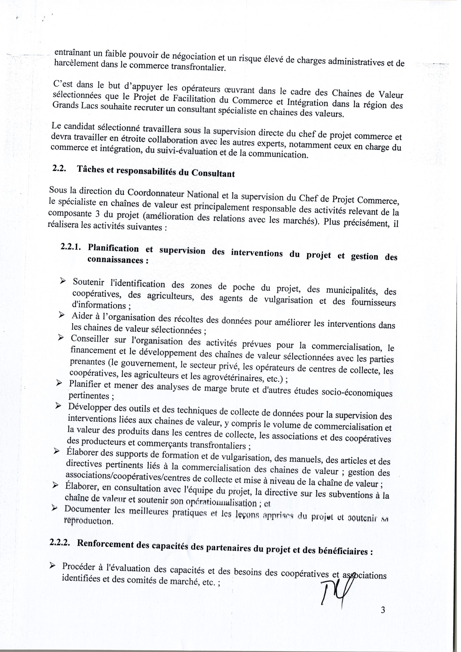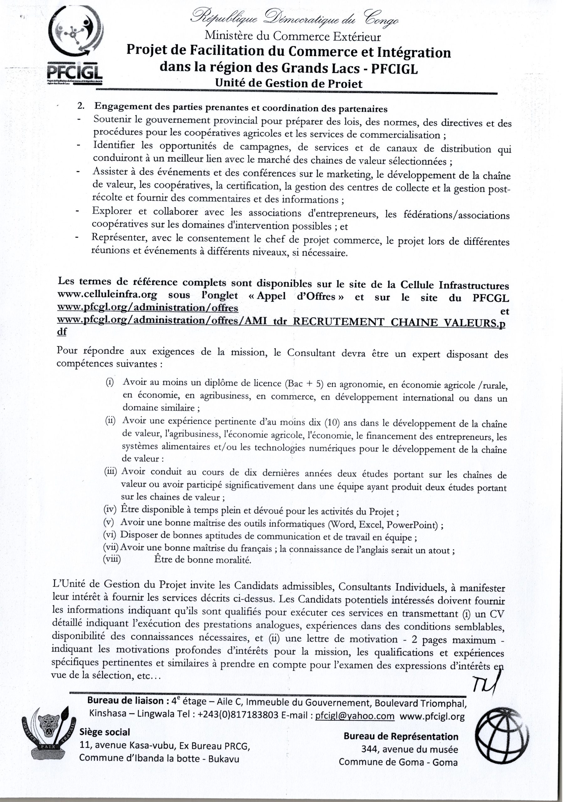 RECRUTEMENT D’UN CONSULTANT INDIVIDUEL AU POSTE DE SPECIALISTE EN CHAINES DE VALEUR AU SEIN DE L’UNITE DE GESTION DU PFCIGL ET TERMES DE REFERENCE CONSULTANT SPECIALISTE EN AGRIBUSINESS ET CHAINE DES VALEURS