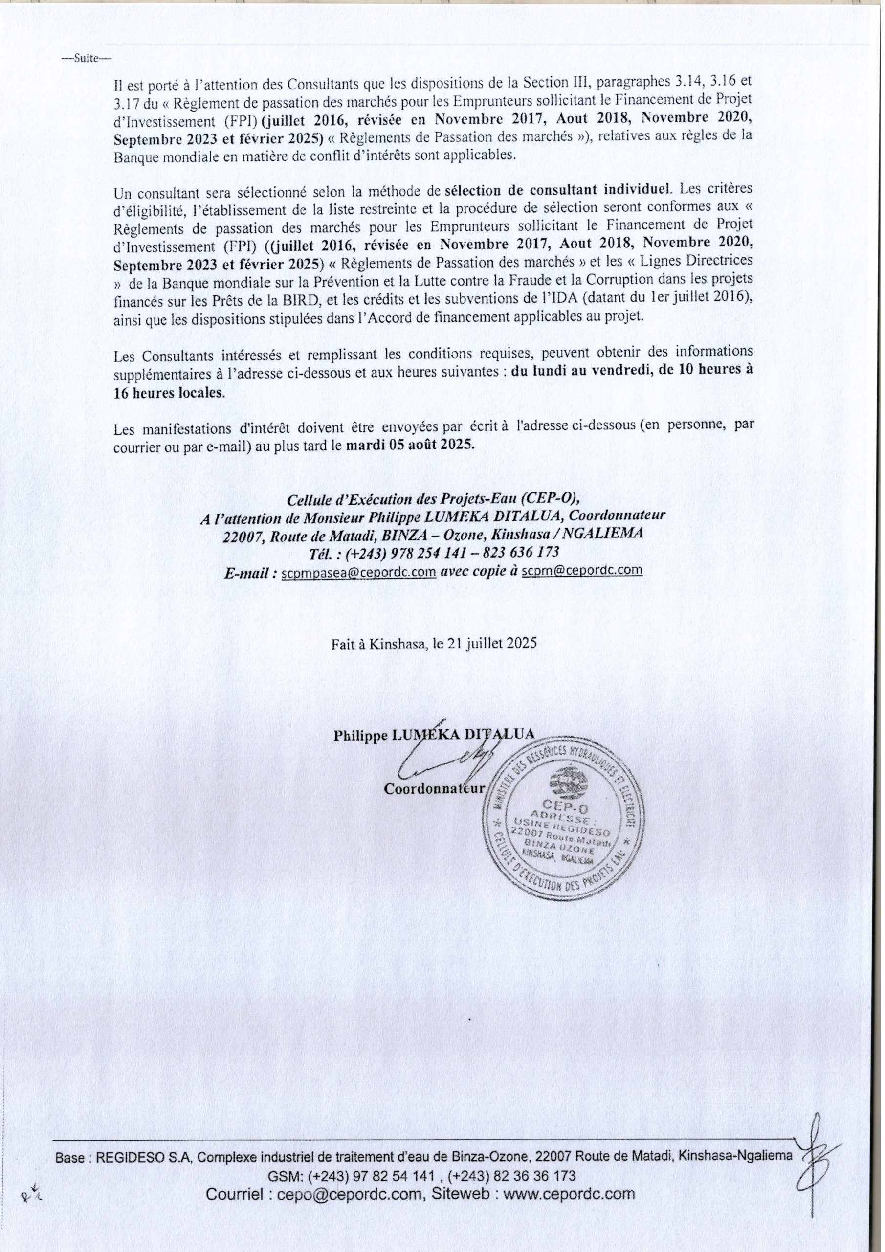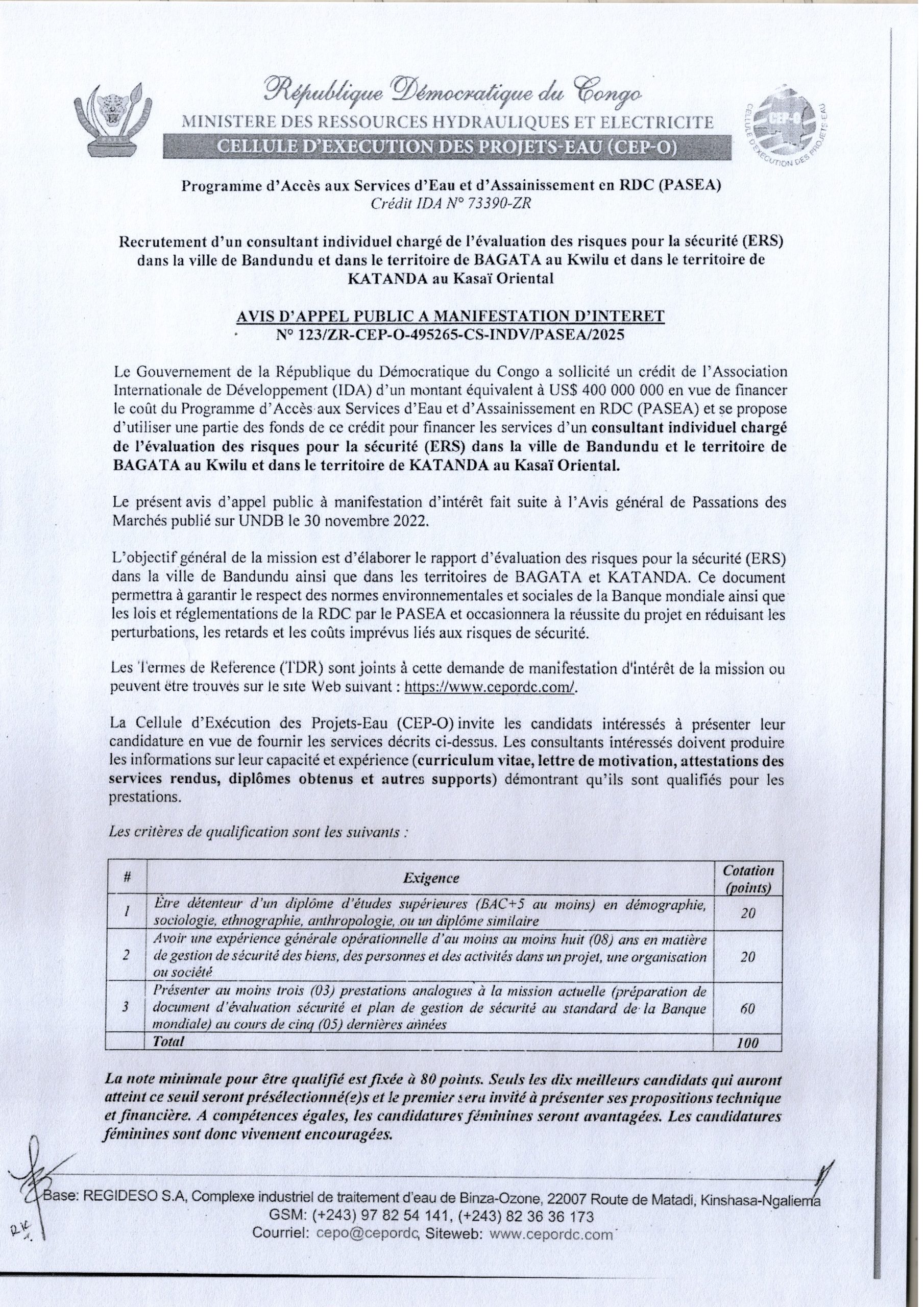 Recrutement d’un consultant individuel chargé de l’évaluation des risques pour la sécurité (ERS) dans la ville de Bandundu et le territoire de Bagata au Kwilu et dans le territoire de Katanda au Kasai Oriental.
