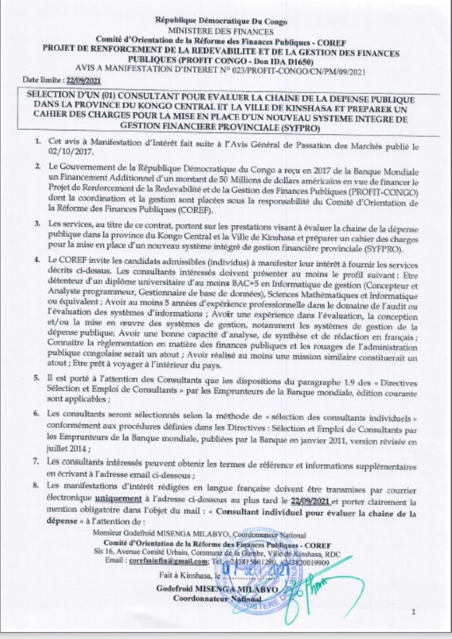 RECRUTEMENT D’UN CONSULTANT POUR EVALUER LA CHAINE DE LA DEPENSE PUBLIQUE DANS LA PROVINCE DU KONGO CENTRAL ET LA VILLE DE KINSHASA ET PREPARER UN CAHIER DES CHARGES POUR LA MISE EN PLACE D’UN NOUVEAU SYSTEME INTEGRE ….