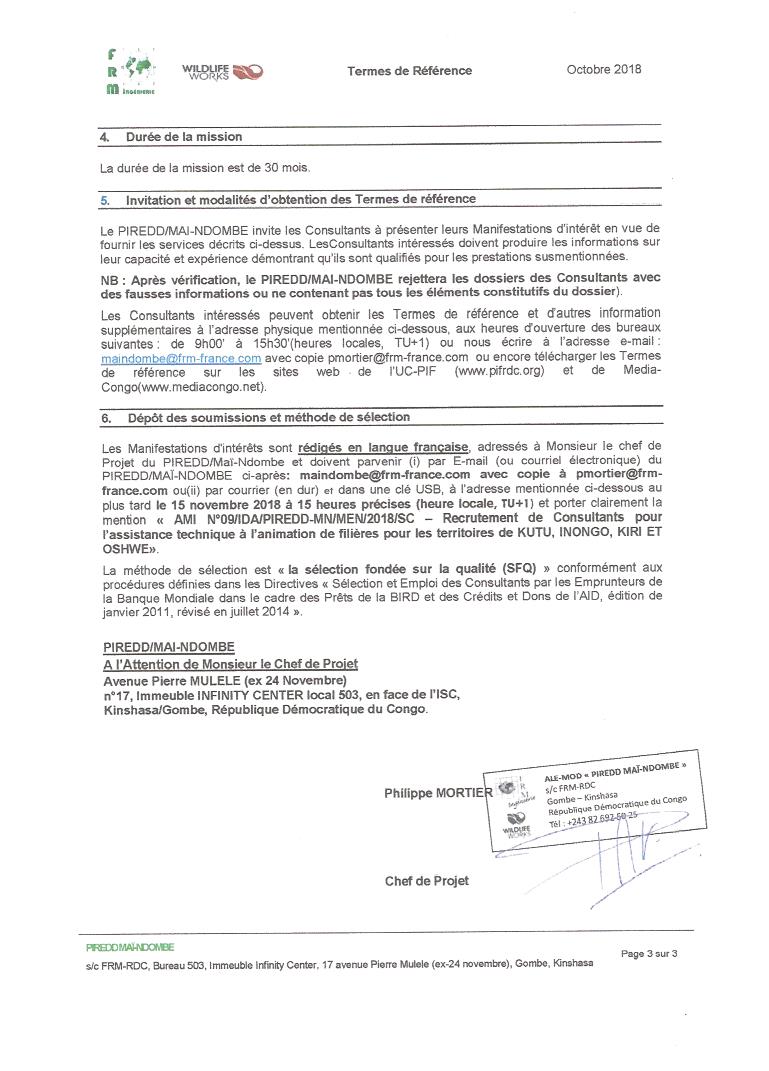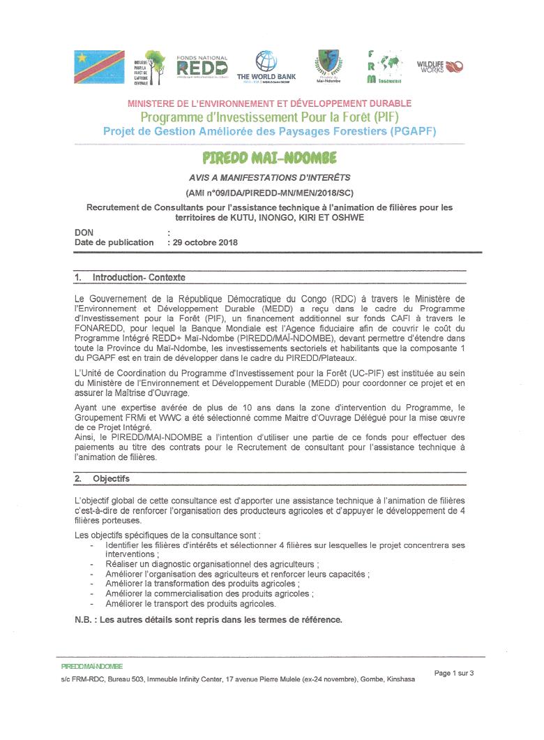 RECRUTEMENT D’UN CONSULTANT POUR L’ASSISTANCE TECHNIQUE À L’ANIMATION DE FILIÈRES POUR LES TERRITOIRES DE KUTU, INONGO, KIRI ET OSHWE.