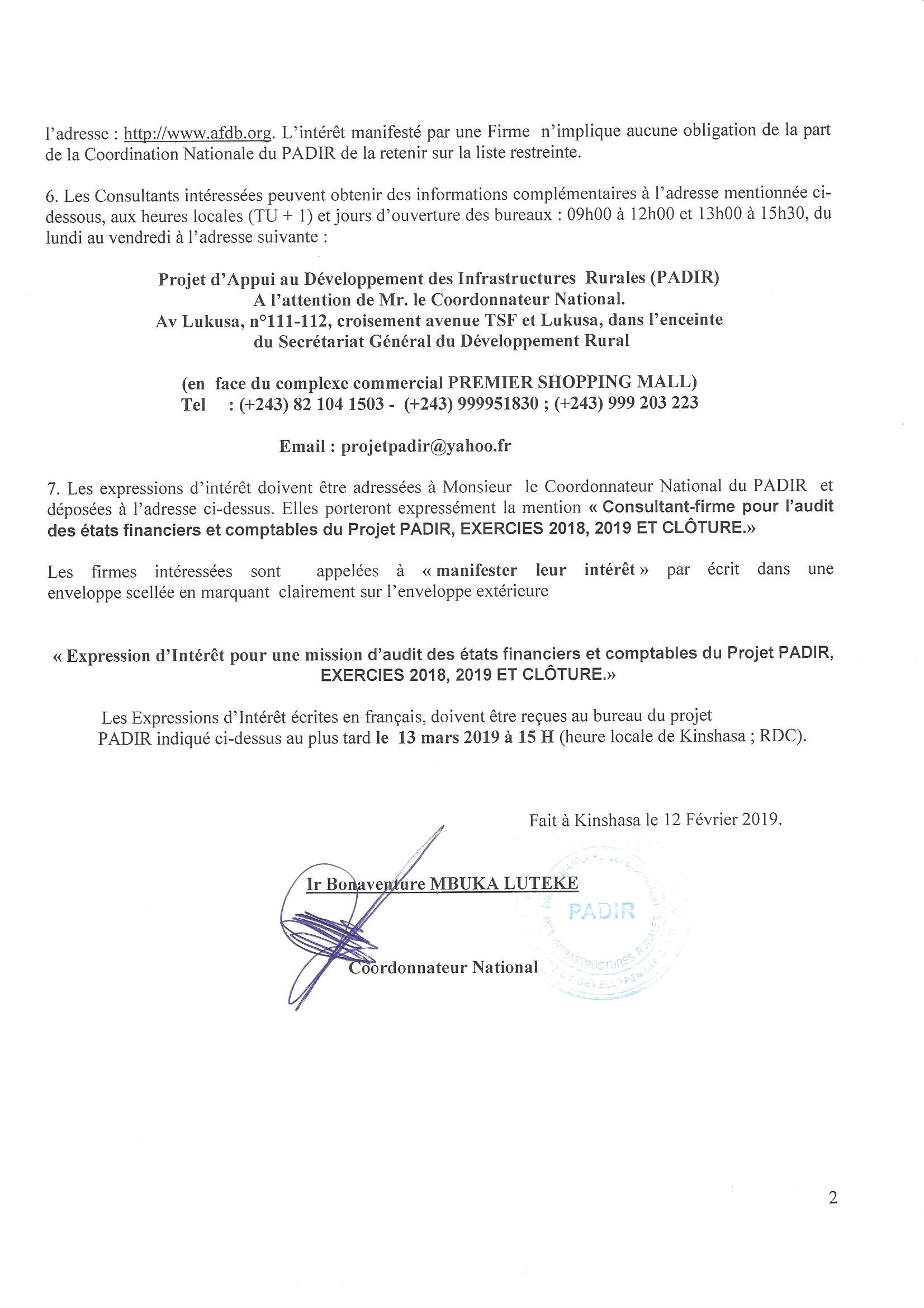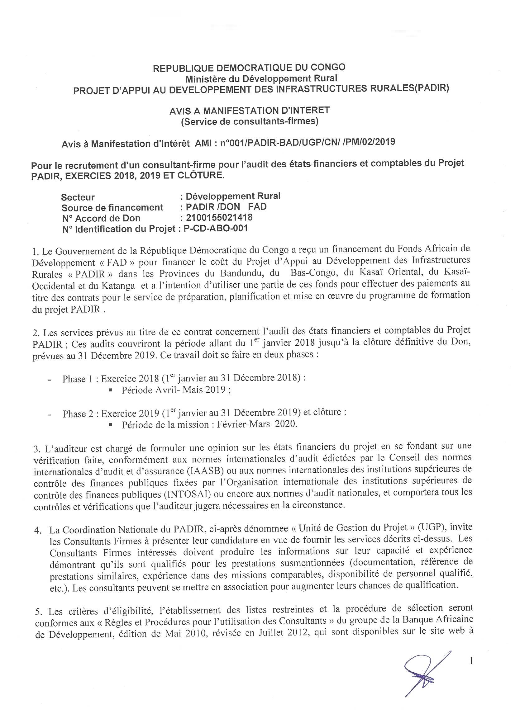 Recrutement d’un consultation-firme pour l’audit des états financiers et comptables du Projet PADIR, EXERCICES 2018, 2019 ET CLOTURE.