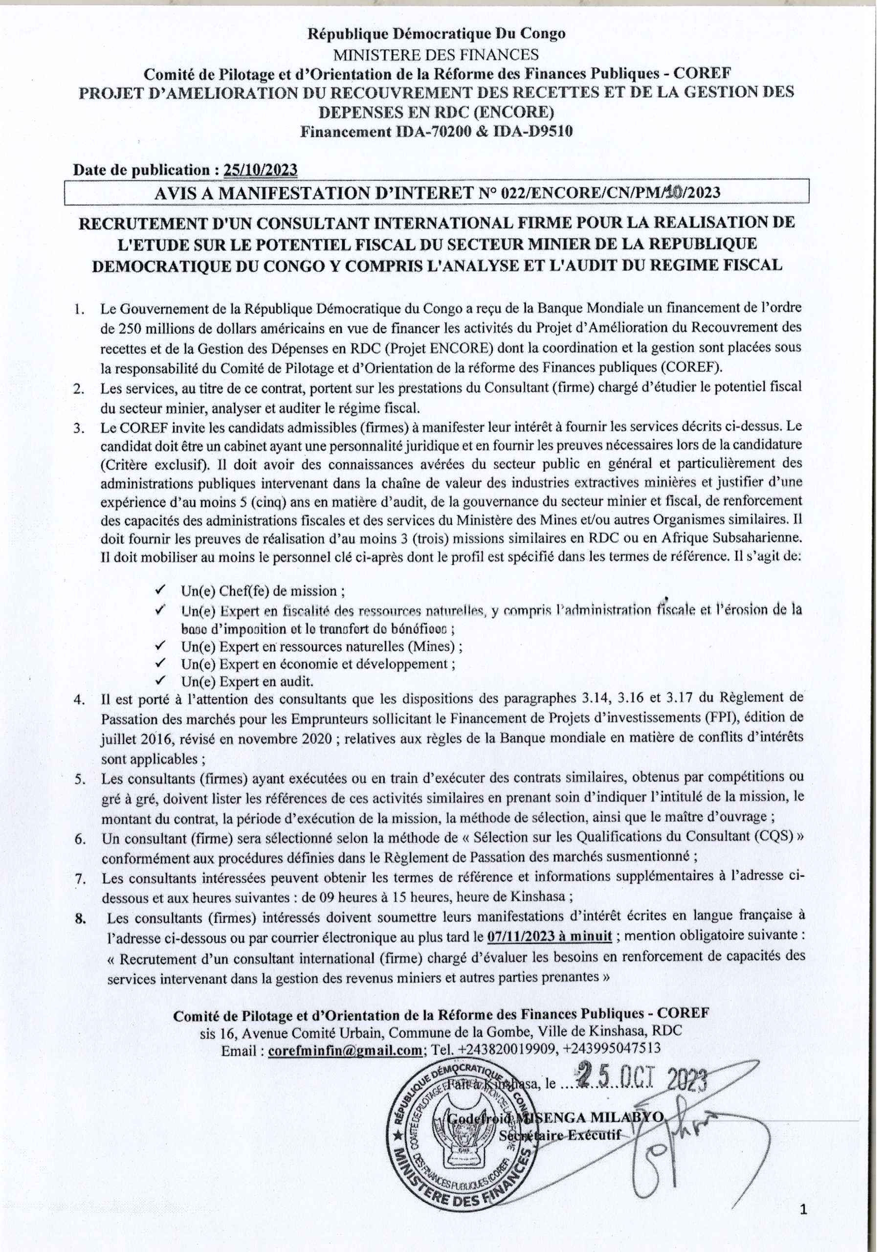 Recrutement d’un consultant International Firme pour la réalisation de l’Etude sur le potentiel fiscal du Secteur Minier de la République Démocratique du Congo y compris l’Analyse et l’Audit du régime Fiscal