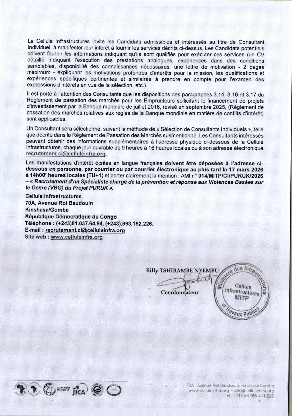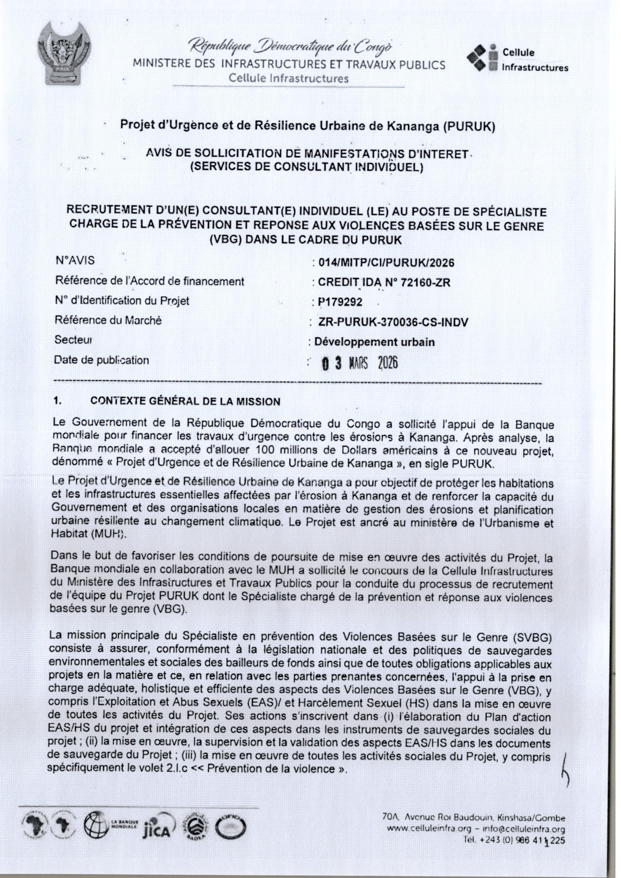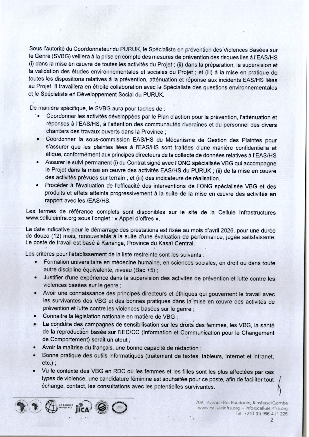 Recrutement d’un (e) consultant (e) Individuel (le) au Poste de spécialiste chargé de la prévention et réponse aux violences basées sur le genre (VBG) dans le cadre du PURUK.
