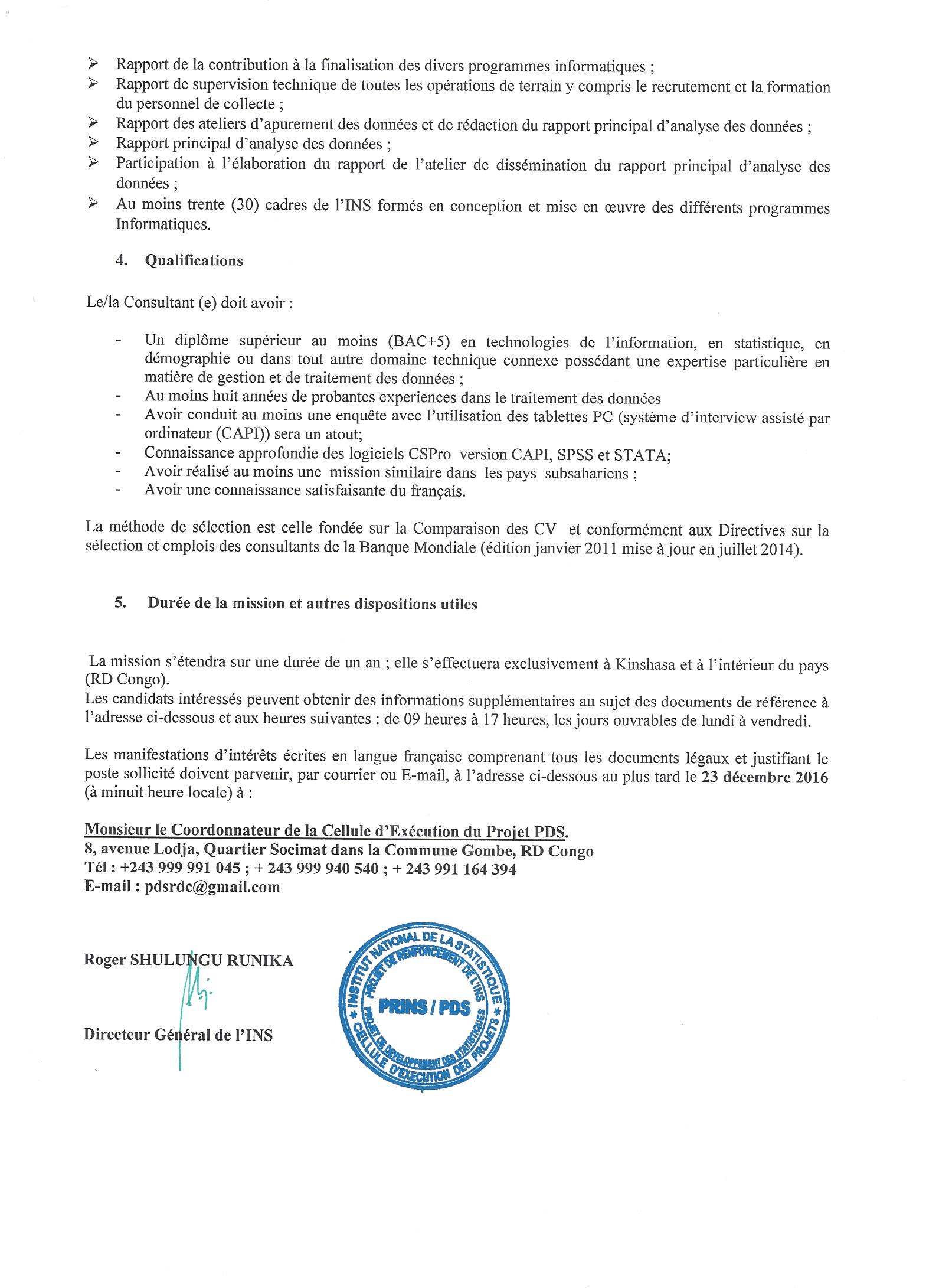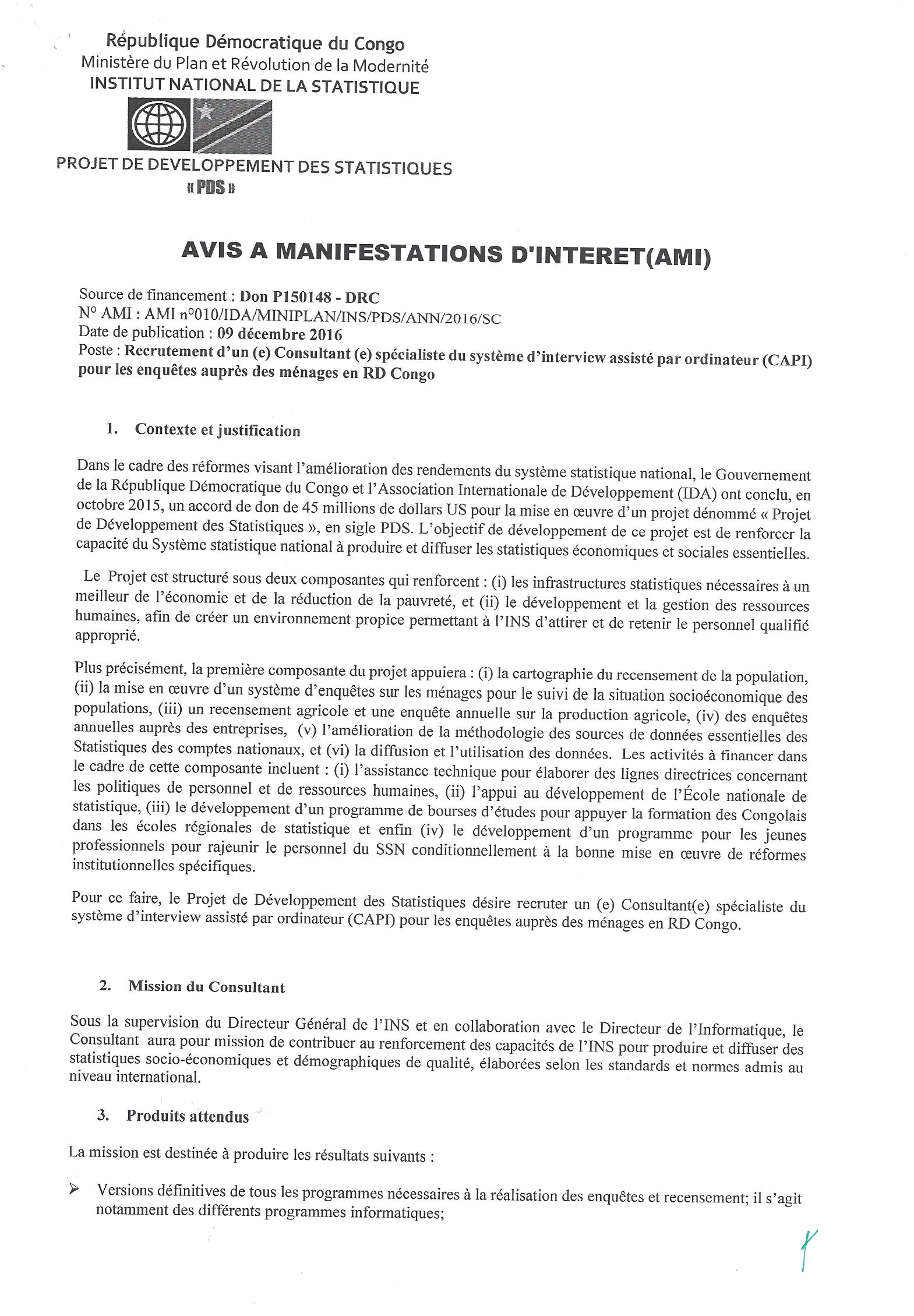 Recrutement d’un (e) Consultant (e) spécialiste du système d’interview assisté par ordinateur pour les enquêtes auprès des ménages en RD Congo.