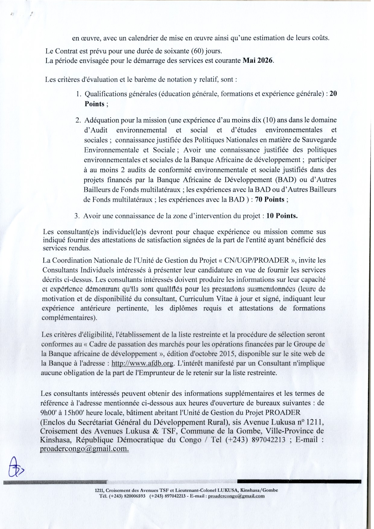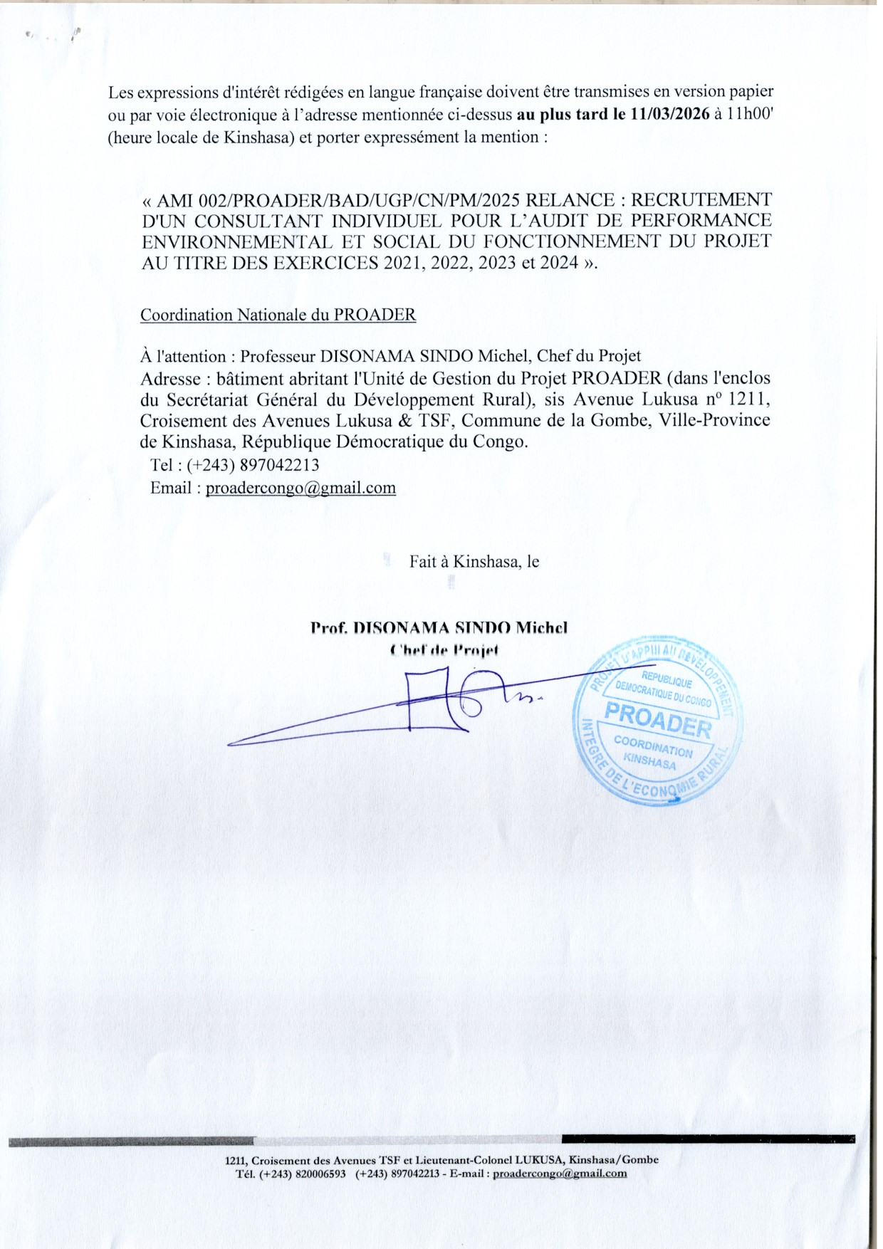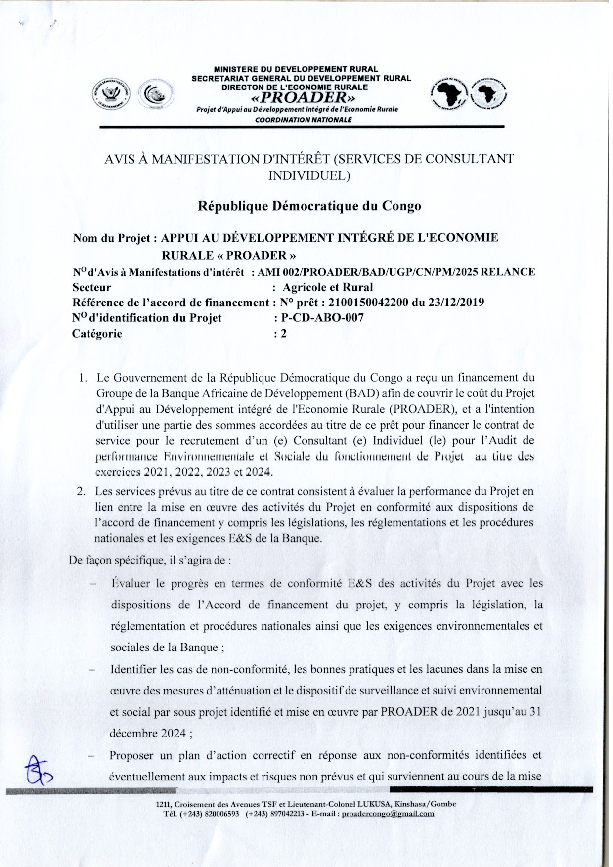 Recrutement d’un (e)consultant (e) individuel (le) pour l’audit de performance Environnementale et sociale du Fonctionnement de Projet au titre des exercices 2021, 2022, 2023 et 2024.
