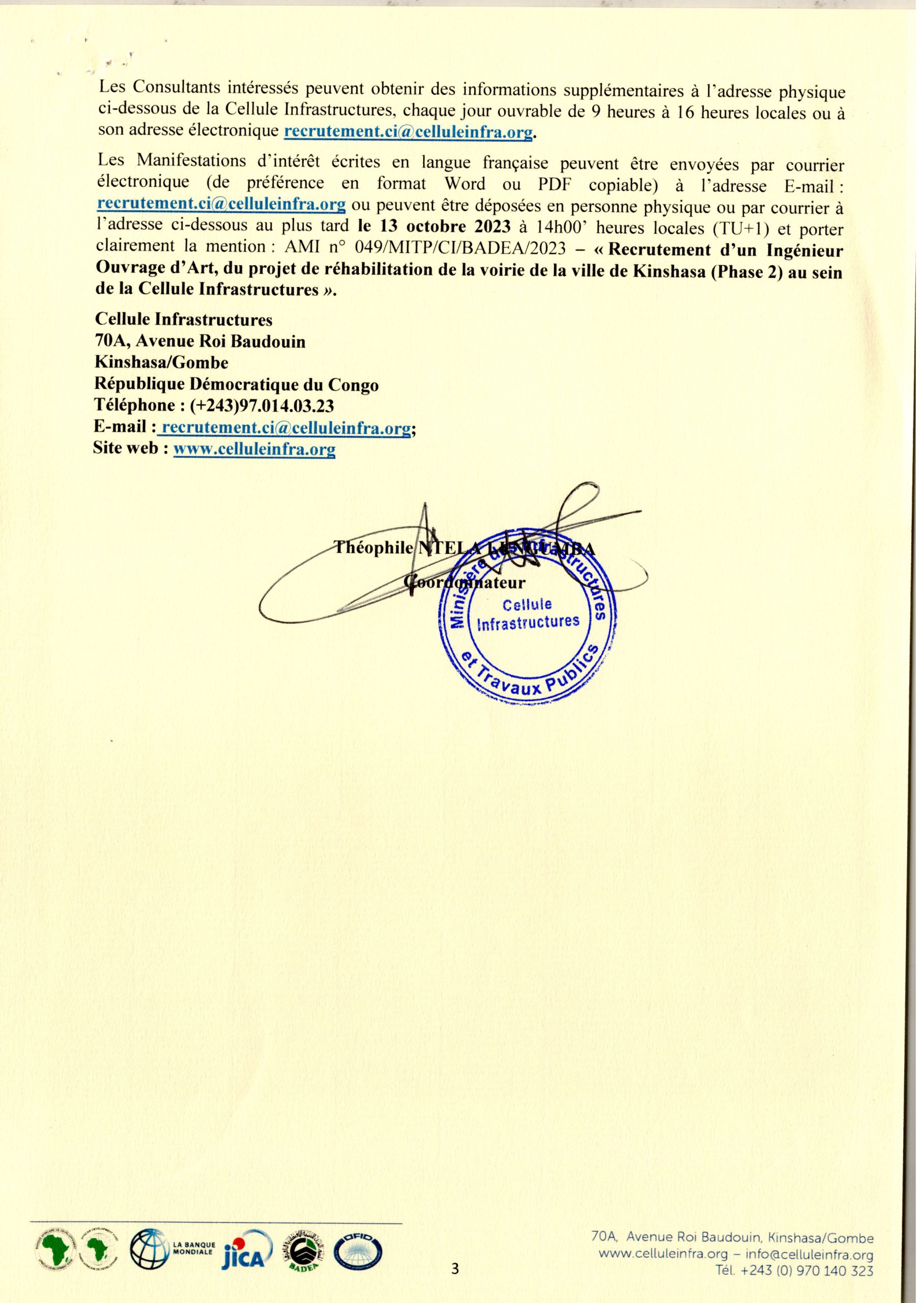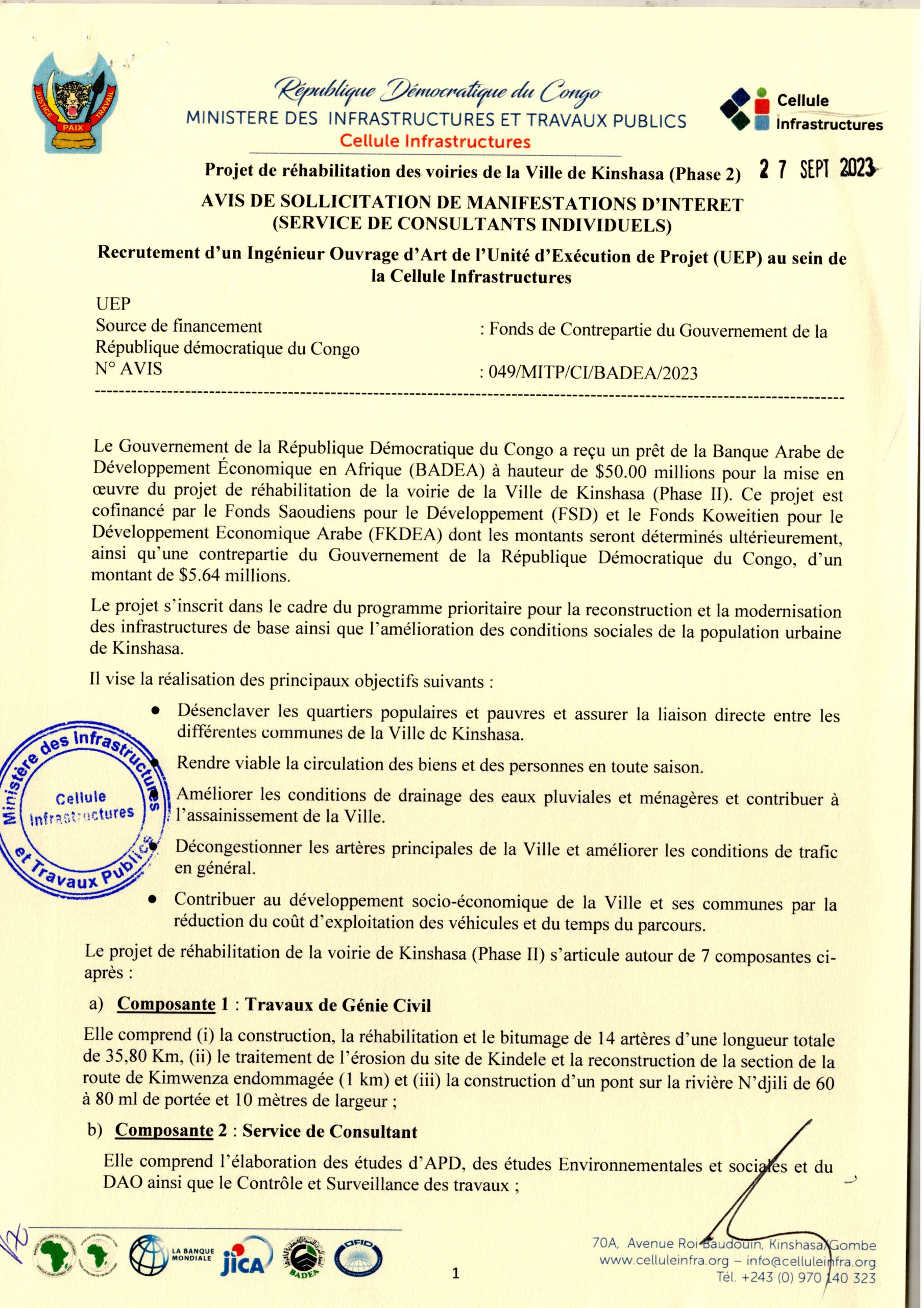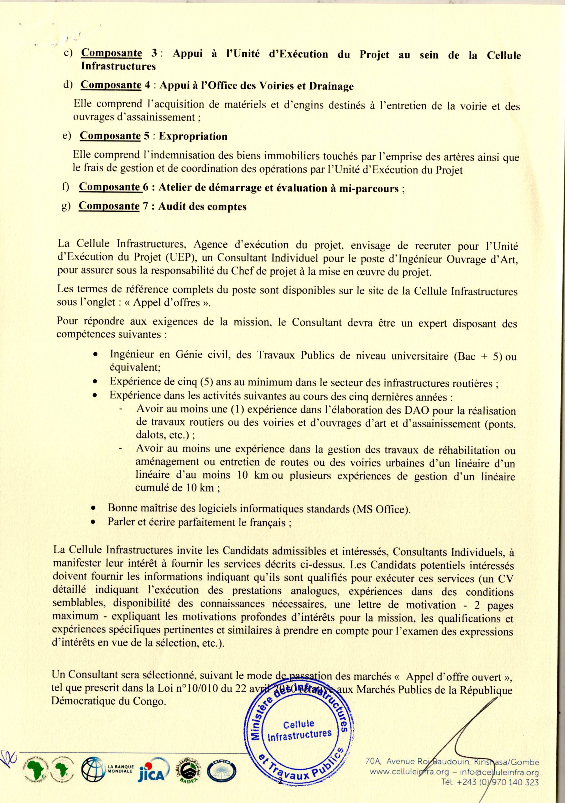 Recrutement d’un Ingénieur Ouvrage d’Art de l’Unité d’Exécution de Projet (UEP) au sein de la Cellule Infrastructures