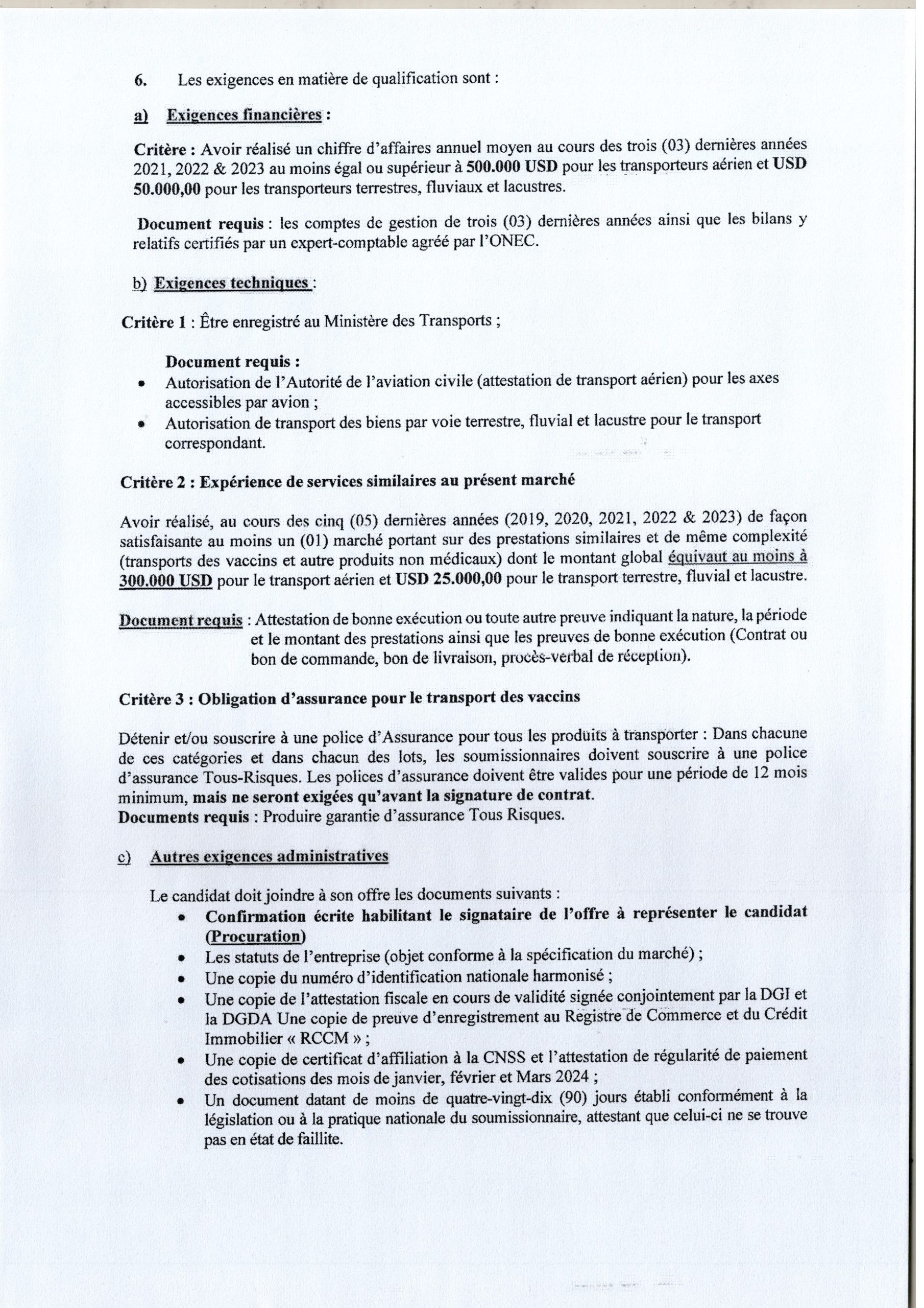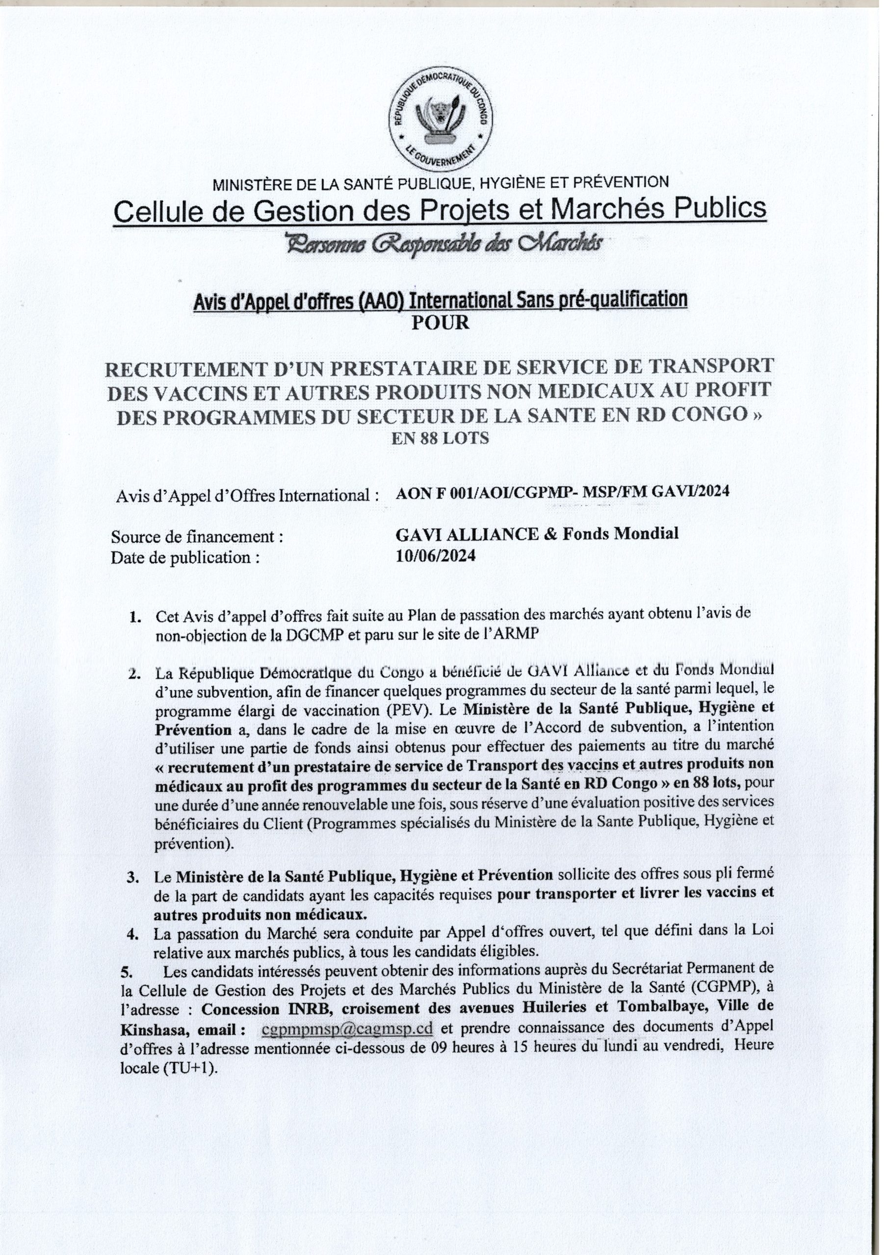 Recrutement d’un prestataire de service de transport des vaccins et autres produits non médicaux au profit des programmes du secteur de la santé en RD Congo ” En 88 Lots “