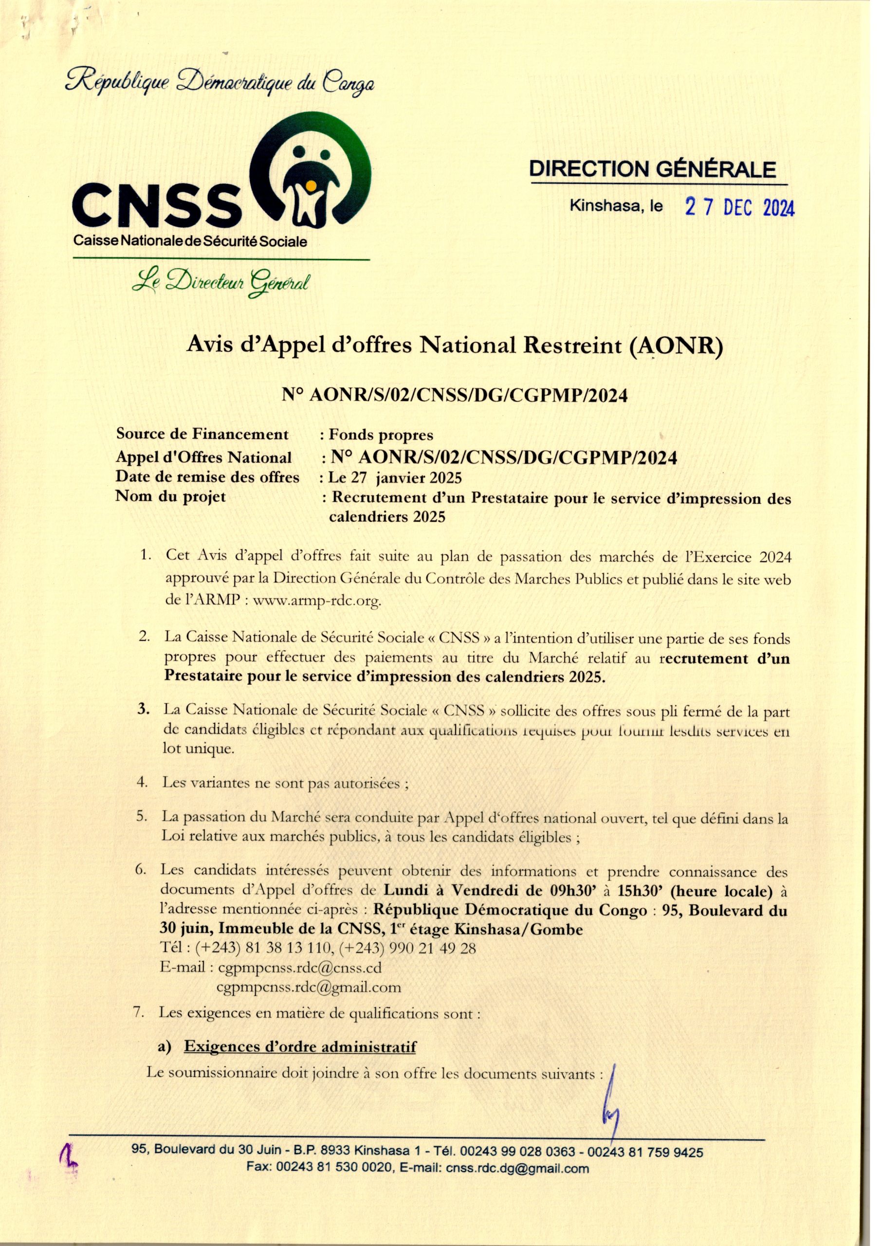 Recrutement d’un prestataire pour le service d’impression des calendriers 2025.