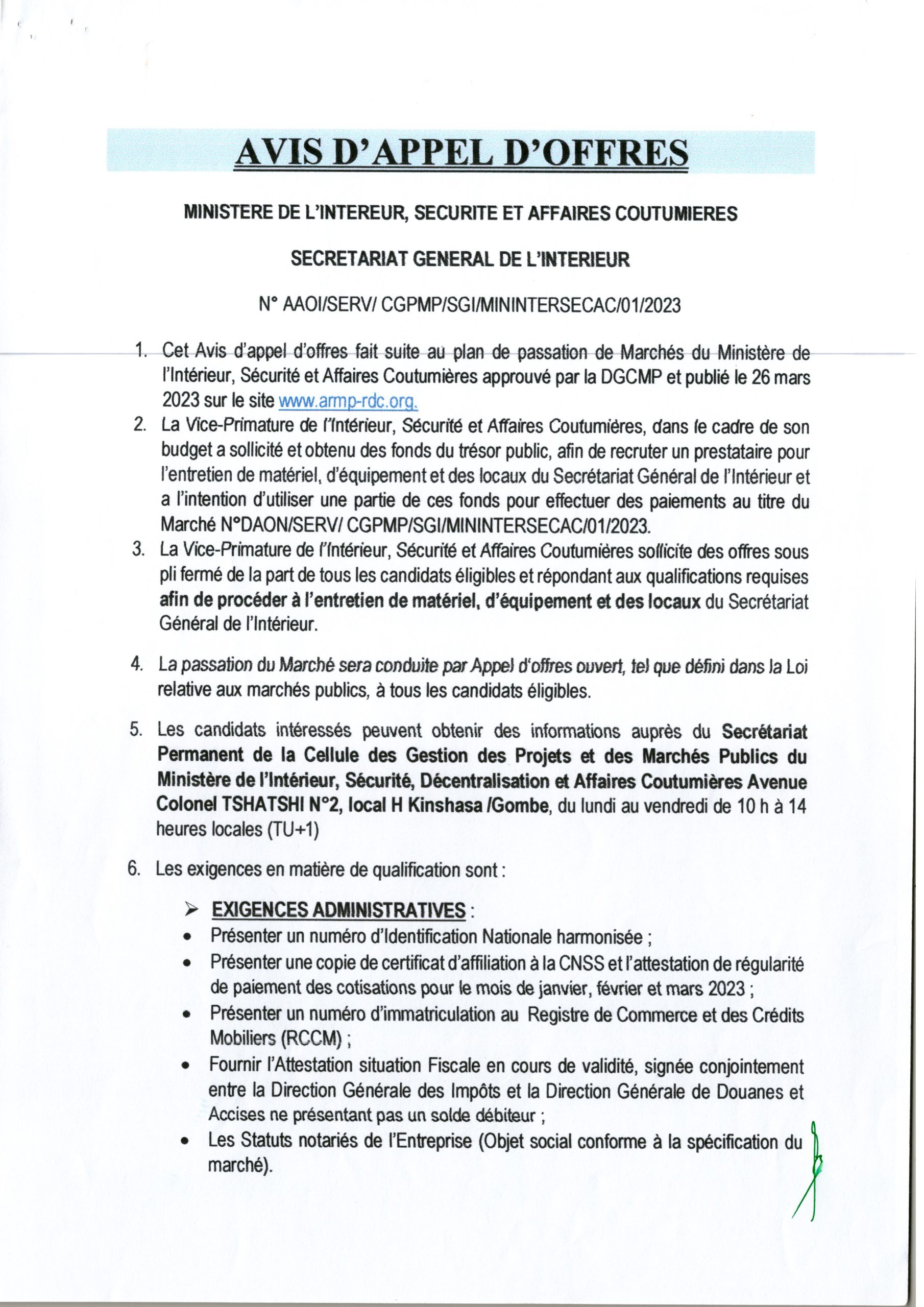 RECRUTEMENT D’UN PRESTATAIRE POUR L’ENTRETIEN DE MATÉRIEL ,D’ÉQUIPEMENT ET DES LOCAUX DU SECRÉTARIAT GÉNÉRAL DE L’INTÉRIEUR.
