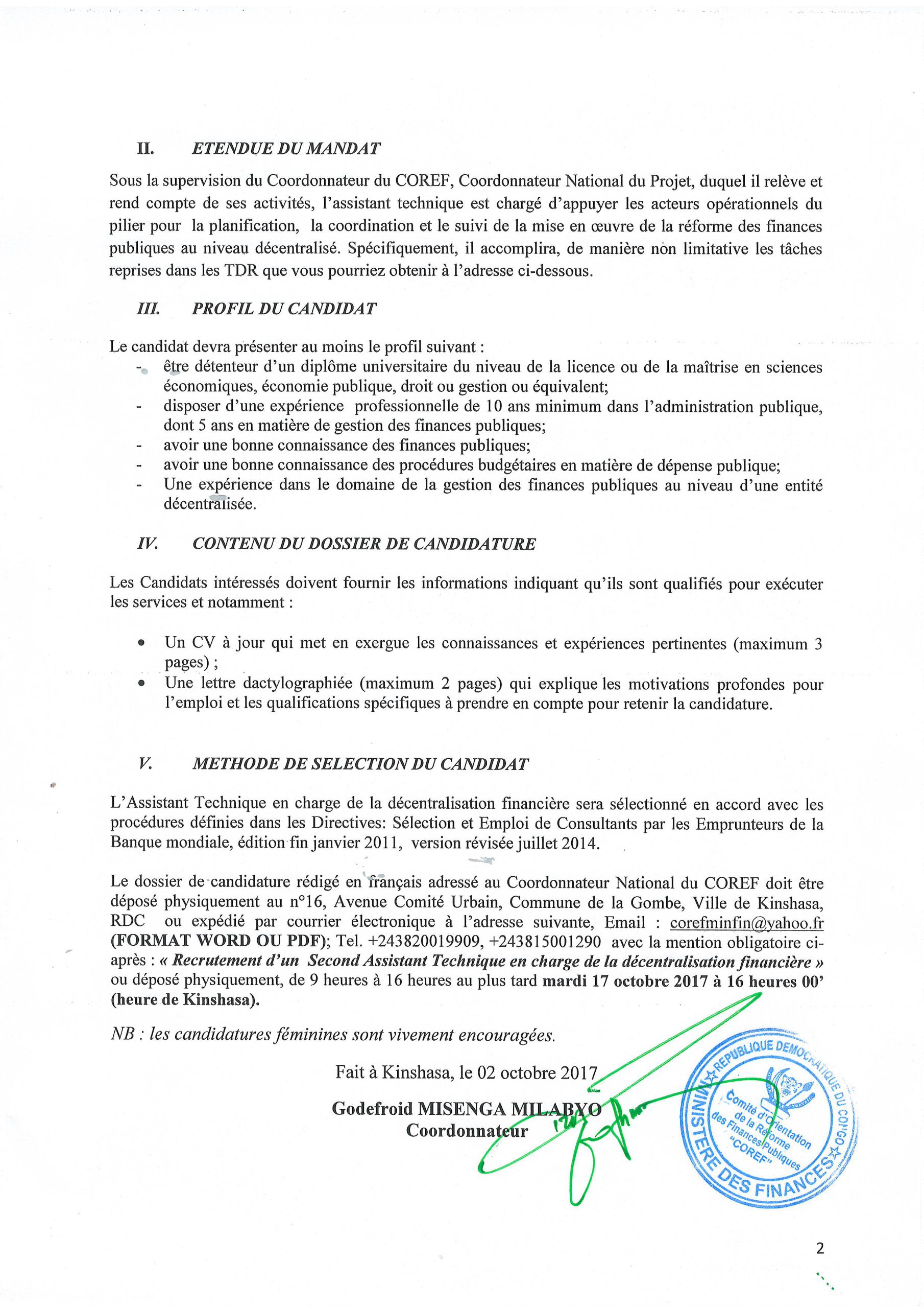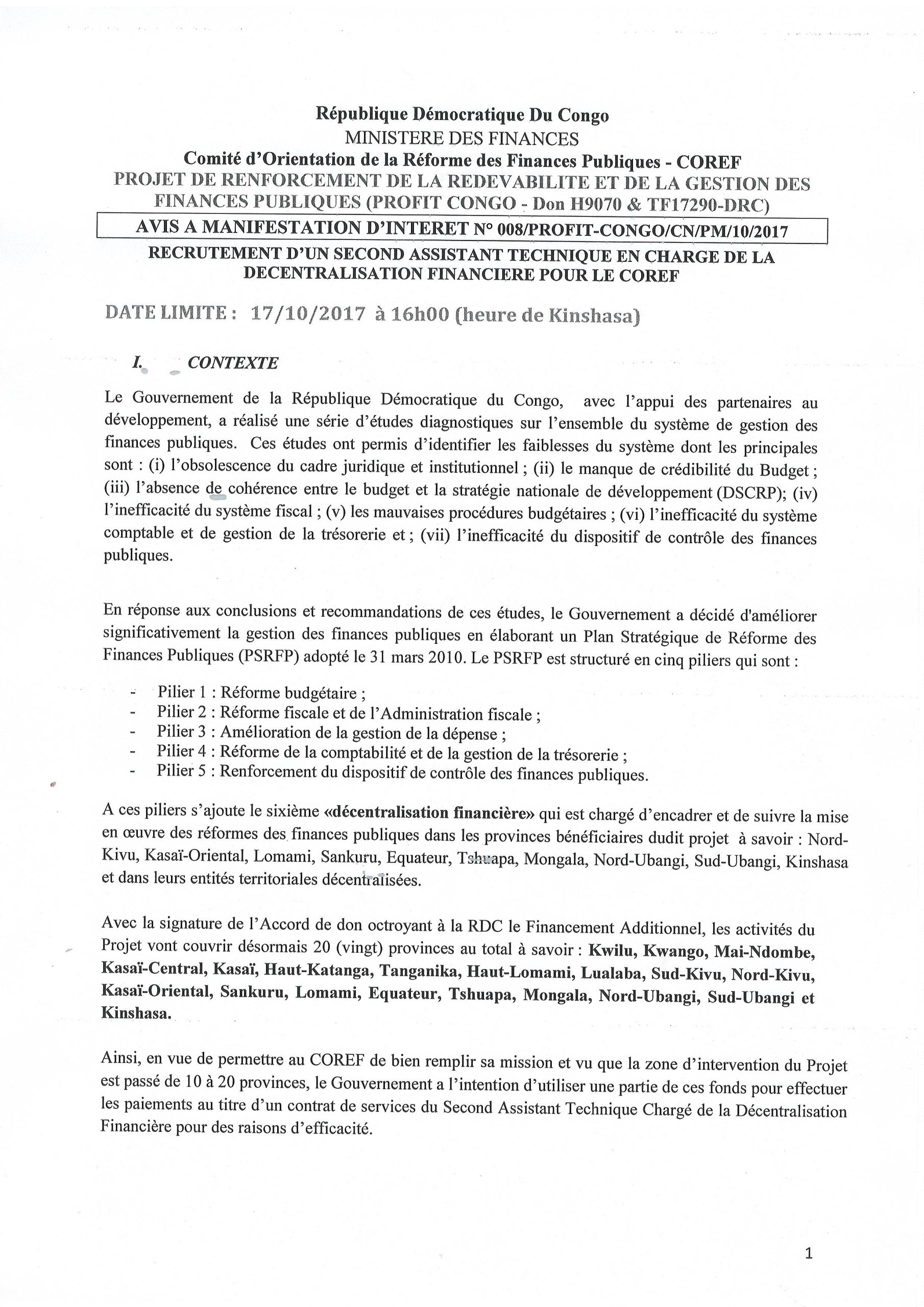 Recrutement d’un second Assistant Technique en Charge de la décentralisation Financière pour le COREF.