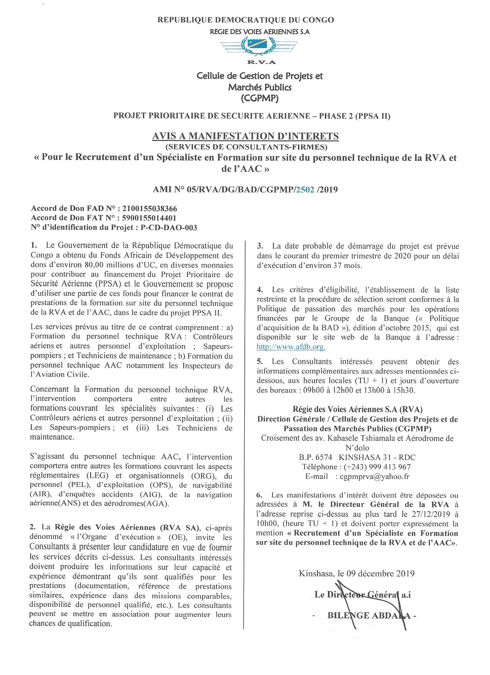 RECRUTEMENT D’UN SPÉCIALISTE EN FORMATION SUR SITE DU PERSONNEL TECHNIQUE DE LA RVA ET DE L’AAC.
