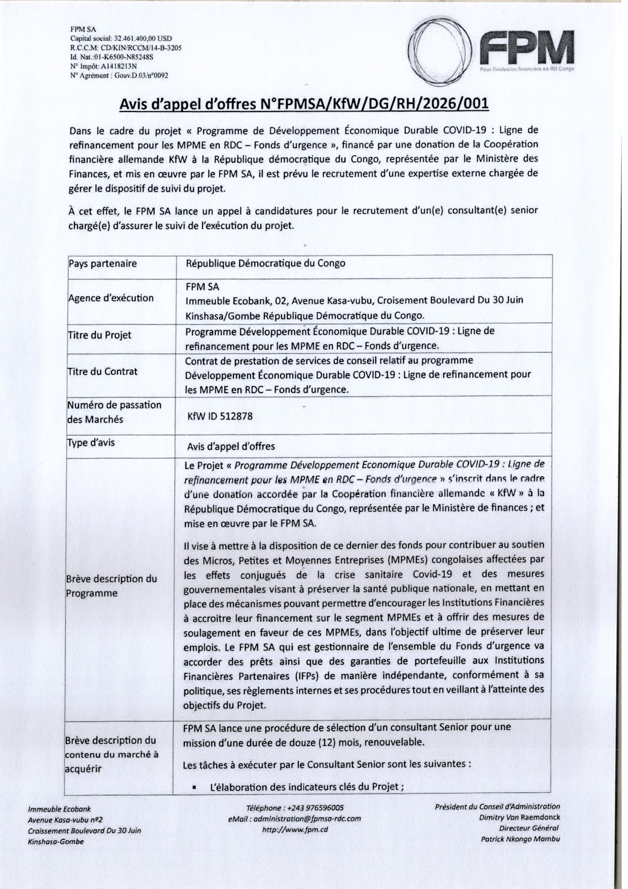 Recrutement d’une expertise externe chargée de gérer le dispositif de suivi du projet (“Programme de Développement Economique Durable COVID-19 : ligne de financement pour les MPME en RDC”).