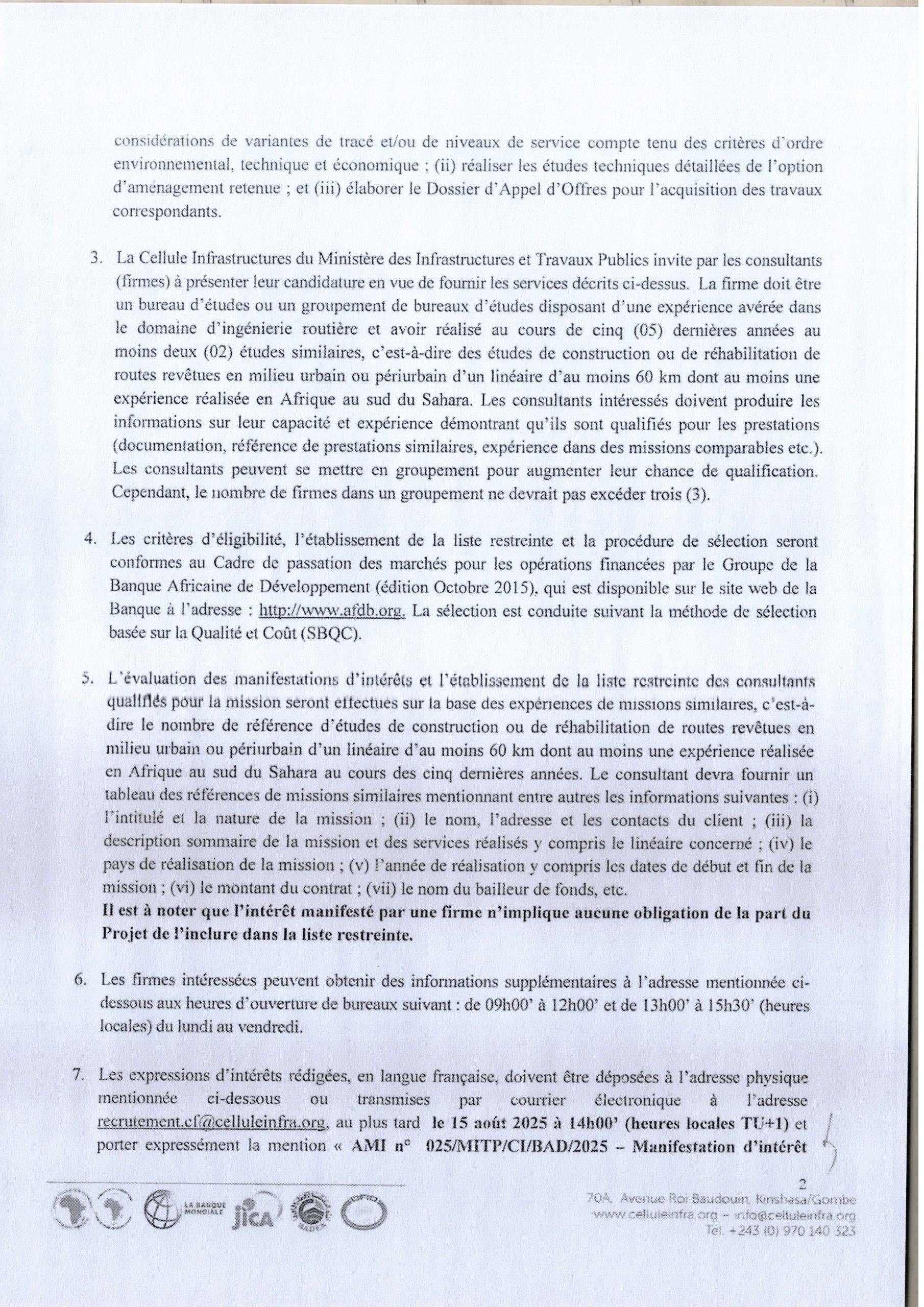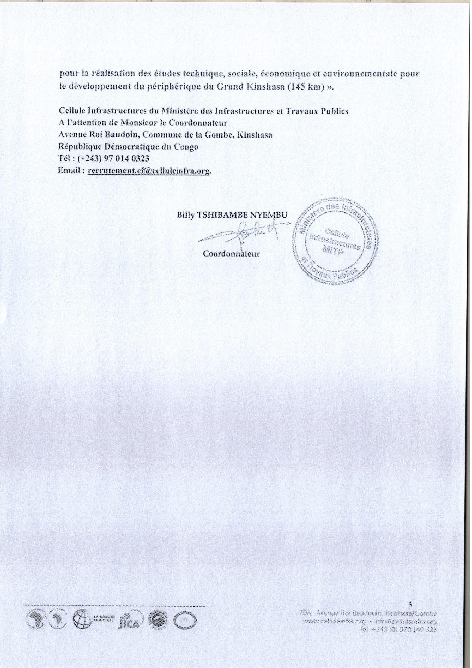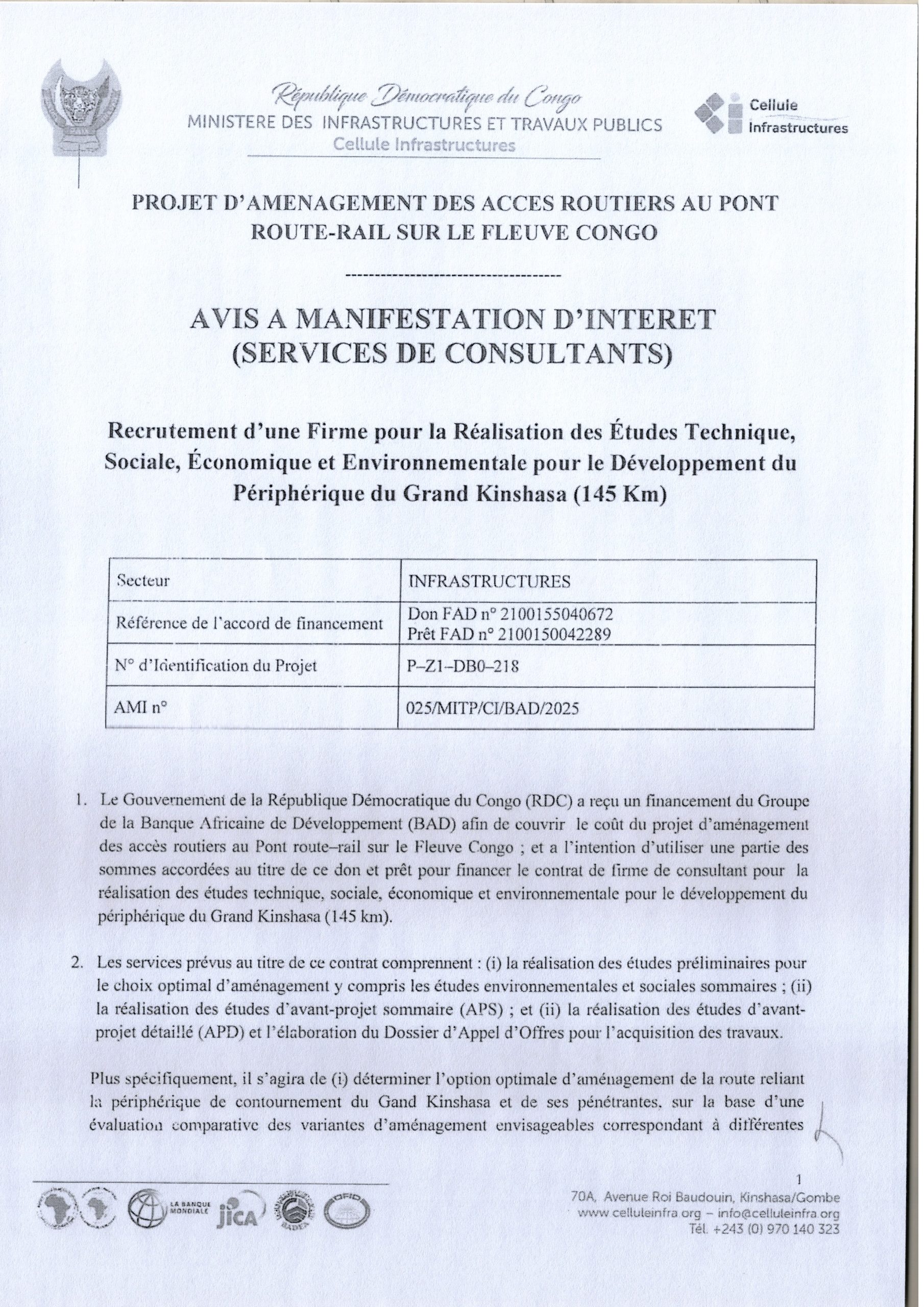 Recrutement d’une firme pour la réalisation des études techniques, sociales, économiques et environnementales pour le développement du périphérique du grand Kinshasa (145Km).