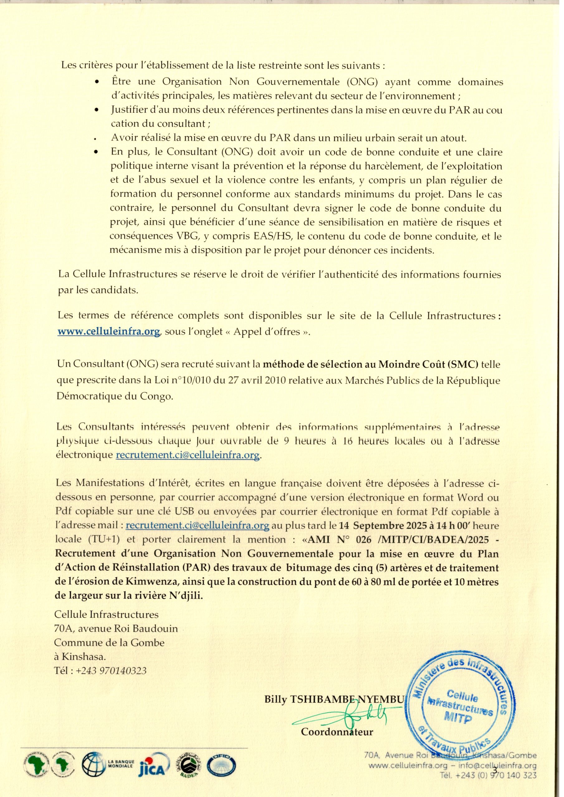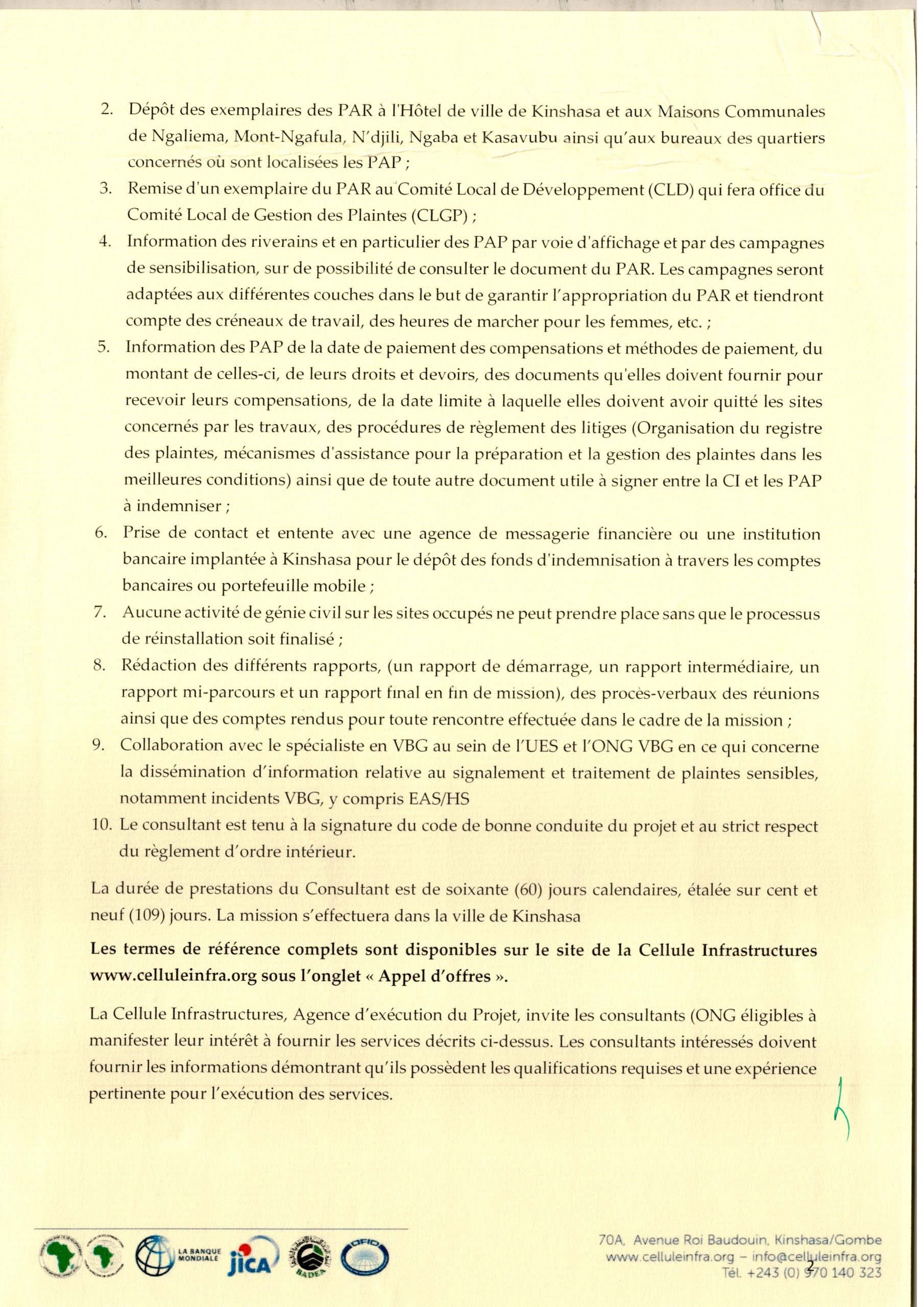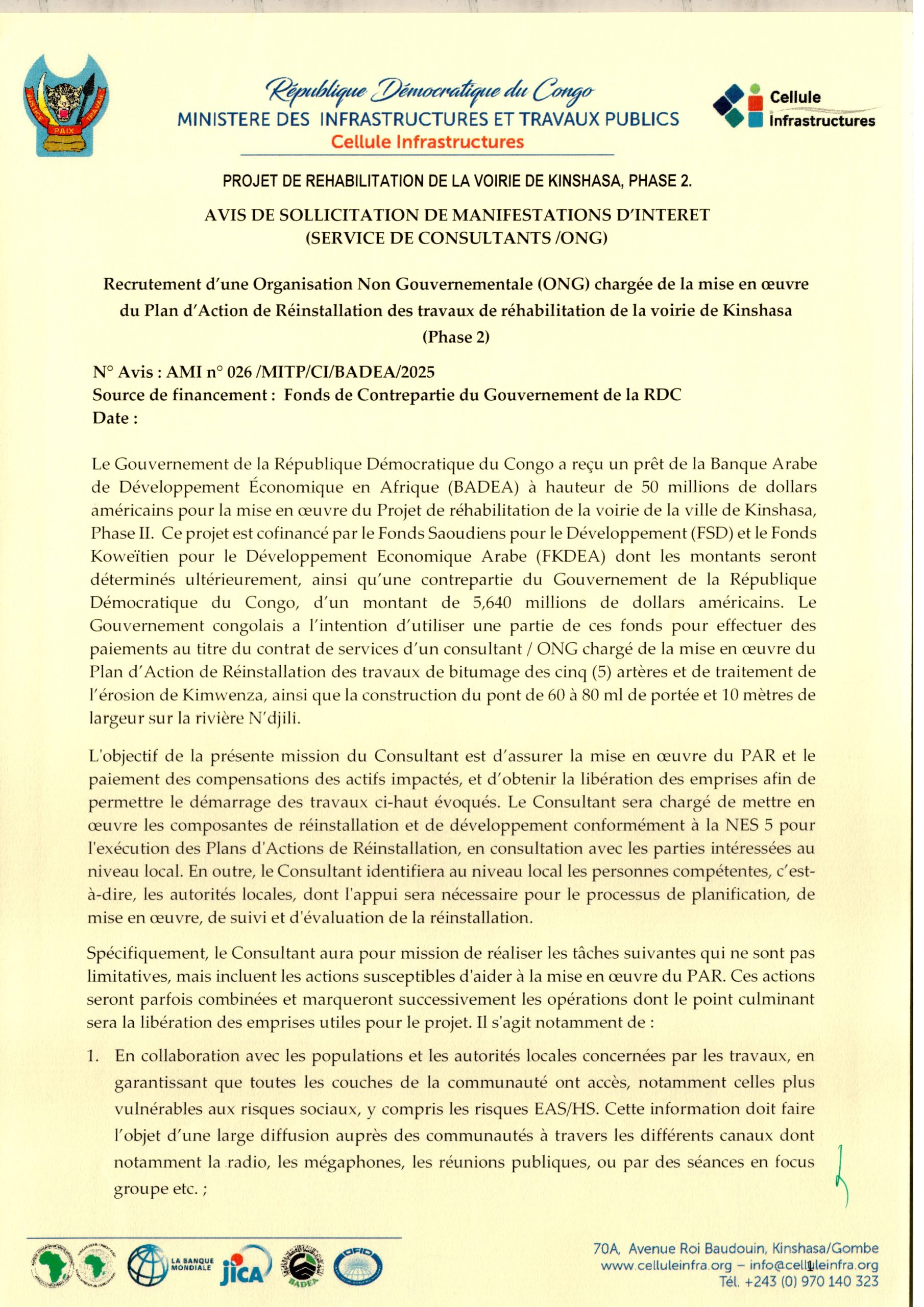 Recrutement d’une organisation Non Gouvernementale (ONG) chargée de la mise en œuvre du Plan d’Action de Réinstallation des travaux de réhabilitation de la voirie de Kinshasa (Phase 2)