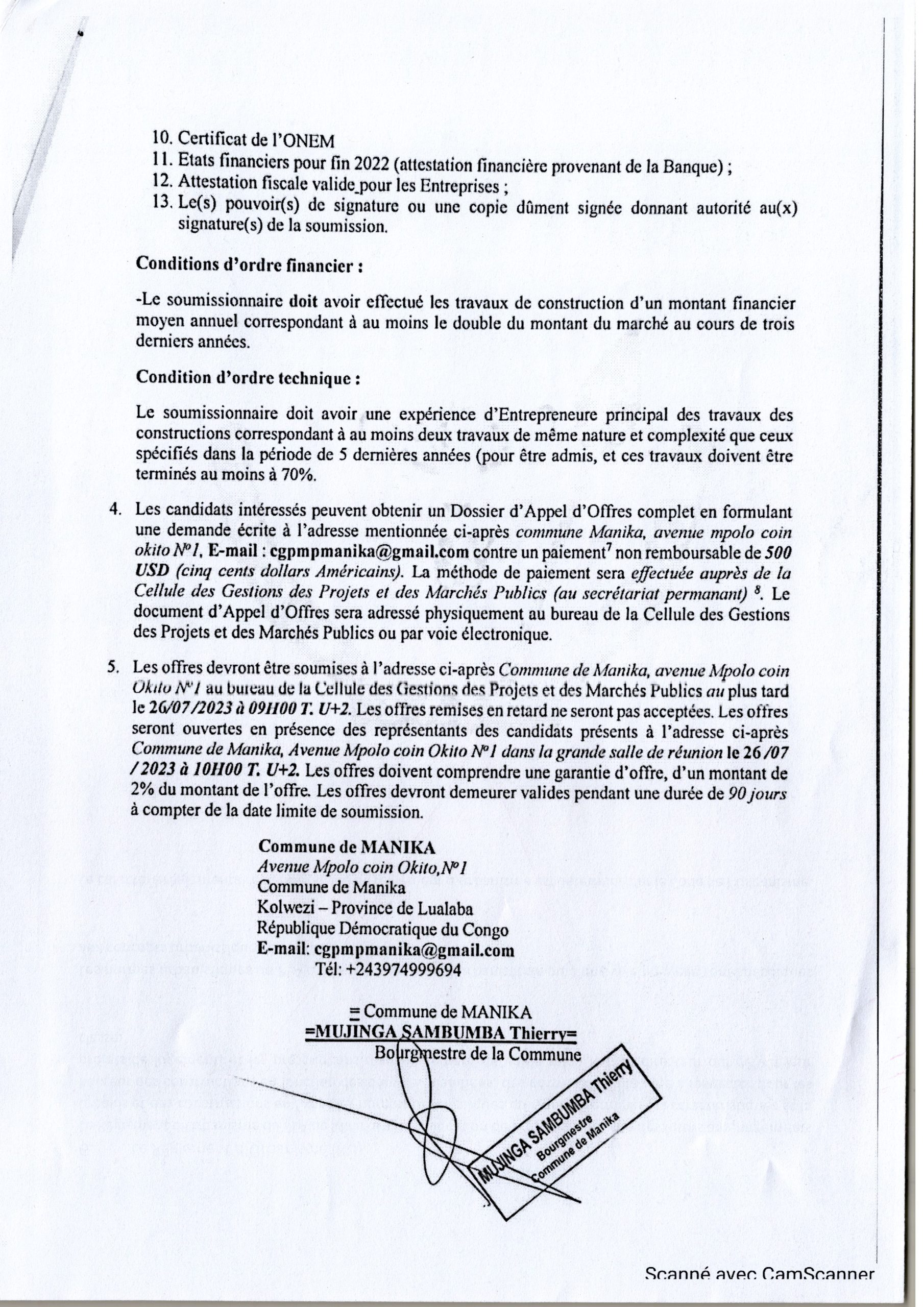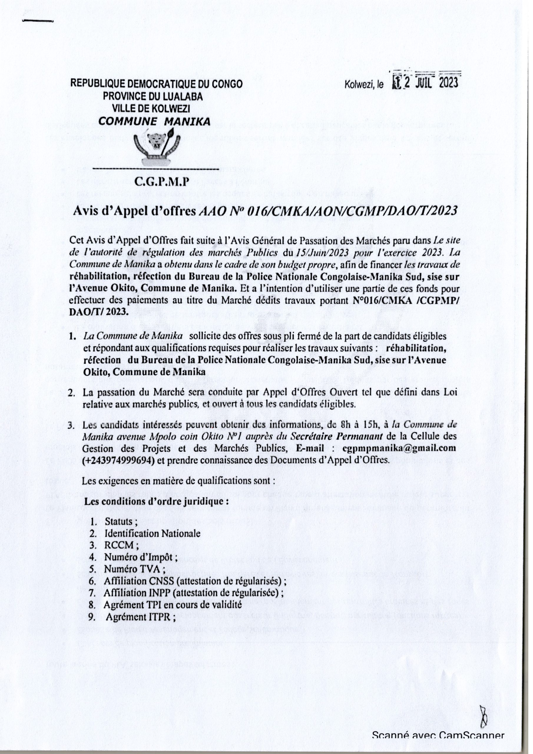 RÉHABILITATION, RÉFECTION DU BUREAU DE LA POLICE NATIONAL CONGOLAISE -MANIKA SUD, SISE SUR L’AVENUE OKITO, COMMUNE DE MANIKA.