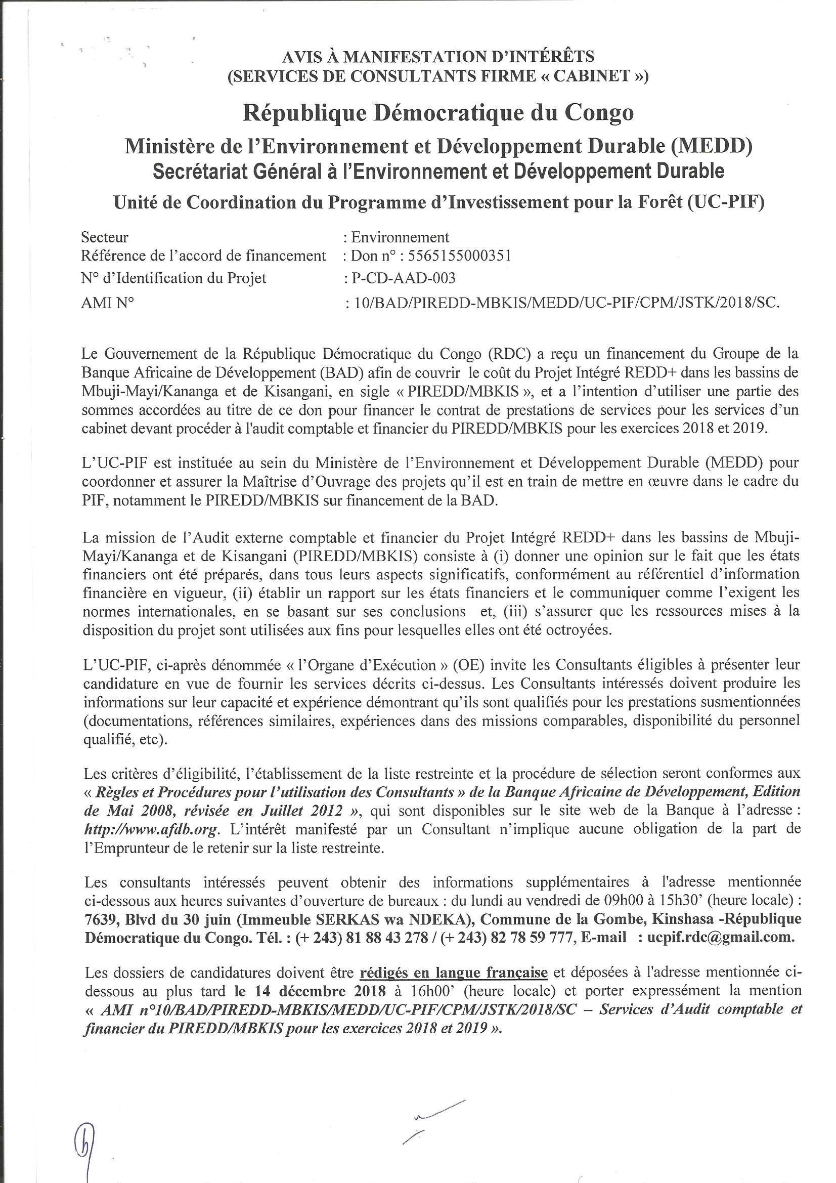 SERVICES D’AUDIT COMPTABLE ET FINANCIER DU PIREDD/MBKIS POUR LES EXERCICES 2018 ET 2018.