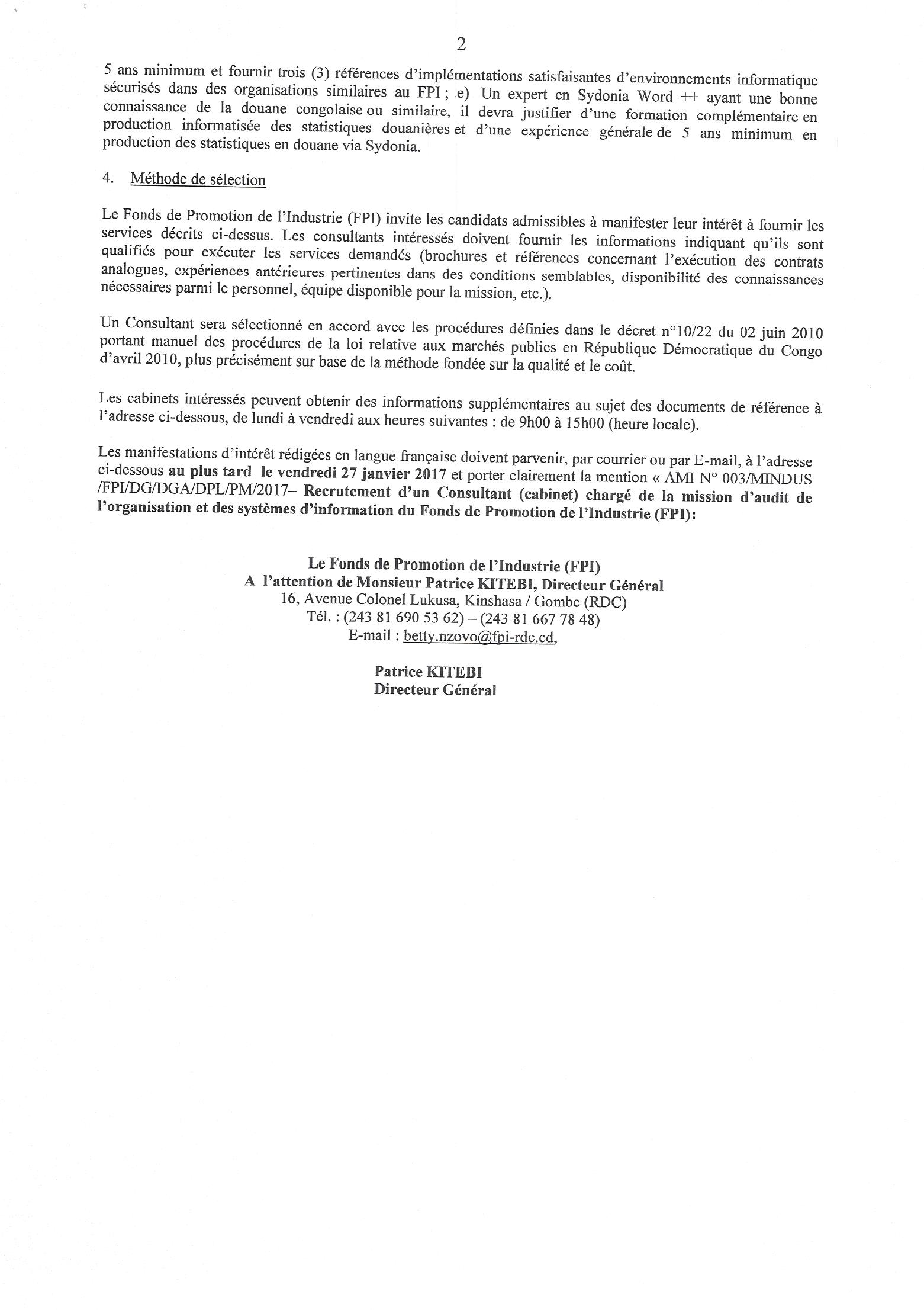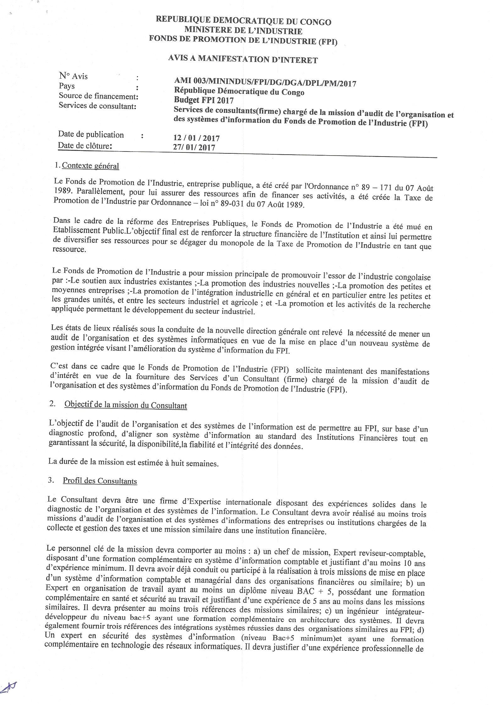 Services de consultant chargé de la mission d’audit de l’organisation et des systèmes d’information du Fonds de Promotion de l’Industrie (FPI).