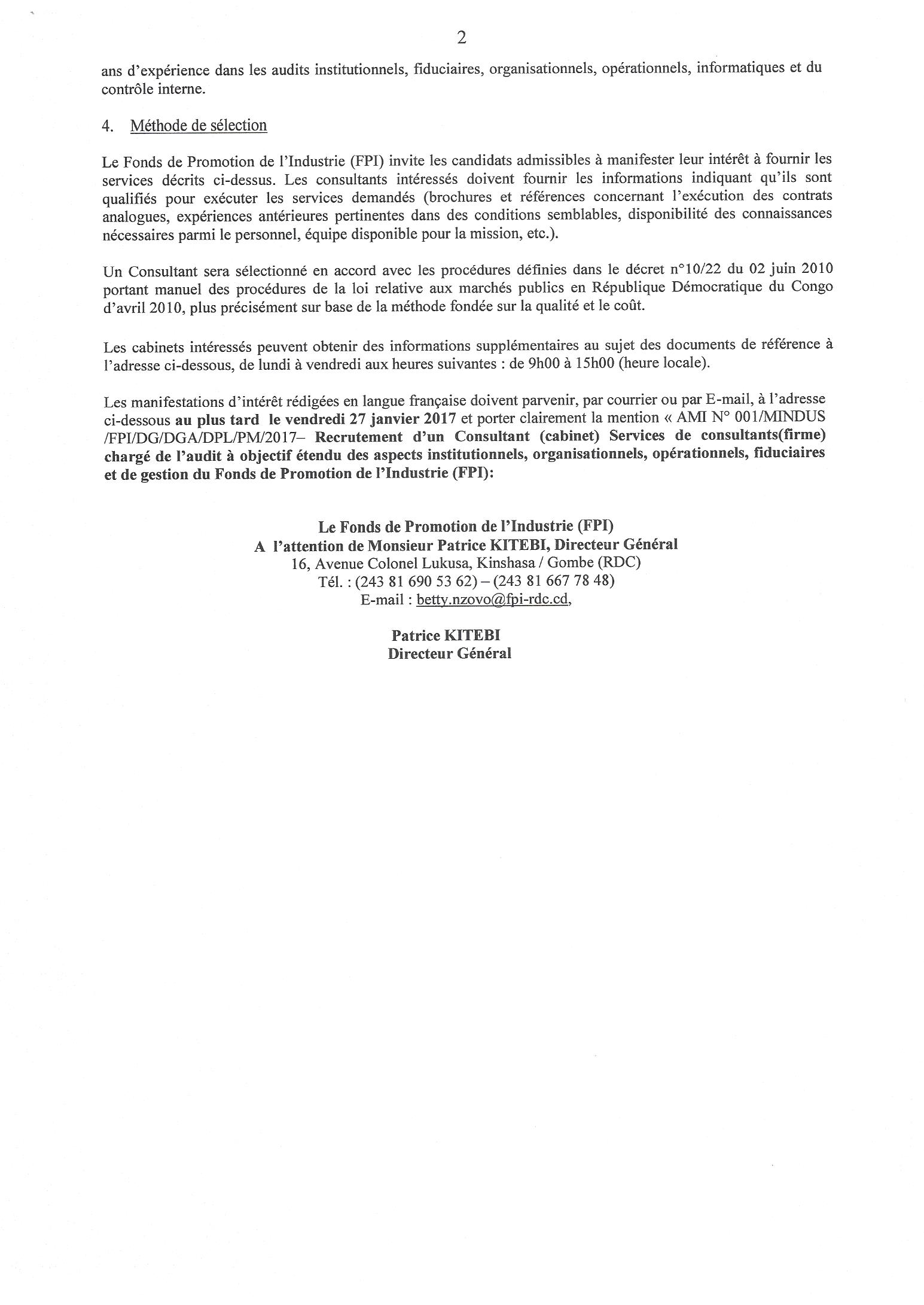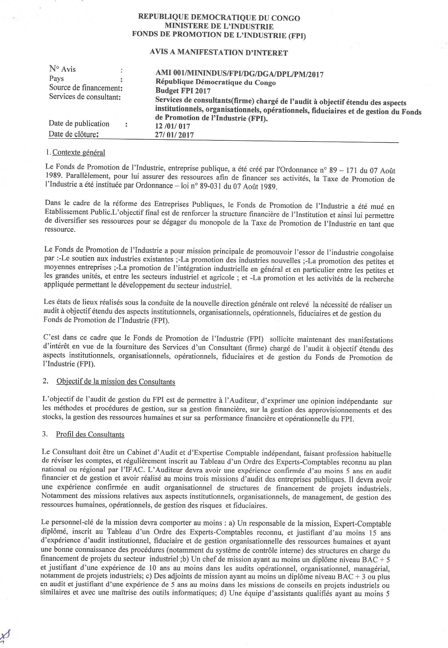 Services de consultant chargé de l’audit à objectif étendu des aspects institutionnels, organisationnels, fiduciaires et de gestion du Fonds de Promotion de l’Industrie (FPI).