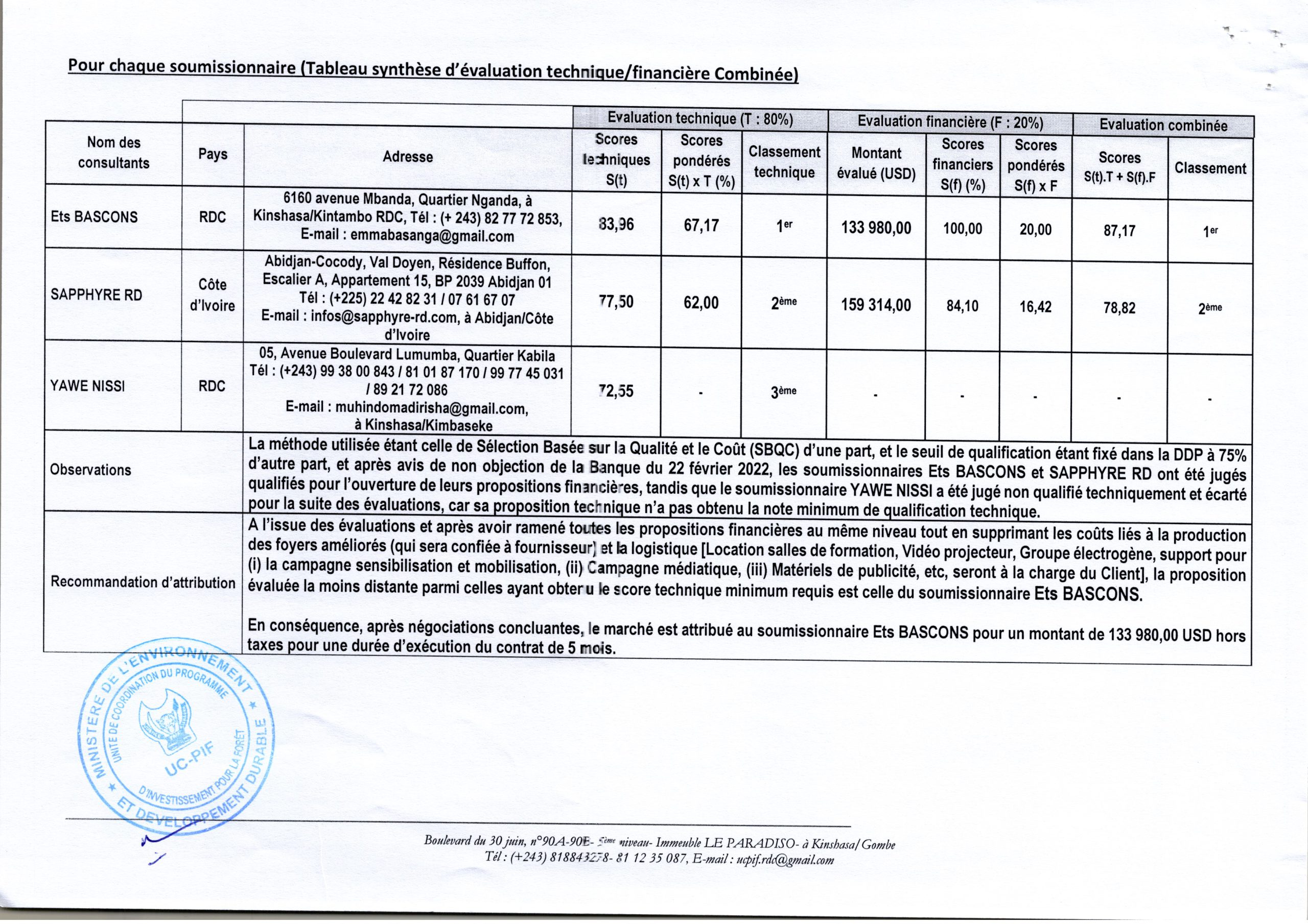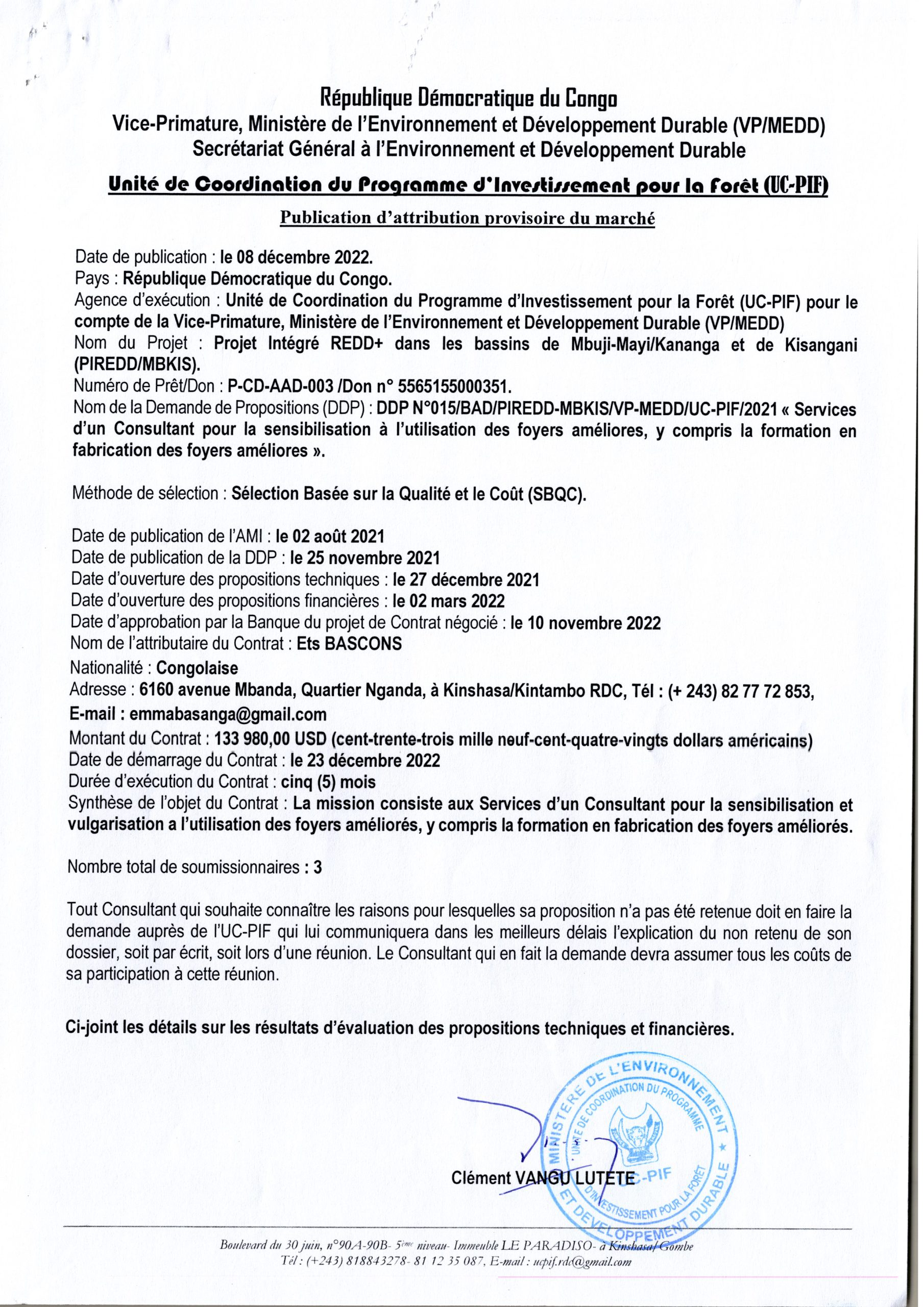Services d’un Consultant pour la sensibilisation à l’utilisation des foyers améliores, y compris la formation en fabrication des foyers améliores accordée à Ets BASCONS.