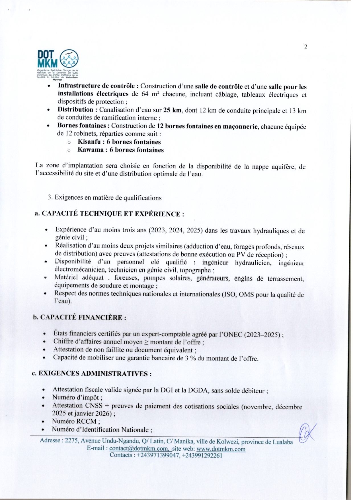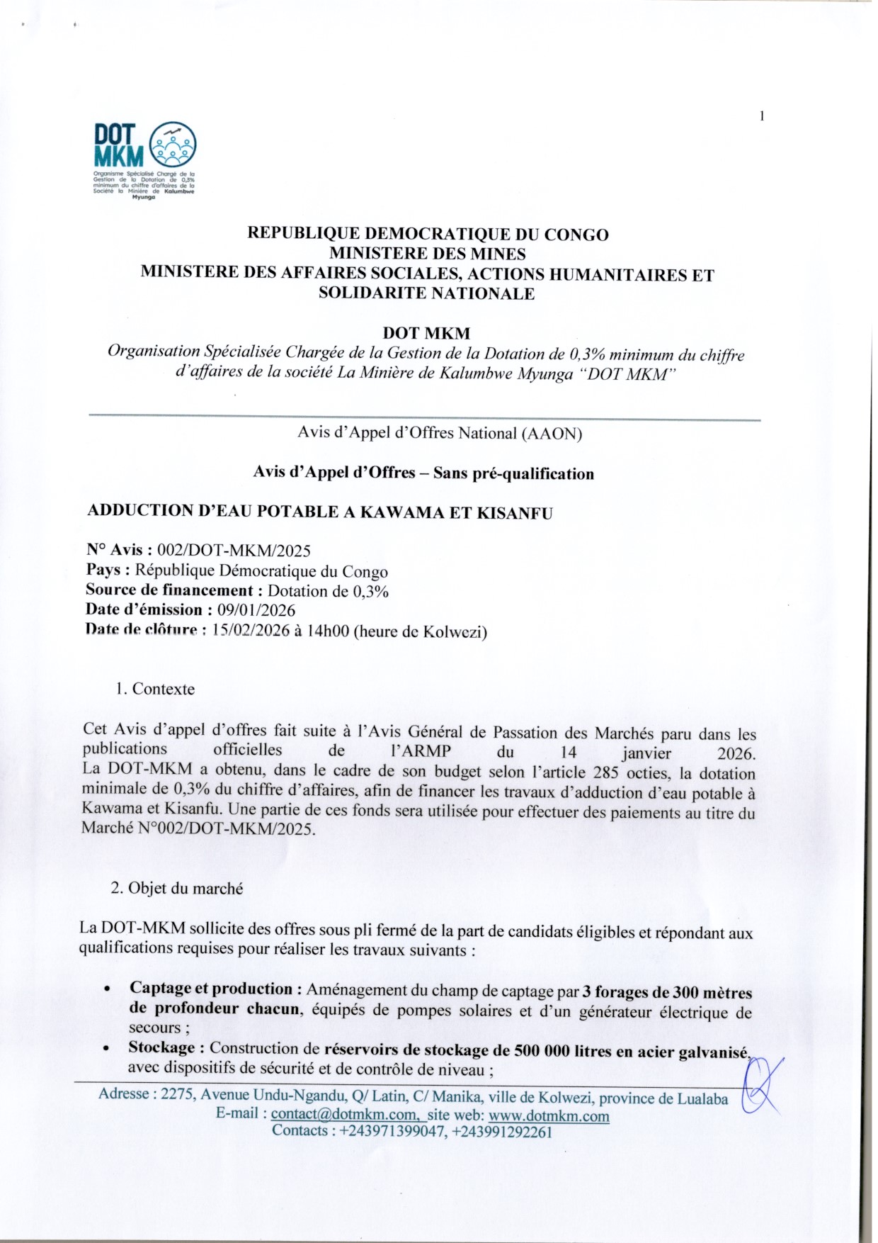 Travaux d’adduction d’eau potable à Kawama et Kisanfu