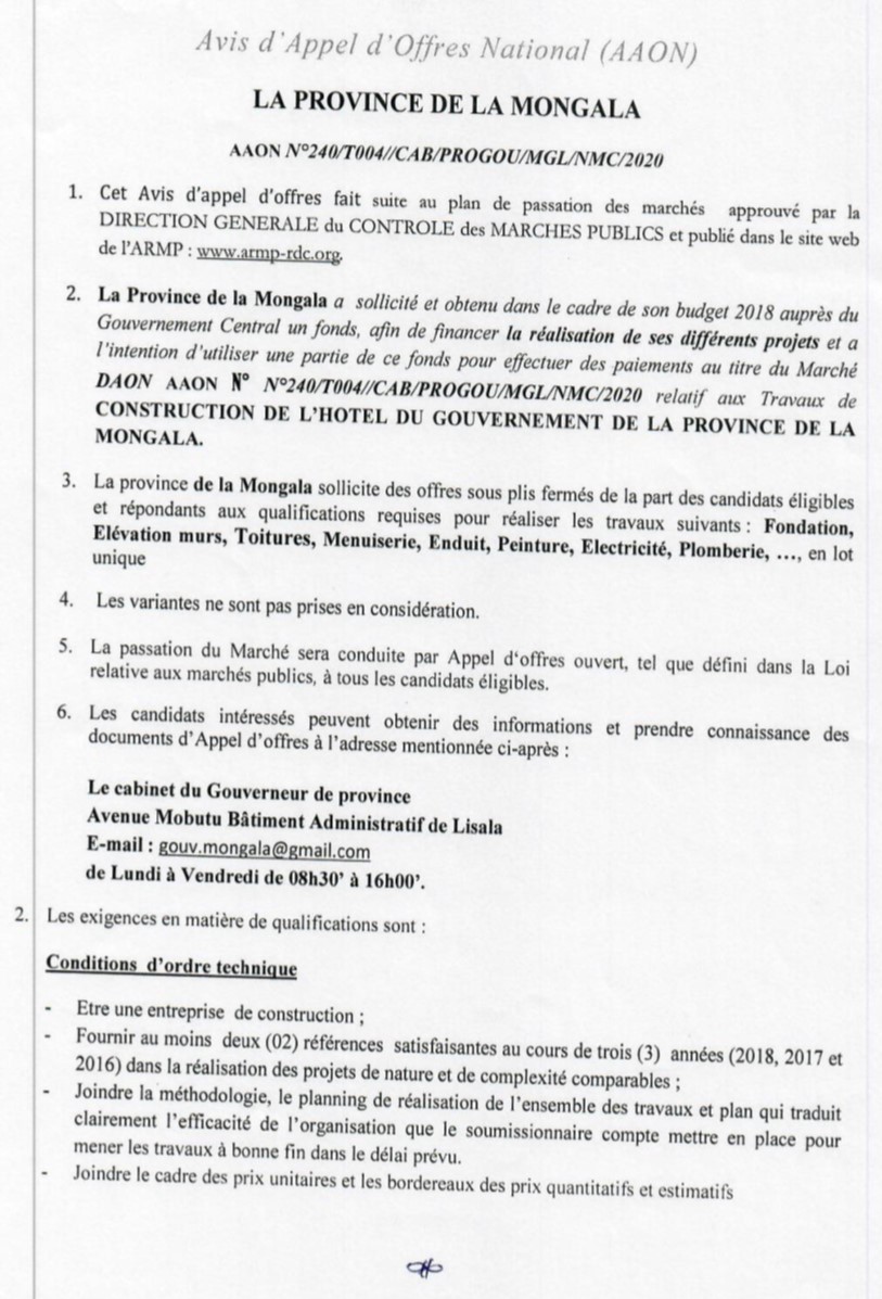 TRAVAUX DE CONSTRUCTION DE L’HOTEL DU GOUVERNEMENT DE LA PROVINCE DE LA MONGALA.