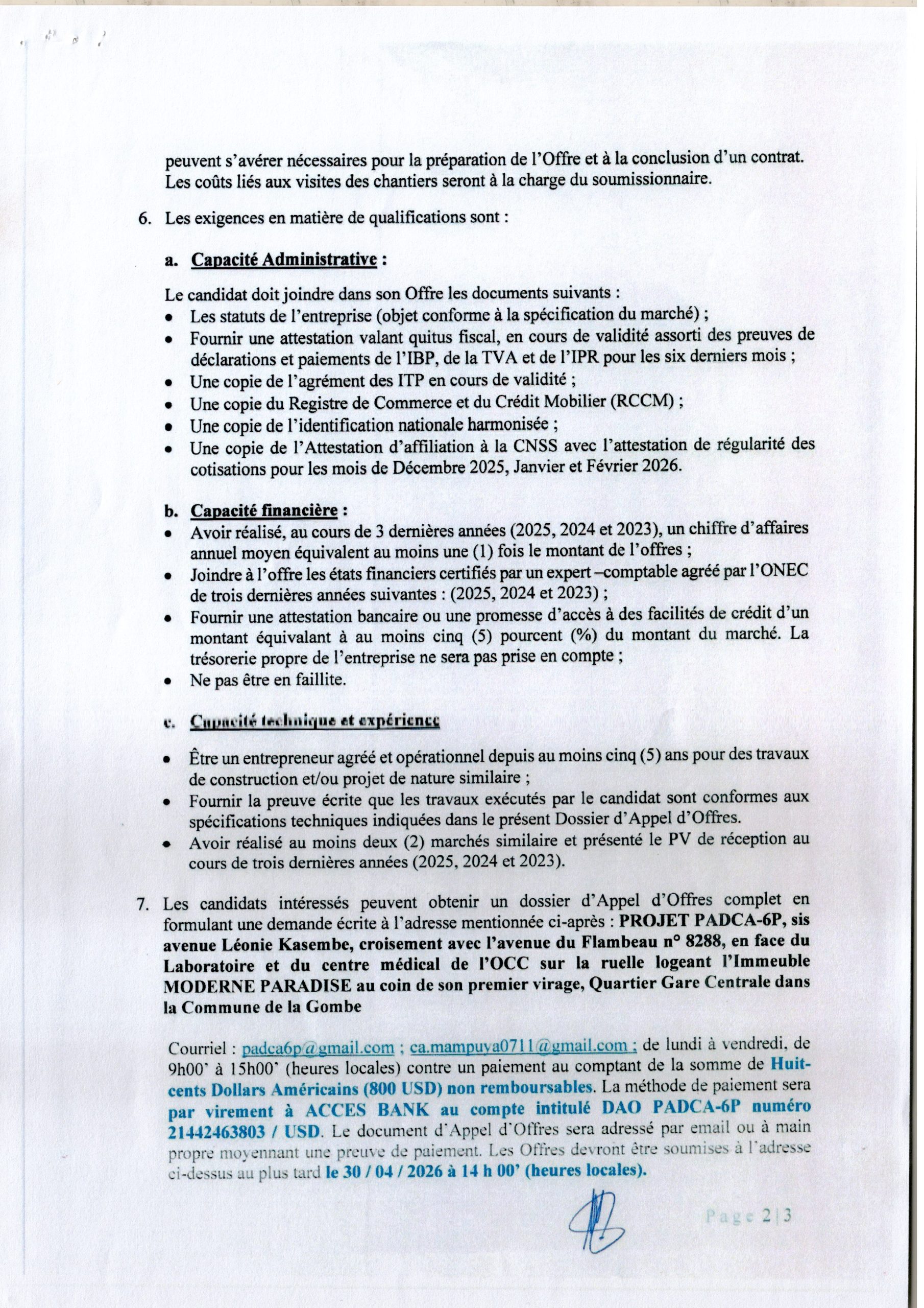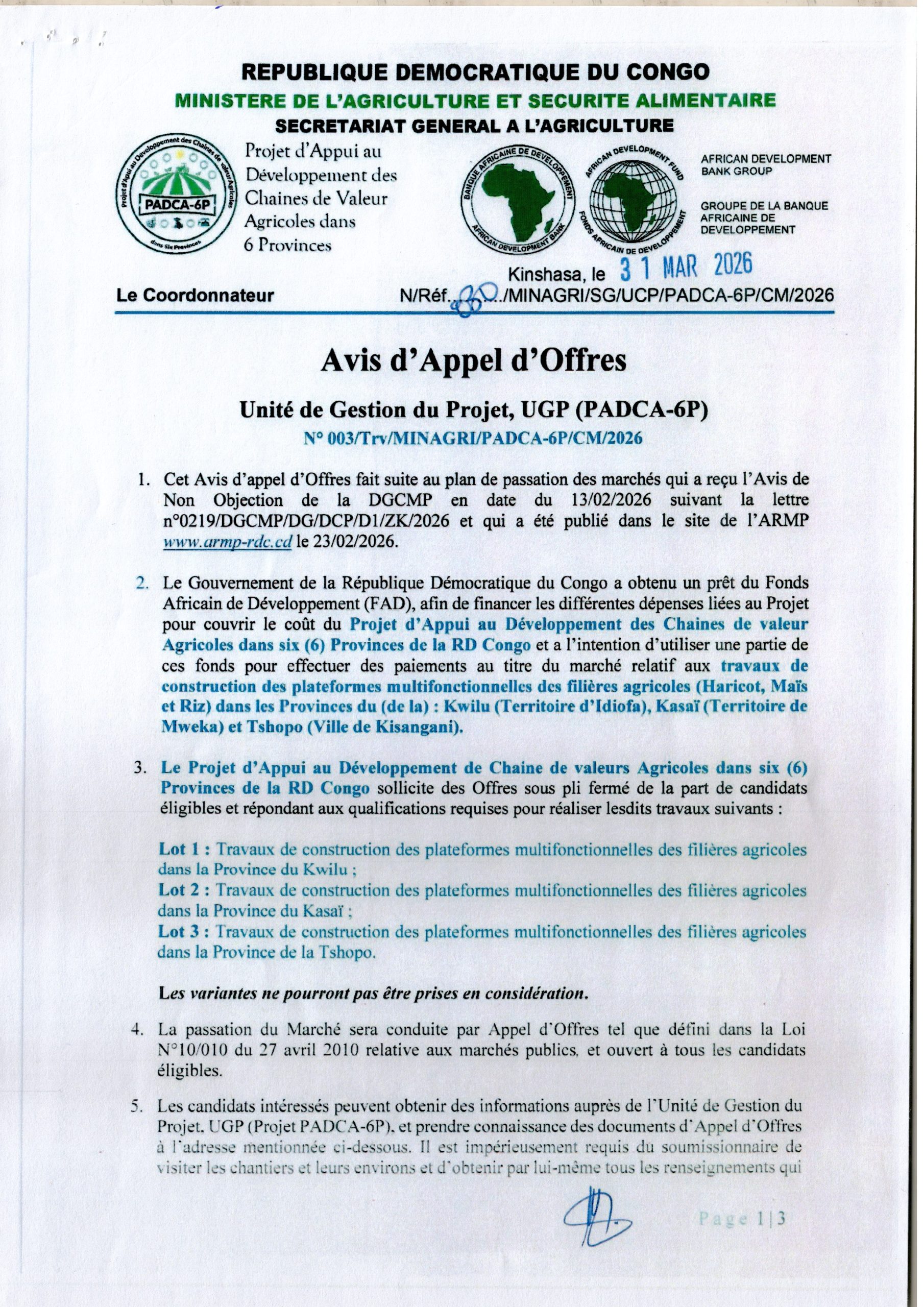 Travaux de construction des plateformes multifonctionnelles des filières agricoles (Haricot, Maïs, Riz) dans les Provinces du (de la) : Kwilu (Territoire d’Idiofa), Kasai (Territoire de Mweka) et Tshopo (Ville de Kisangani)