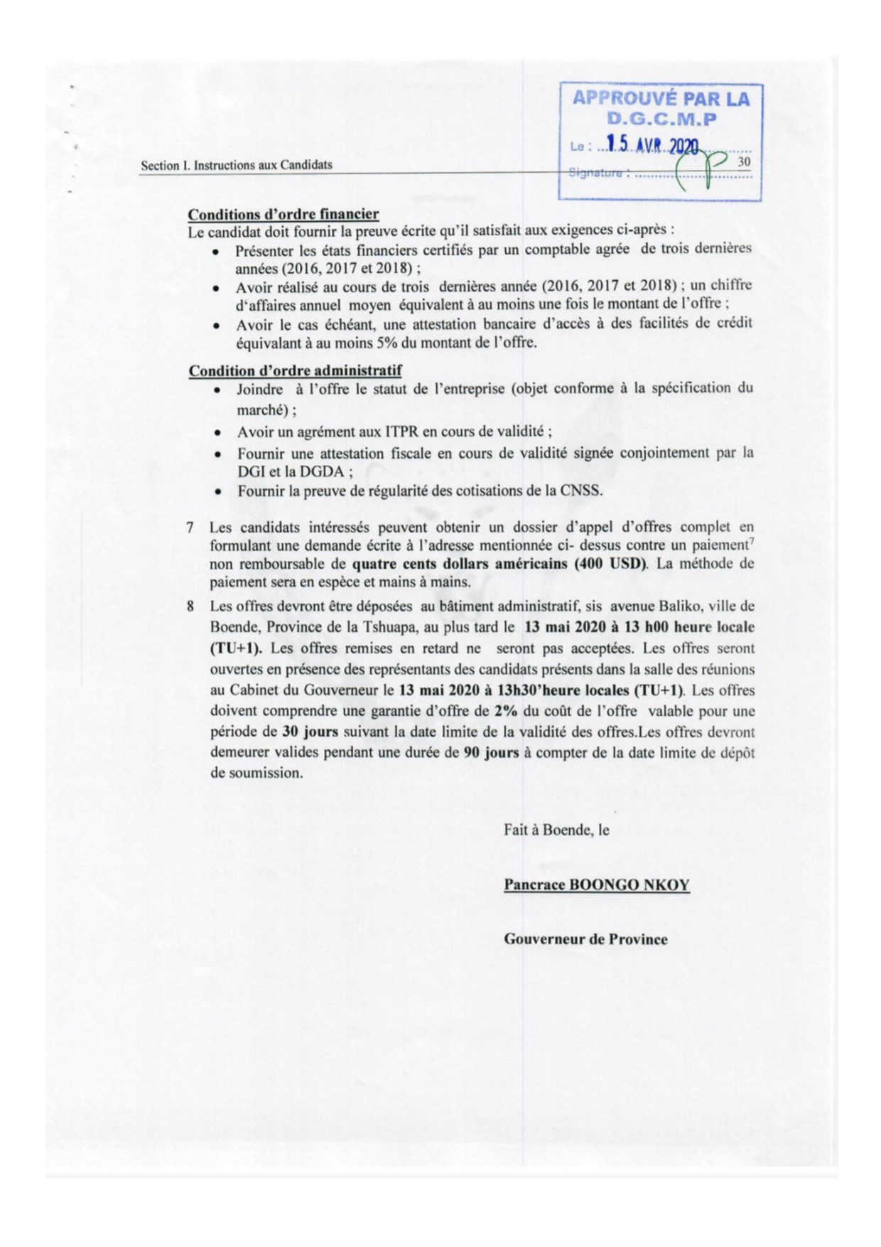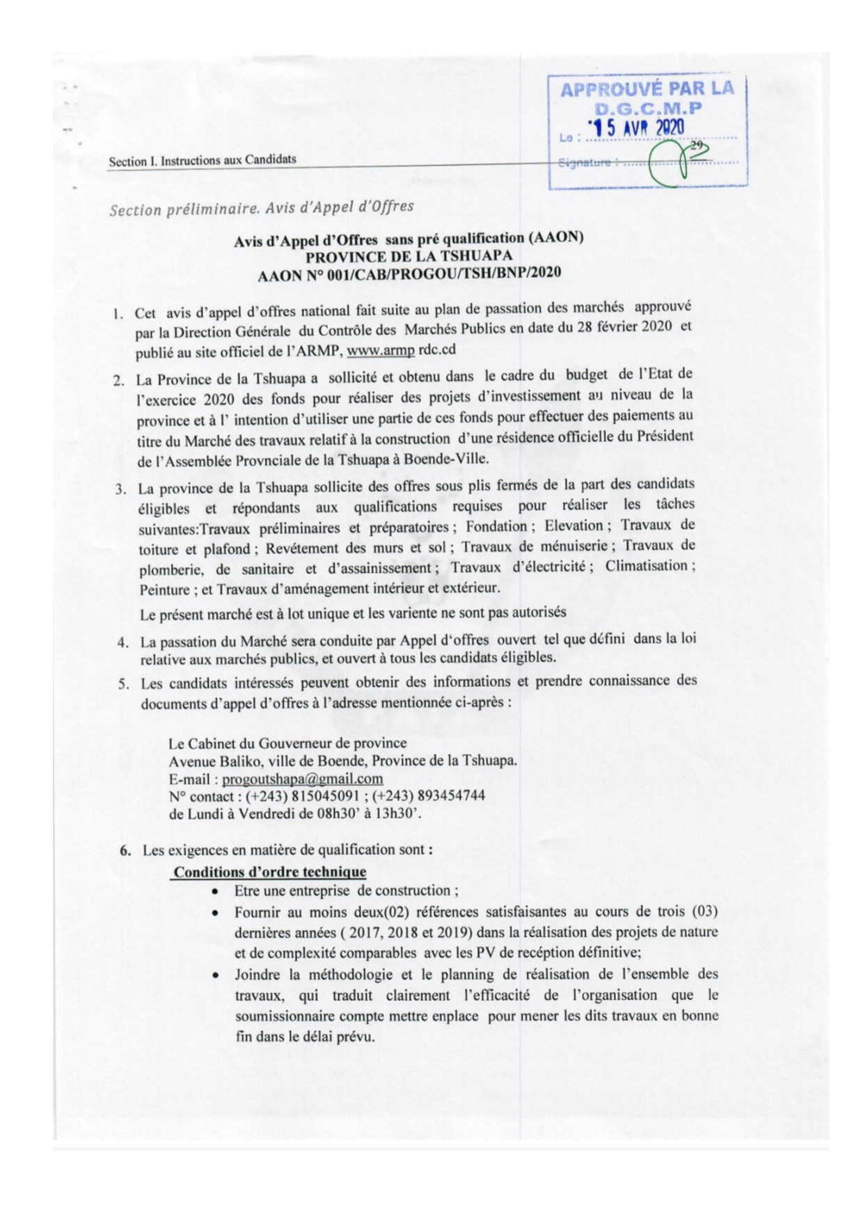 TRAVAUX DE CONSTRUCTION D’UNE RESIDENCE OFFICIELLE DU PRESIDENT DE L’ASSEMBLEE PROVINCIALE DE LA TSHUAPA A BOENDE-VILLE