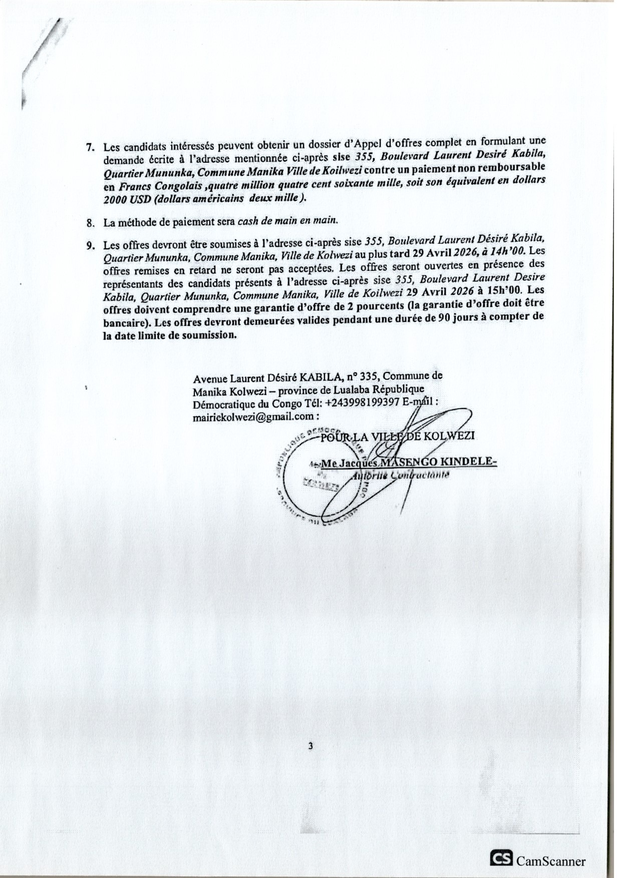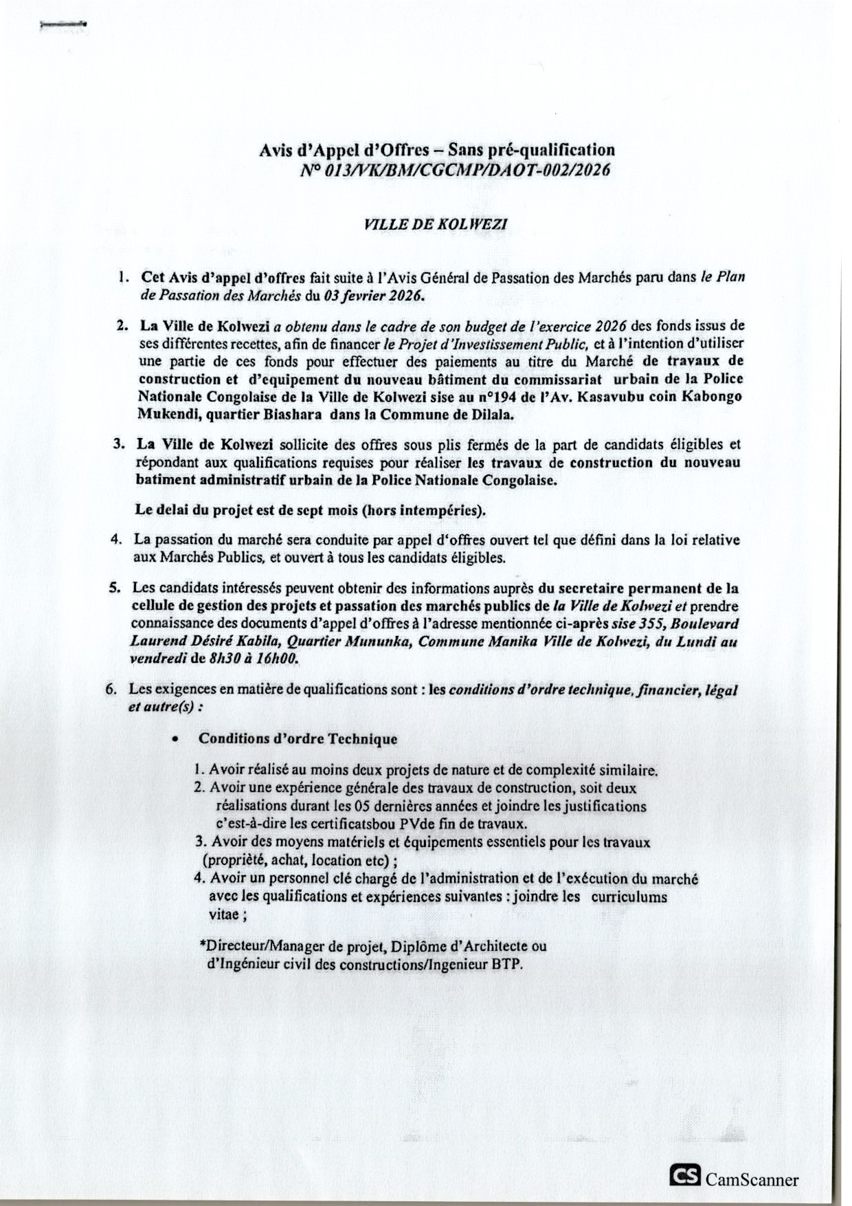 Travaux de construction et d’équipement du nouveau bâtiment du commissariat urbain de la Police Nationale Congolaise de la Ville de Kolwezi au n°194 de l’AV. Kasavubu coin Kabongo Mukendi, quartier Biashara dans la Commune de Dilala.