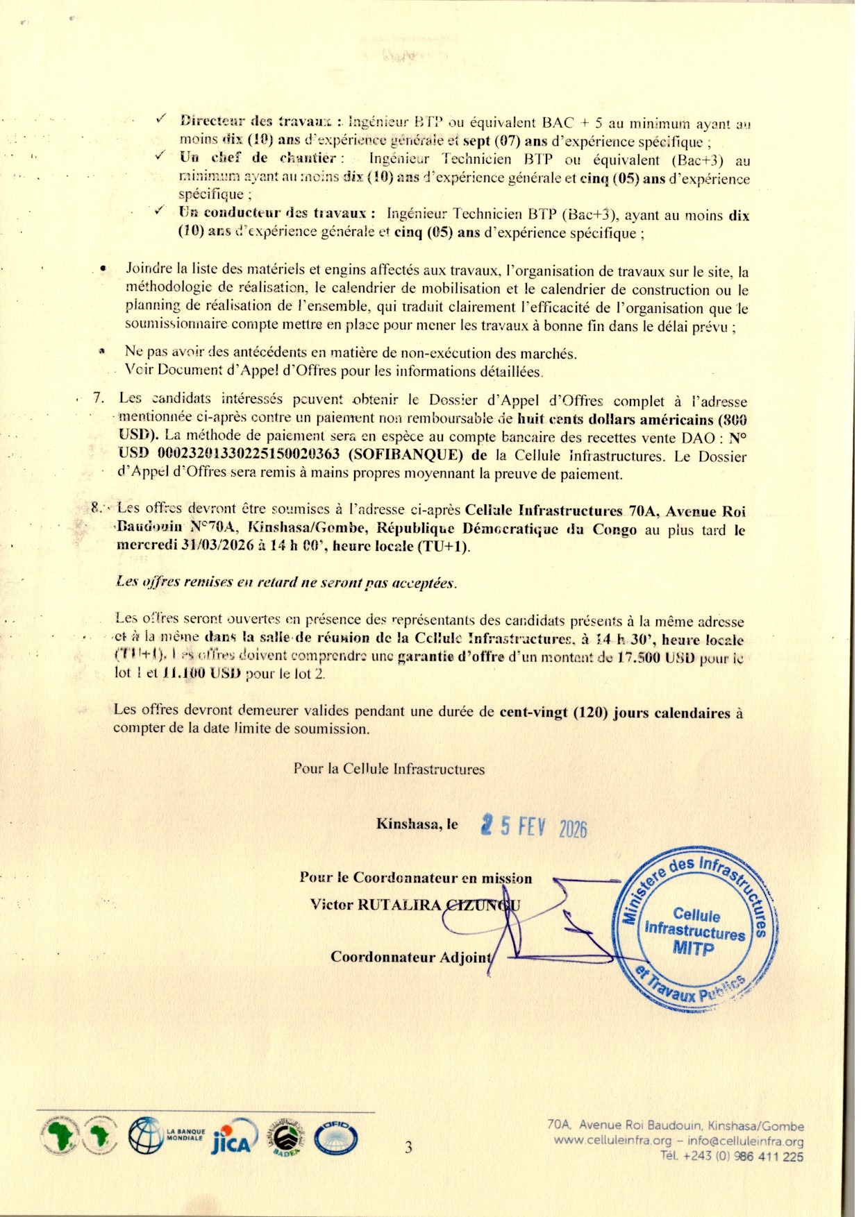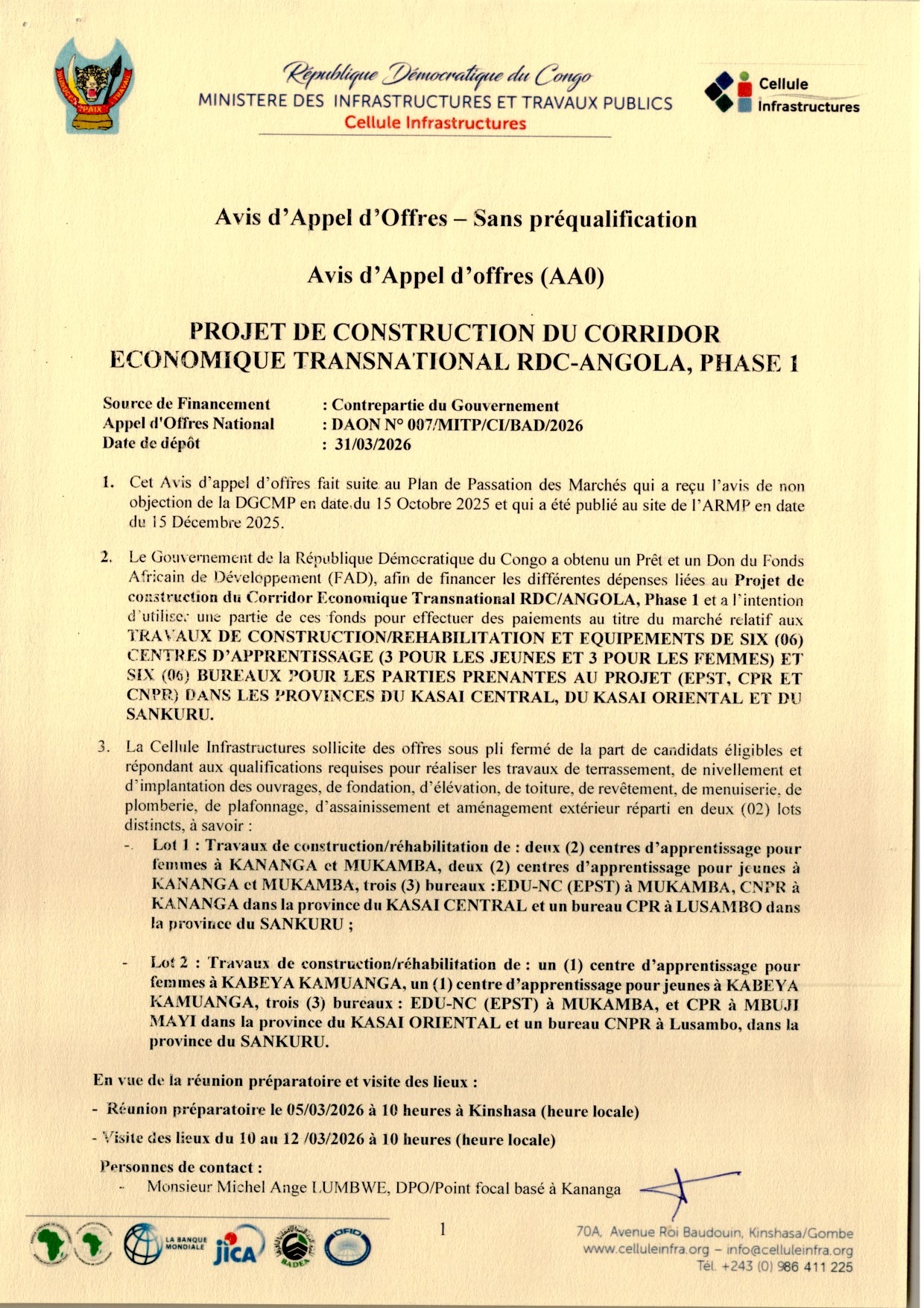 Travaux de construction / Réhabilitation et Équipements de Six (06) Centres d’apprentissage (3 pour les Jeunes et 3 pour les Femmes) et six (06) bureaux pour les parties prenantes au au projet (EPST, CPR et CNPR) dans les provinces du Kasai Central, du Kasai Oriental et du Sankuru.
