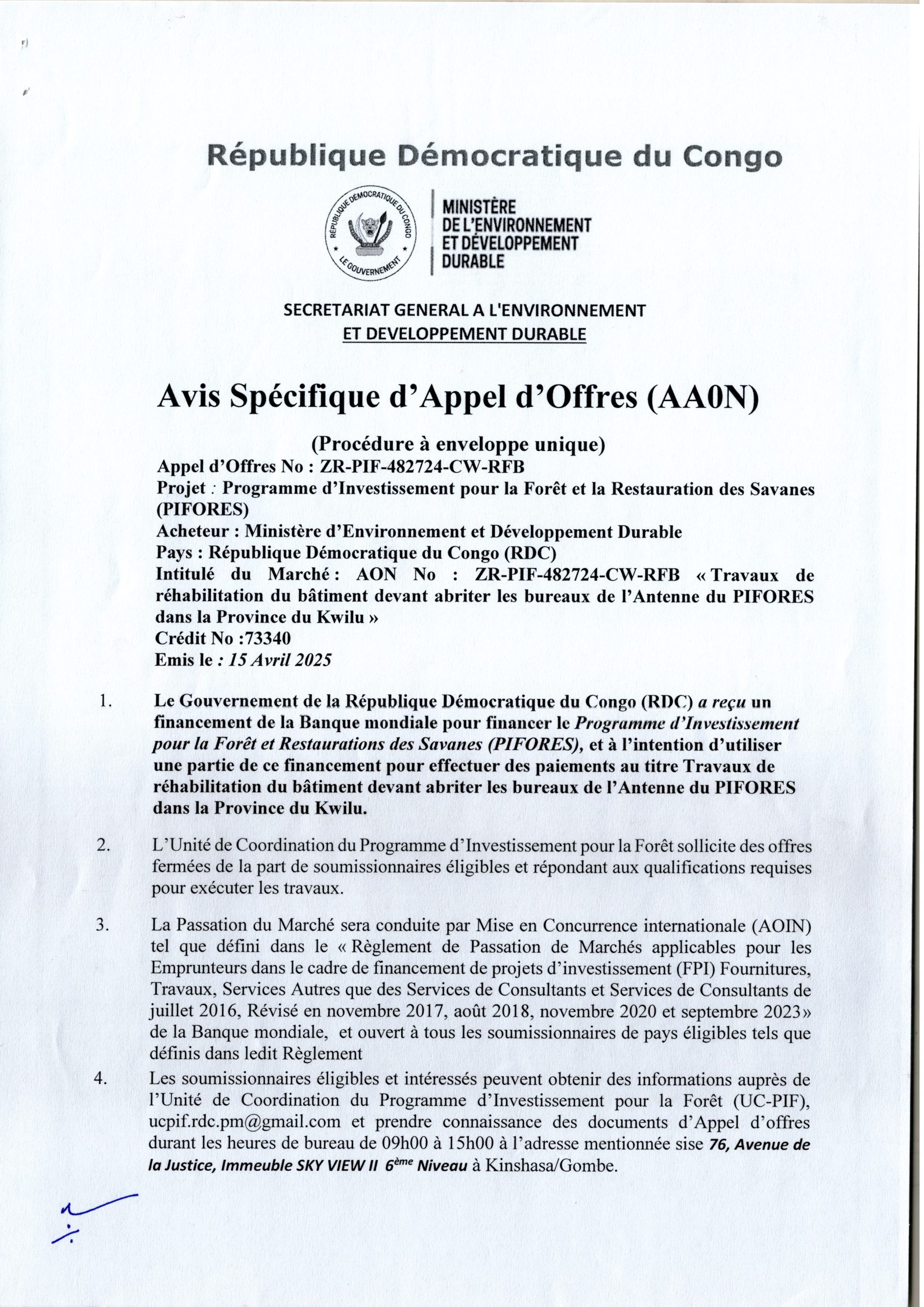 Travaux de réhabilitation du bâtiment devant abriter les bureaux de l’antenne du PIFORES dans la province du Kwilu