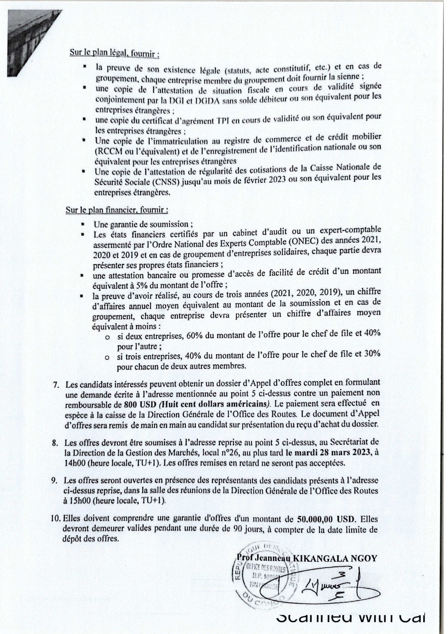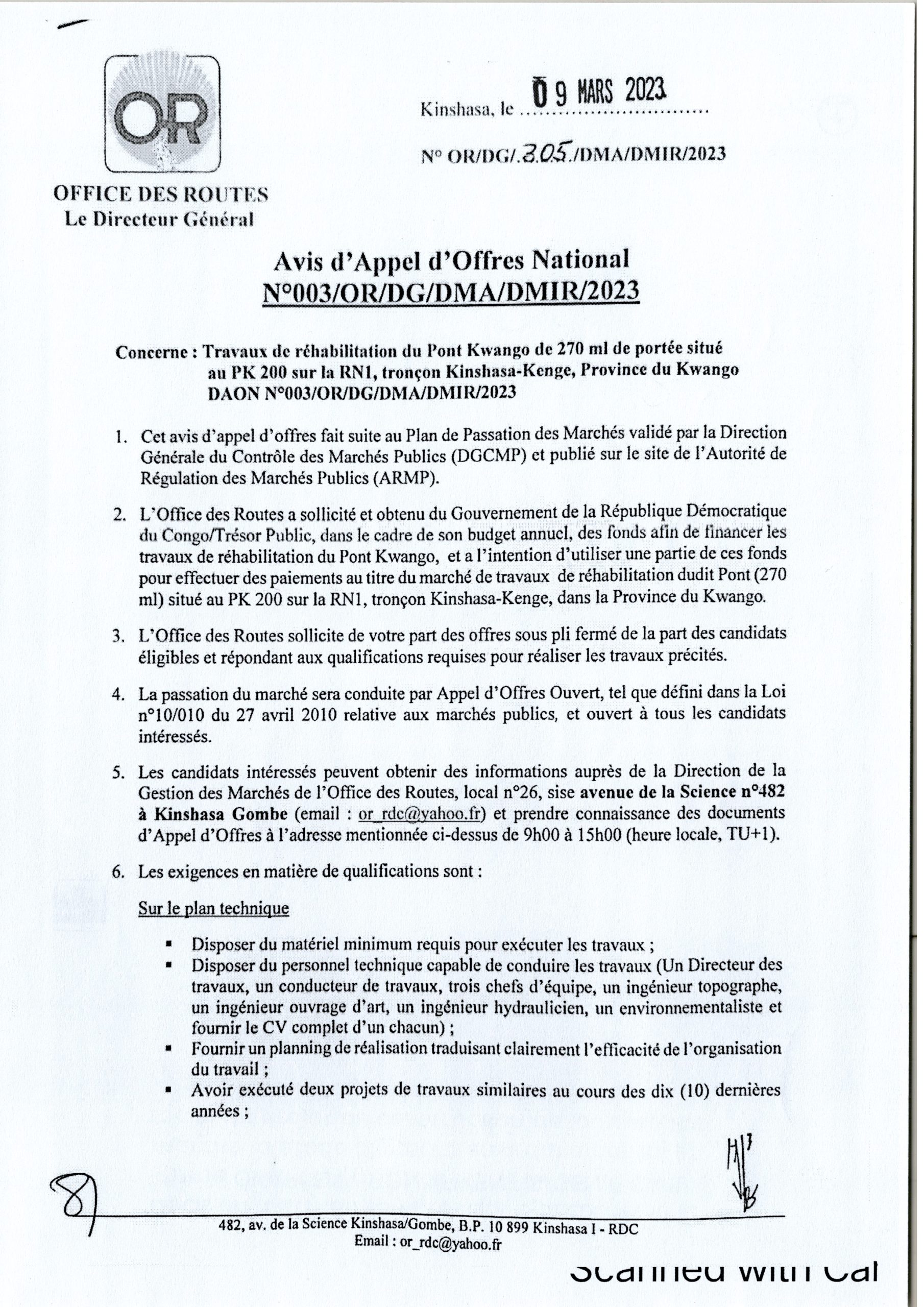 Travaux de réhabilitation du Pont Kwango de 270 ml de portée situé au PK 200 sur la RN1, Province du Kwango.